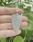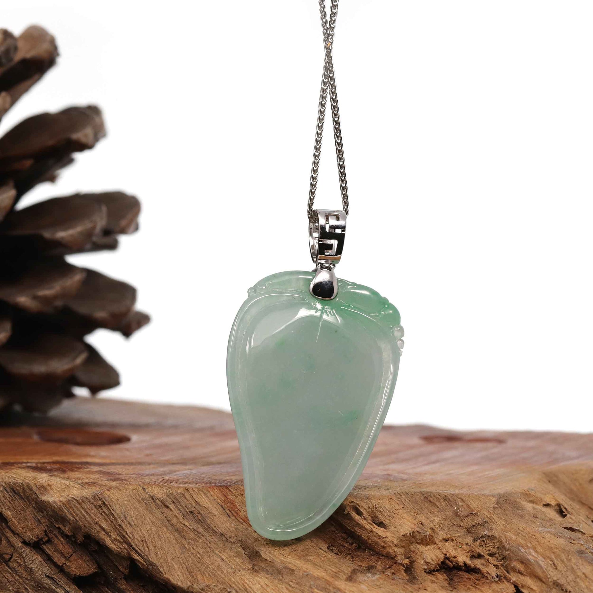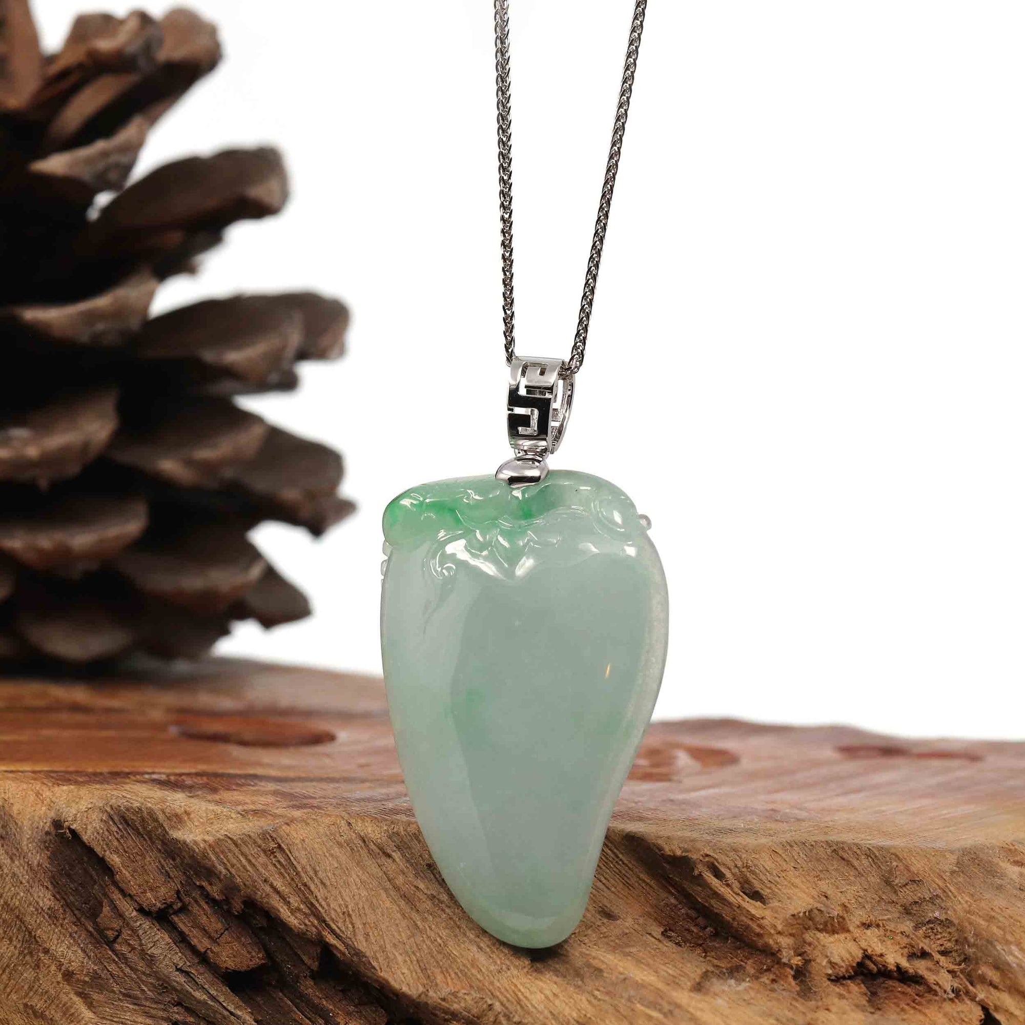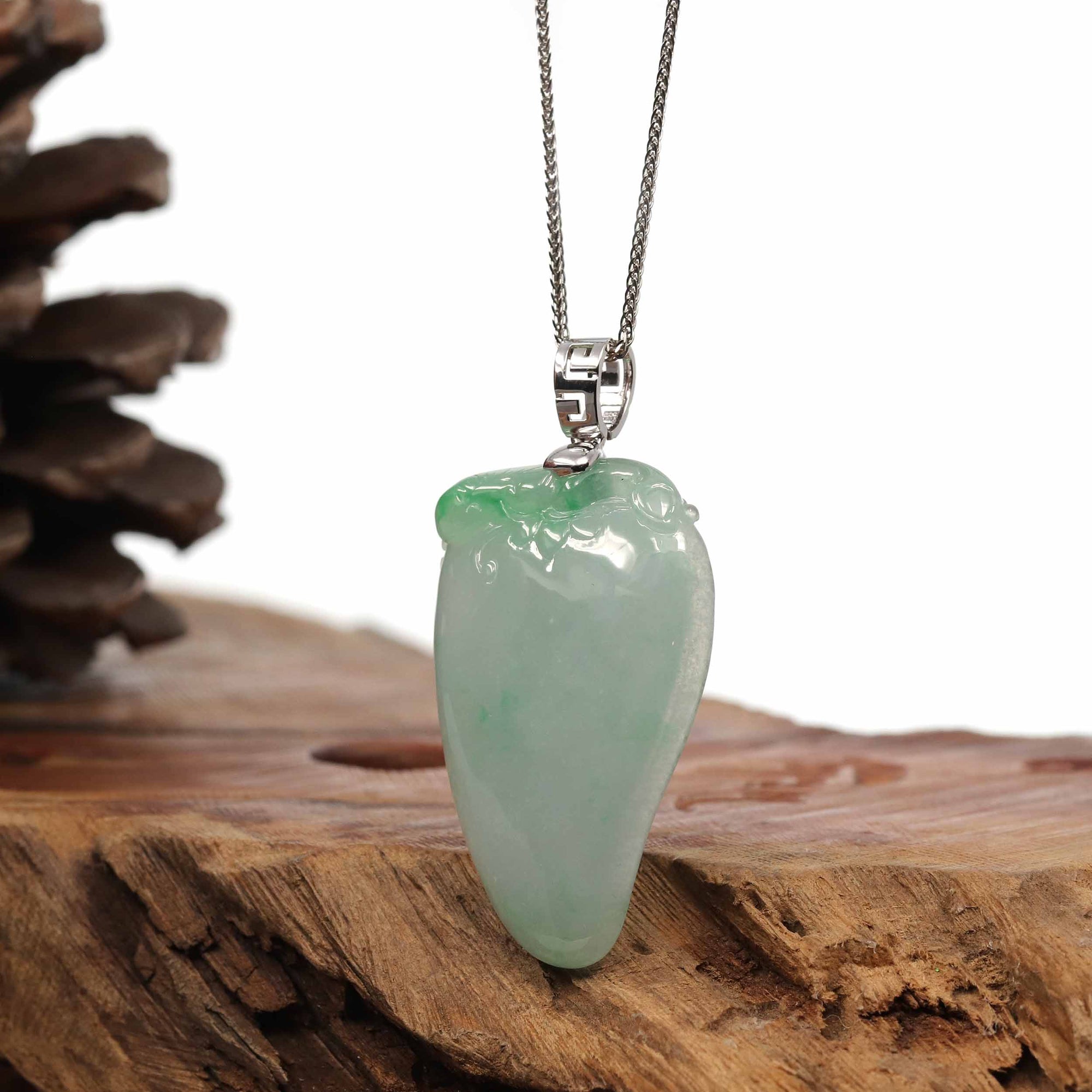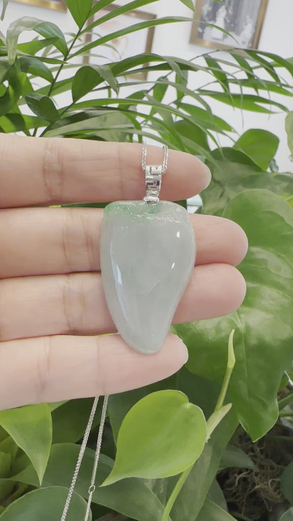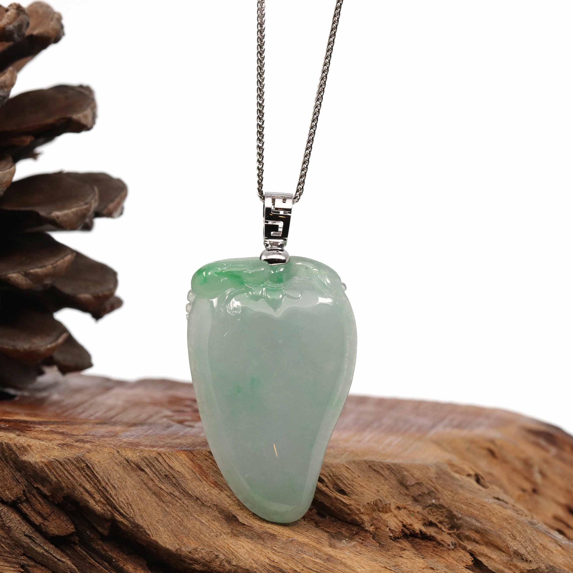 *Design concept--"Shou Tao" in Chinese literally means Longevity Peach. From Chinese folklore that in the Chinese mythical heaven, there is a peach tree garden where all the peaches are magical and add years to your life. This necklace portrays the timeless, good luck symbol in a light icy green jadeite jade with a patches of vibrant green. This piece is one of a kind, and you will not find another like it. It's worn as a good luck charm. Perfect for a gift for a friend or family.