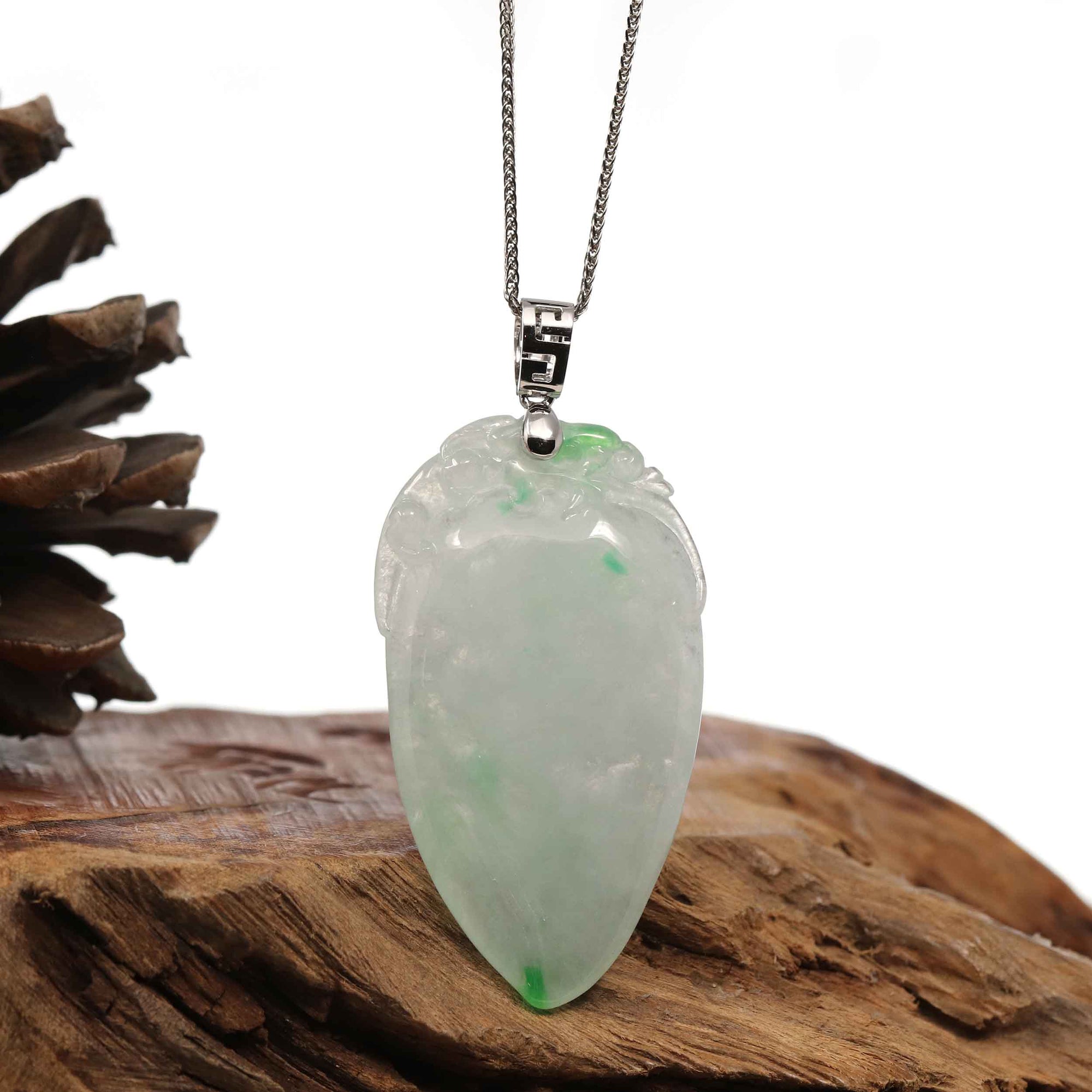 *Design concept--"Shou Tao" in Chinese literally means Longevity Peach. From Chinese folklore that in the Chinese mythical heaven, there is a peach tree garden where all the peaches are magical and add years to your life. This necklace portrays the timeless, good luck symbol in natural ice jadeite jade. This piece is one of a kind, and you will not find another like it. It's worn as a good luck charm. Perfect for a gift for a friend or family.