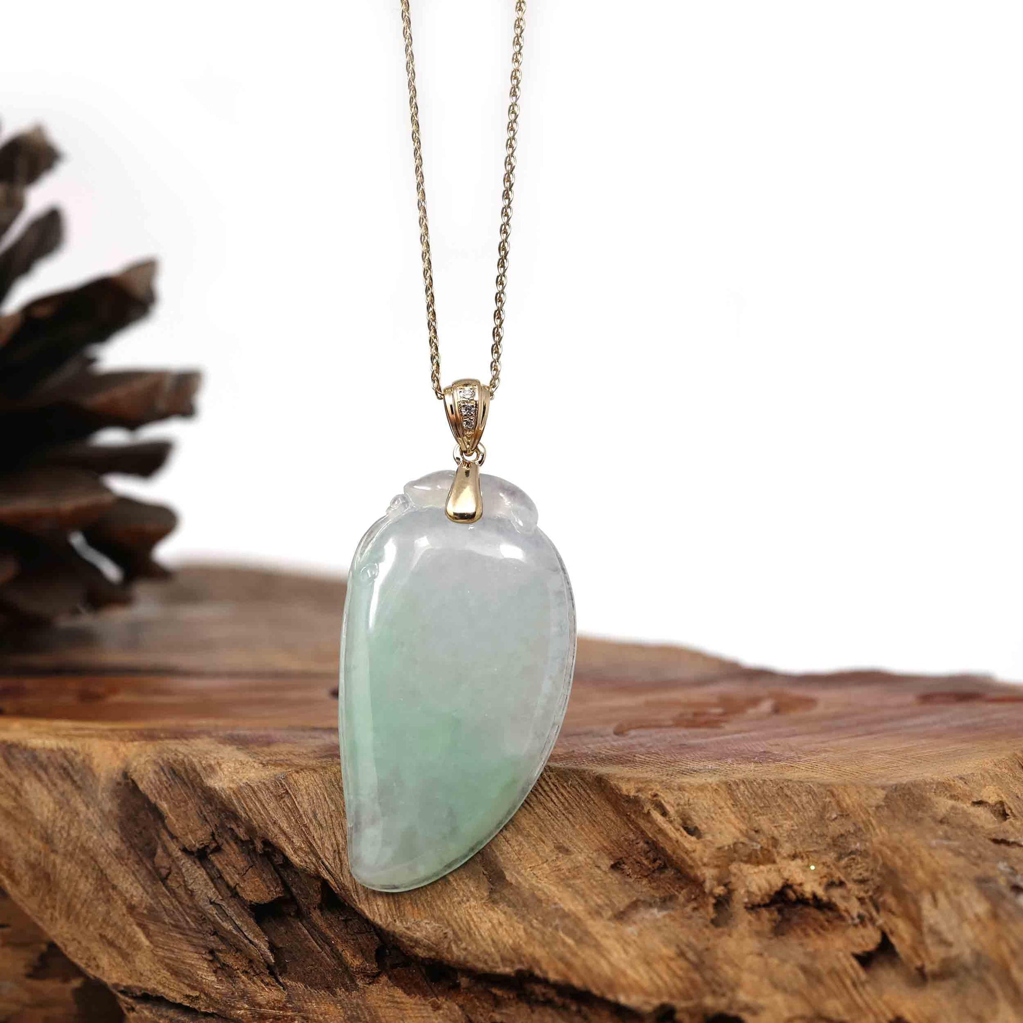 *Design concept--"Shou Tao" in Chinese literally means Longevity Peach. From Chinese folklore that in the Chinese mythical heaven, there is a peach tree garden where all the peaches are magical and add years to your life. This necklace portrays the timeless, good luck symbol in natural icy green jadeite jade. The texture is so smooth and semi-translucent with no natural lines or cloudy spots. The pendant is finished with a 14k solid yellow gold bail dazzled with diamonds. This piece is one of a kind, and you will not find another like it. It's worn as a good luck charm. Perfect for a gift for a friend or family.
