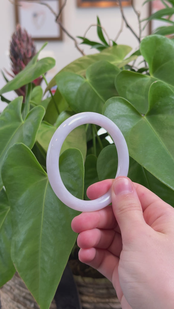 * DETAILS---This stunning jade bangle is crafted from fine Burmese jadeite in a soft lavender hue. Its smooth texture and timeless elegance make it truly eye-catching. The traditional round shape is a favorite for many, offering a classic and graceful look. With its petite design and gentle color, this bangle is more than just fine jewelry — it’s a meaningful gift, perfect for yourself or someone special.