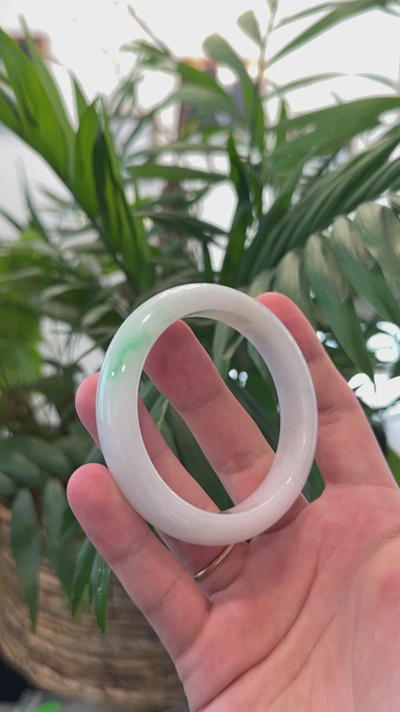 * DETAILS--- This bangle is made with genuine Burmese Jadeite jade, The jade texture is smooth and clean. With a patch of apple green color. This color is considered a "Moss in Snow' classic color found in jade. The bangle is a classic half-round "comfort fit" bangle. The whole bangle is very clean with some natural lines. it looks completely beautiful and affordable. It's a unique gift for yourself or your love. Known for its durability, jadeite is also believed to bring good luck. This bangle makes a thoughtful and meaningful gift for yourself or someone special.