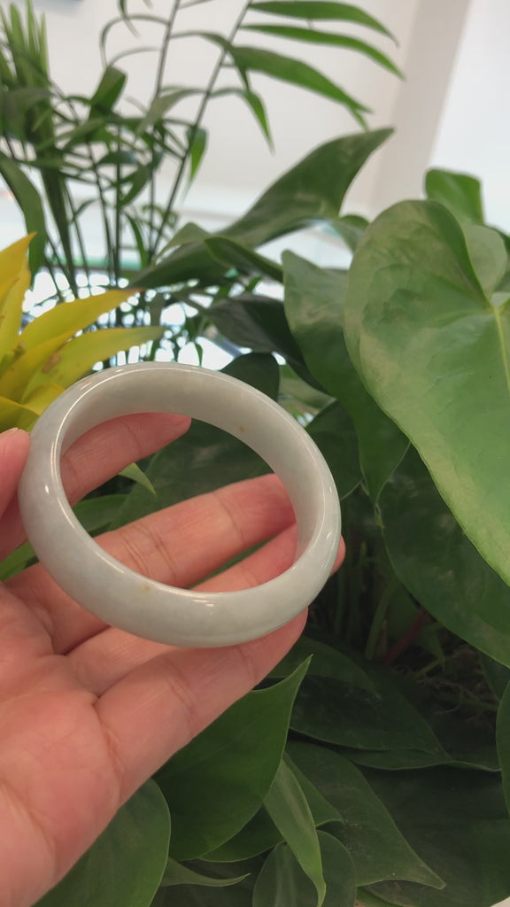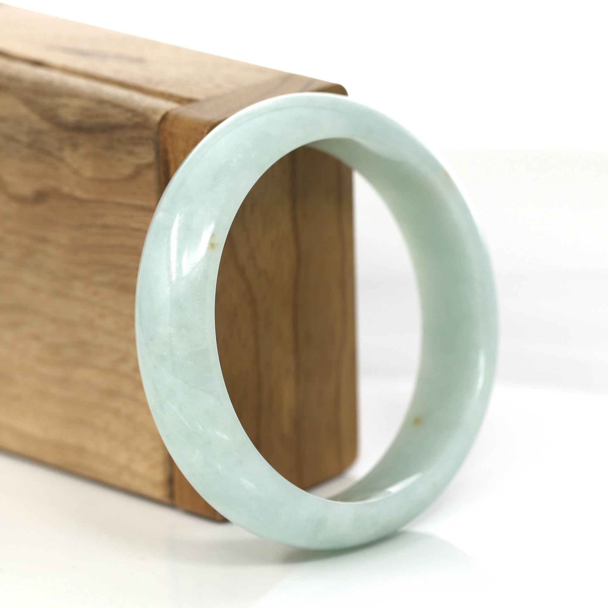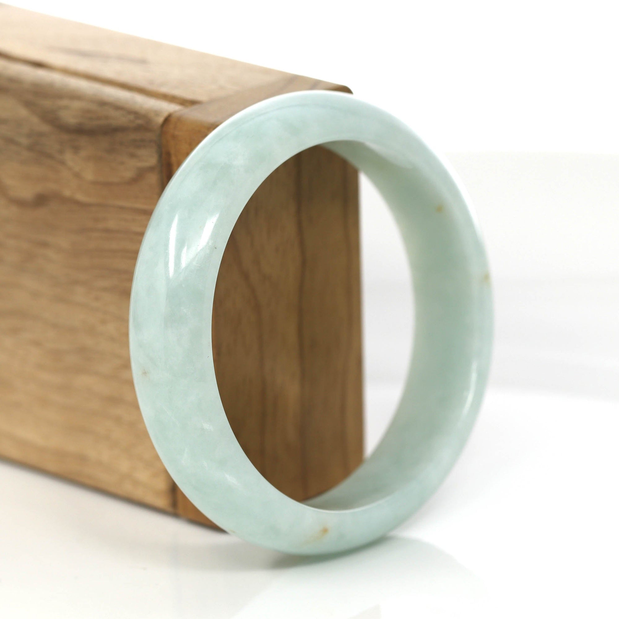 * DETAILS--- This bangle is made with Burmese jadeite jade. The jade texture is smooth with a little clouds. Looks clear with light green color and yellow spots. It's an princess half round comfit style. You know the genuine jade bangle is always meaningful for someone.  It's a very unique gift for yourself and your love.
