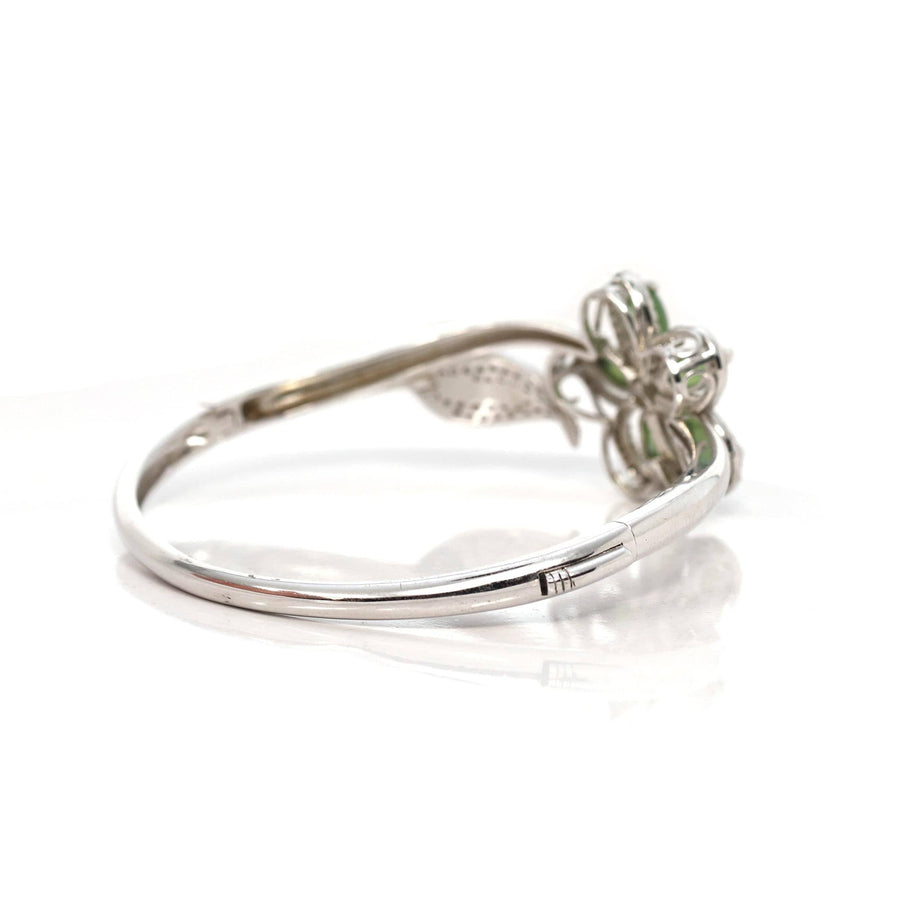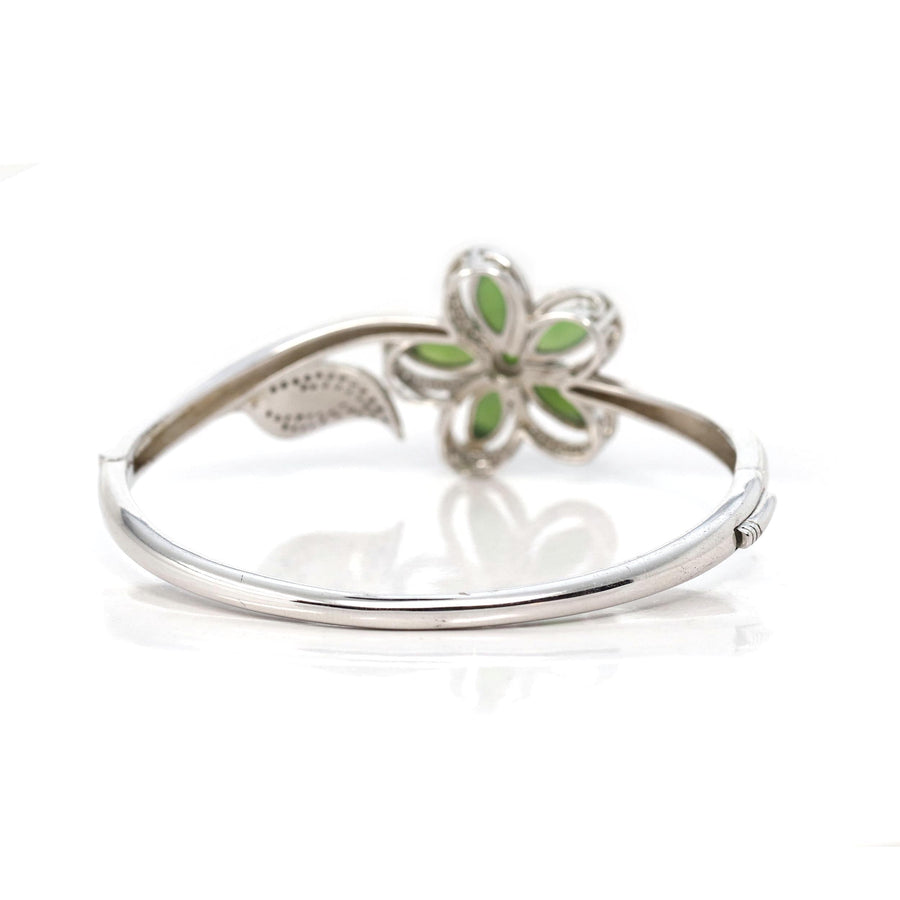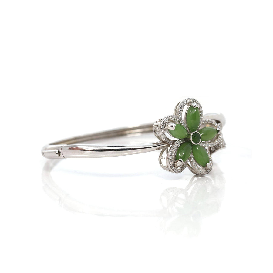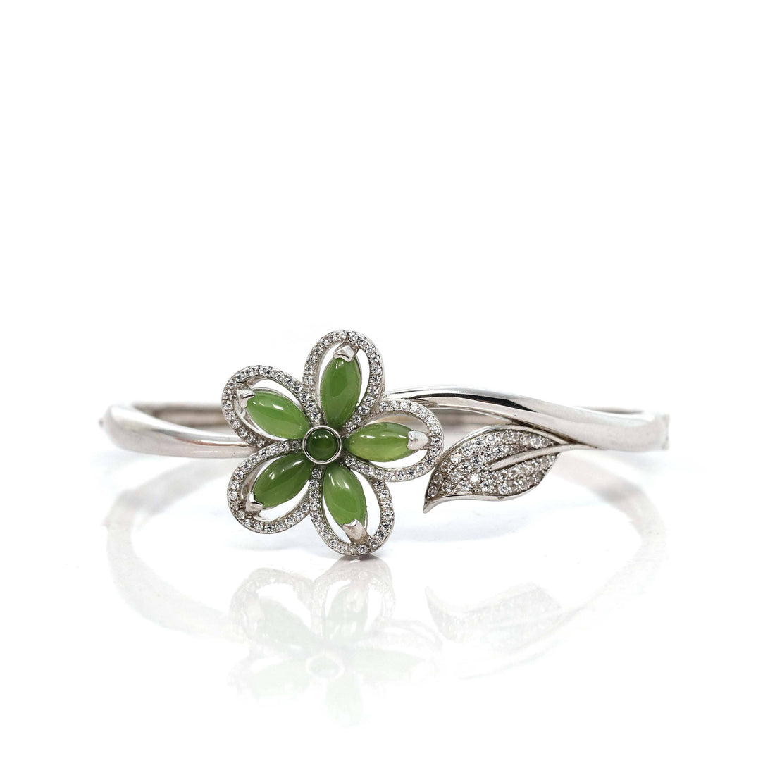 * INTRODUCTION-- Genuine Nephrite Green Jade Marquise Bracelet Bangles. The bracelet designed in a flower style with a leaf. Every detail and angle are so perfect. It's an expression like bless your all and love to your all. This bangle made with high-quality genuine nephrite green jade & CZ. The jade looks so clean and smooth. The bracelet looks are so exquisite. People always believe genuine jade is lucky jade. It's a perfect gift for your love.