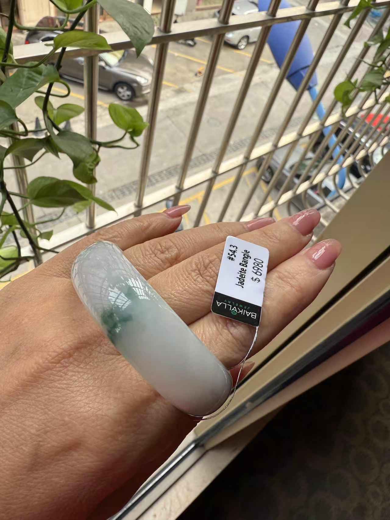 Natural Light Icy White Blue Green Flower Wide Jadeite Jade Bangle #54.3