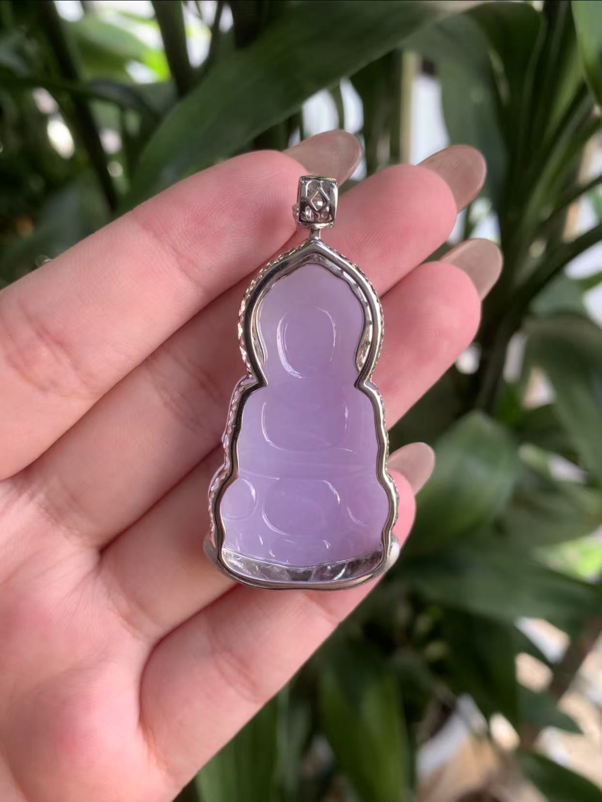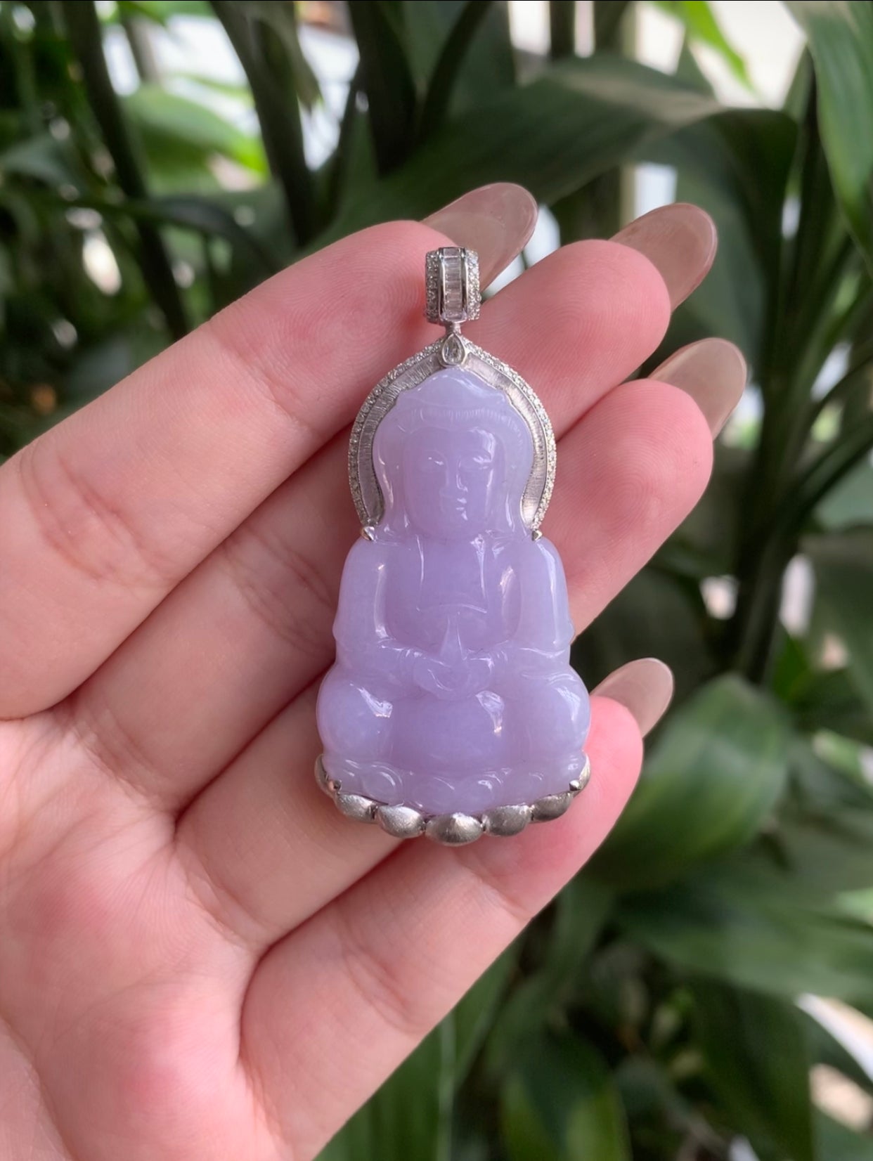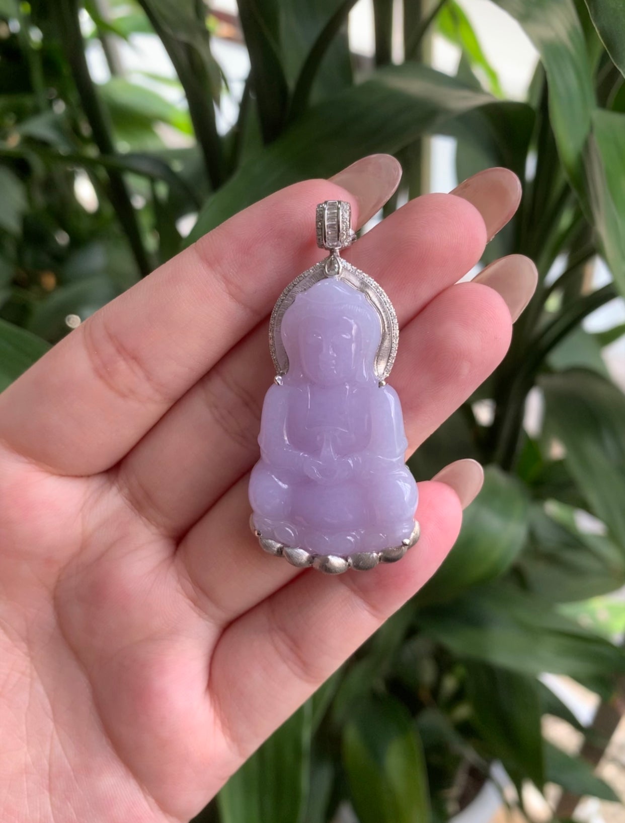 "Live" 18kw Gold Natural Lavender Jadeite Jade Guan Yin Pendant W/ Natural Diamonds" (07/01/25)