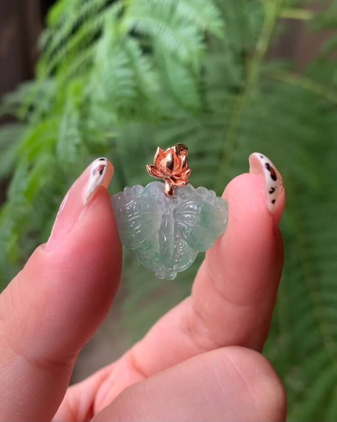 "Live" 18k Two Tone Butter Fly Theme Design Natural Unique Forest Green Jadeite Jade Pendant (07/16/25)
