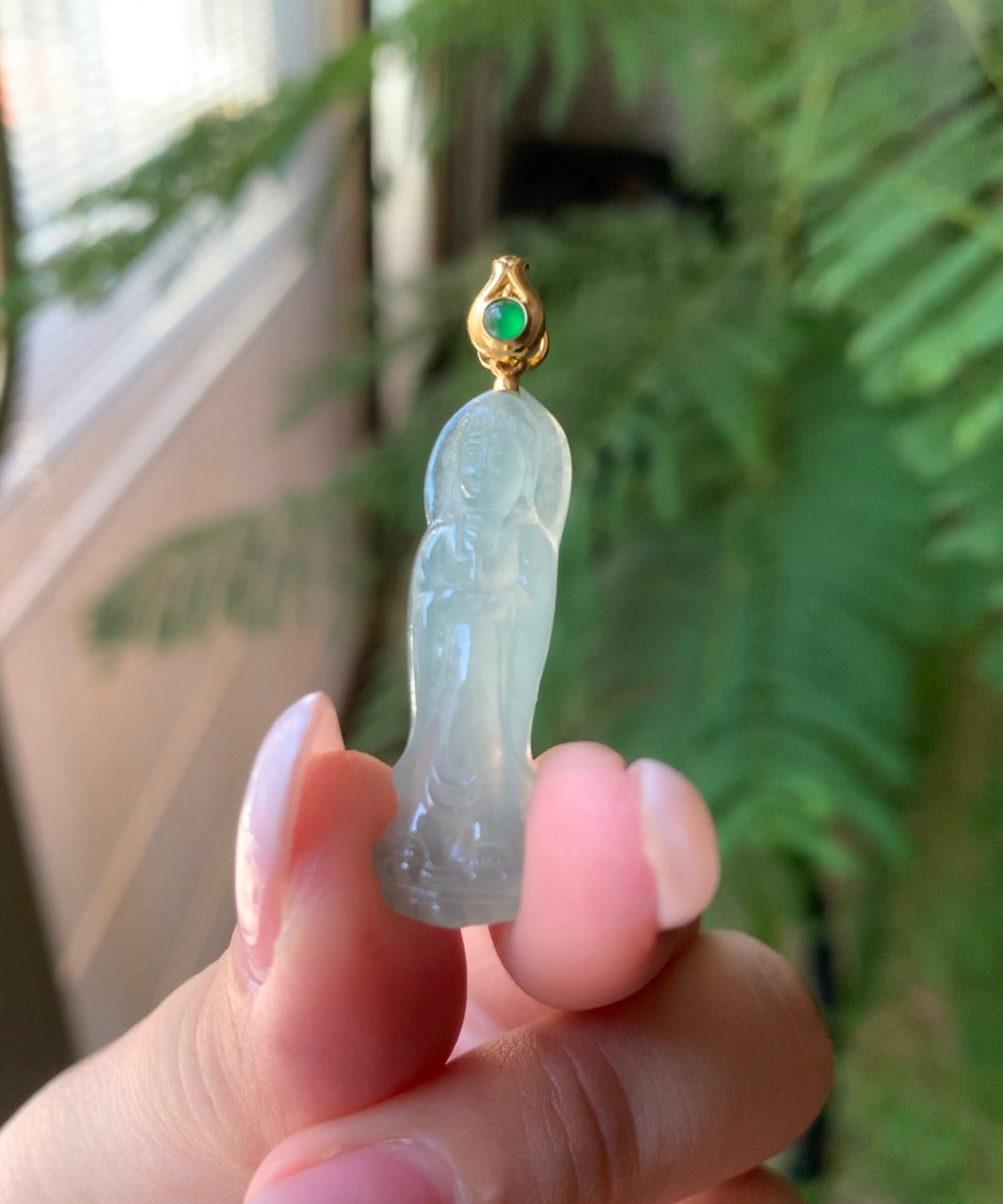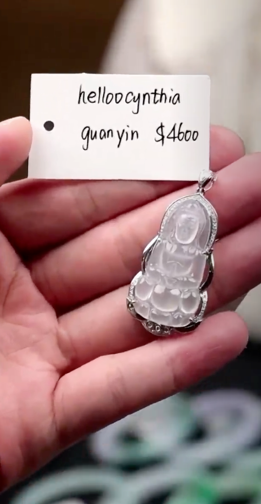 "Live" 18kw Fancy Setting Natural High Icy Jadeite Jade Guan Yin Pendant w/ Natural Diamonds"(08/05/25)