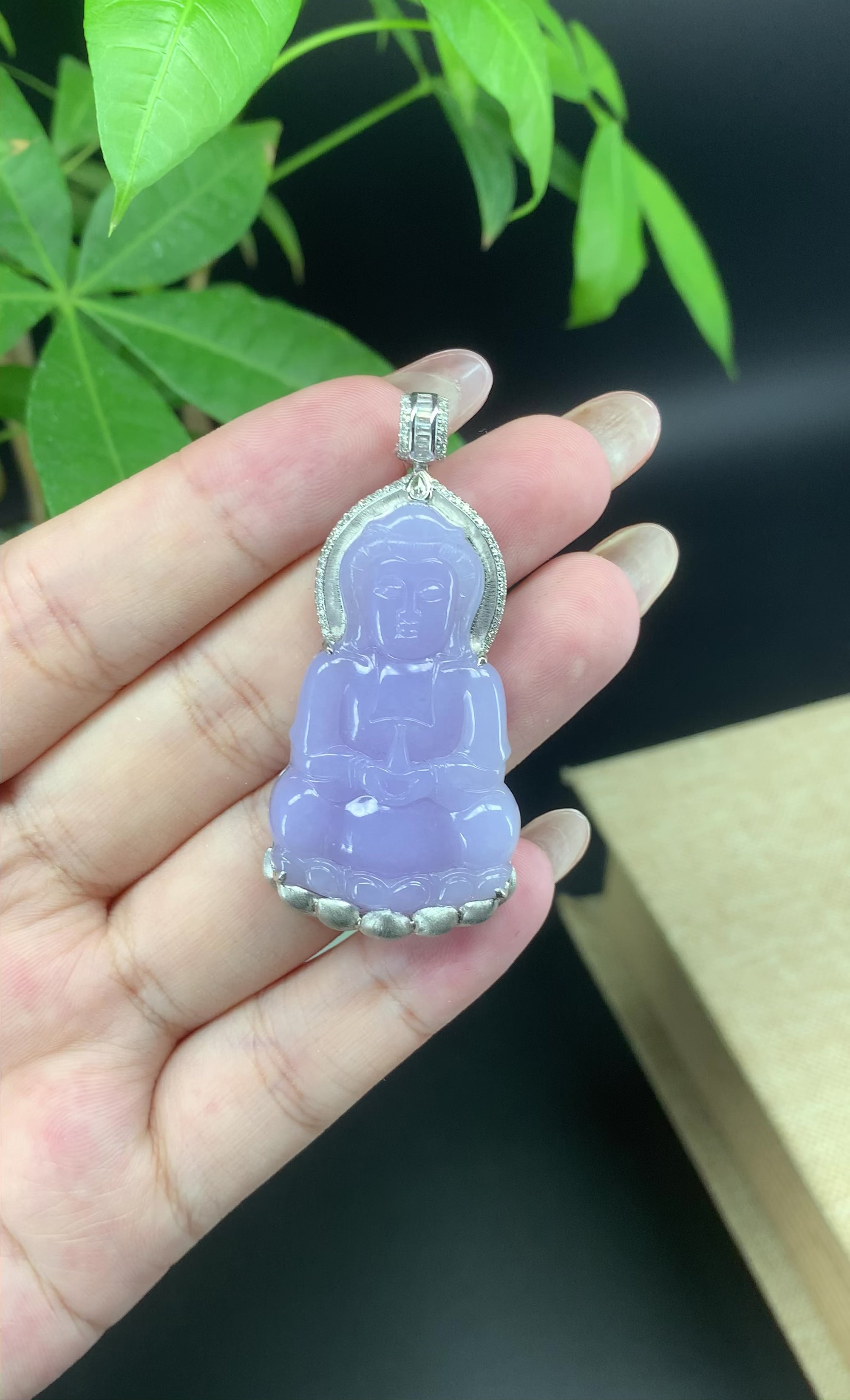 18K White Gold High-End Imperial Jadeite Jade Buddha Necklace with Diamonds