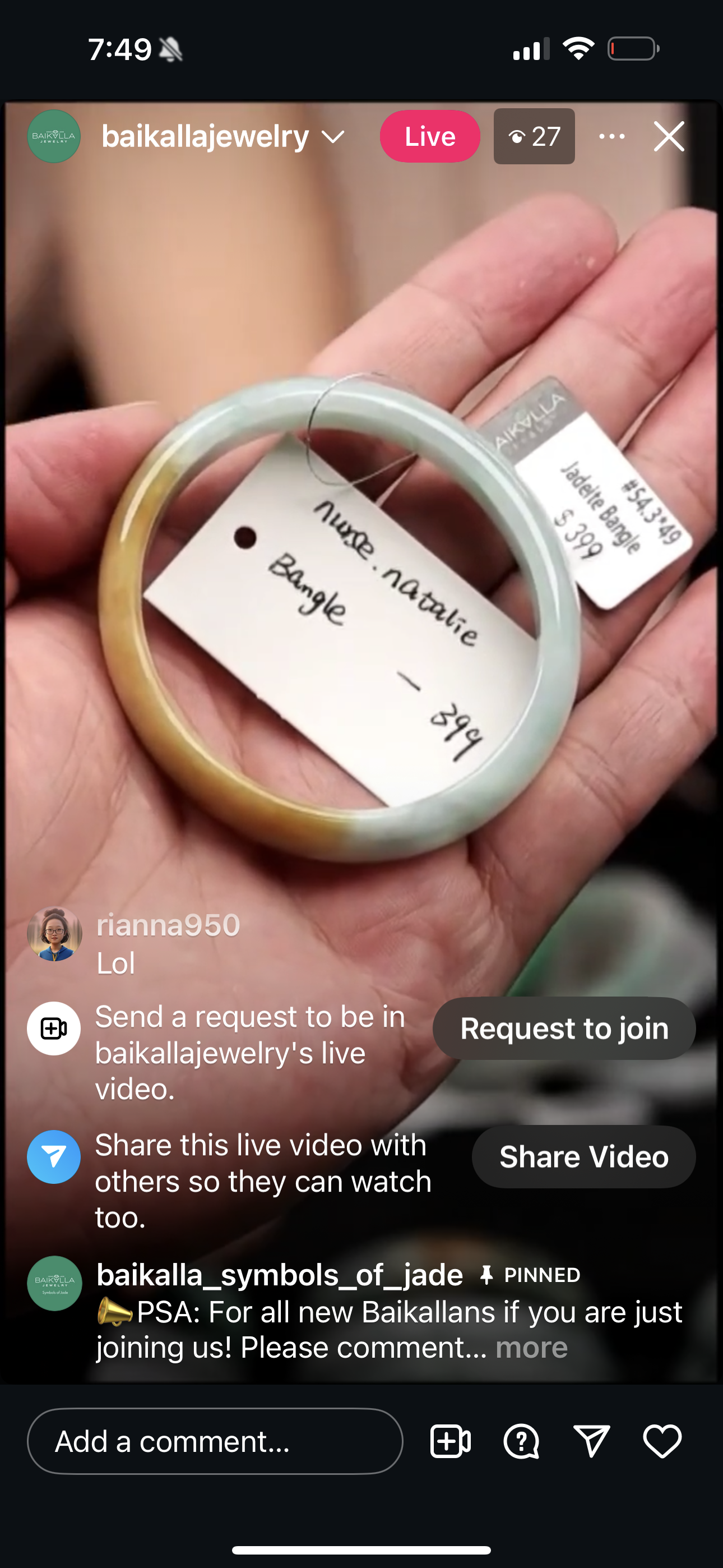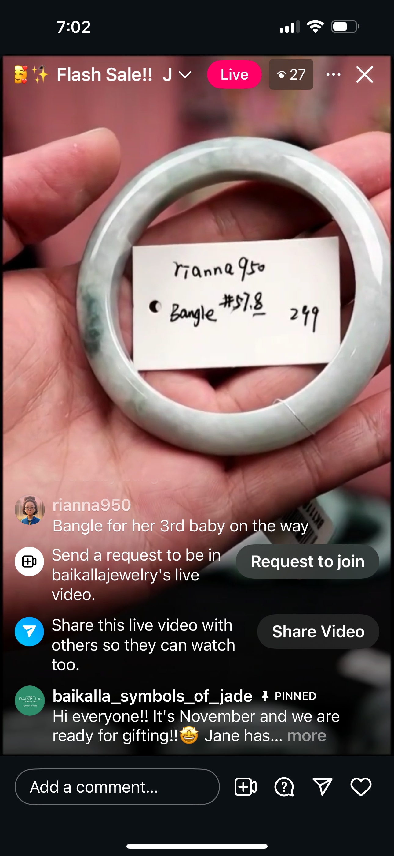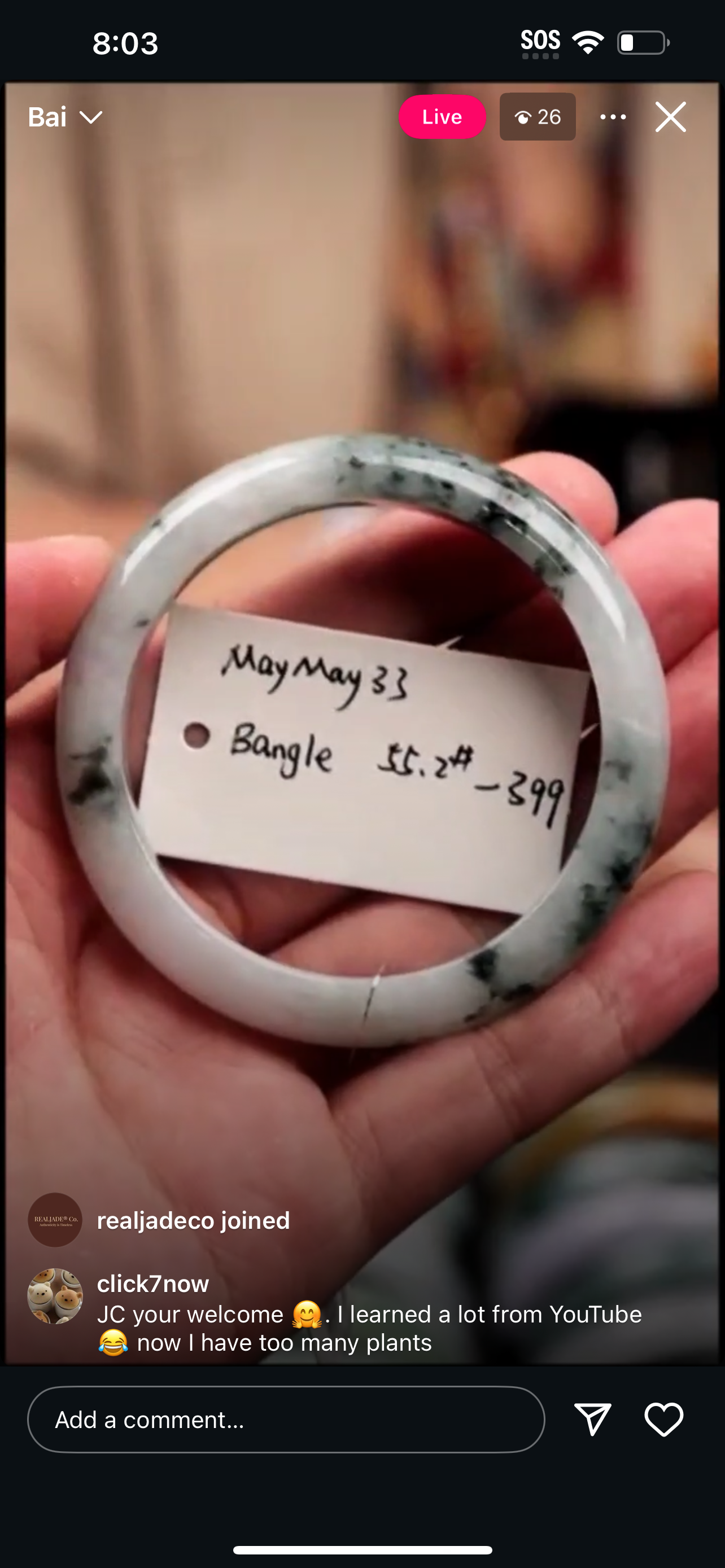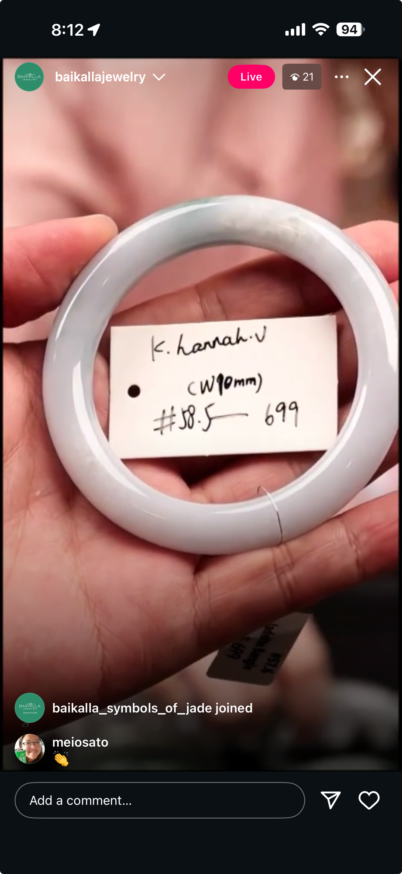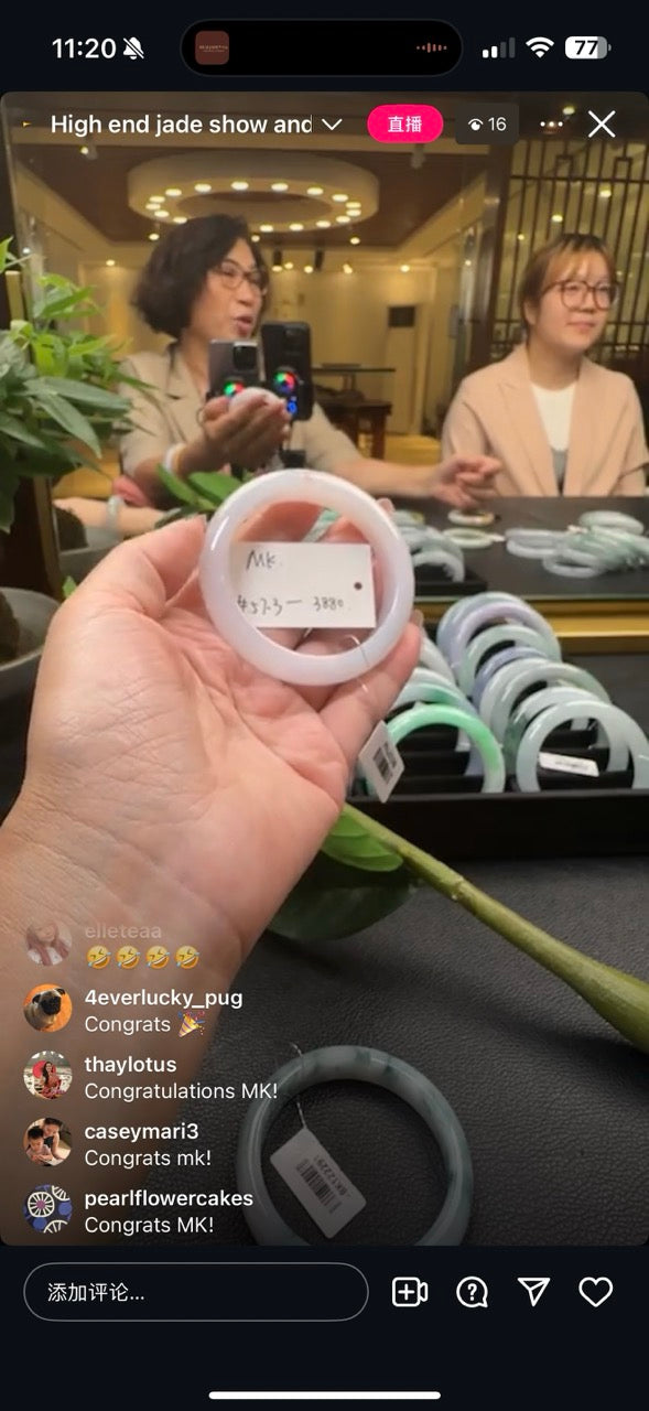"Live" Baikalla Icy White W/ Green Flower Half-Round Jadeite Jade Bangle (11/03/25)