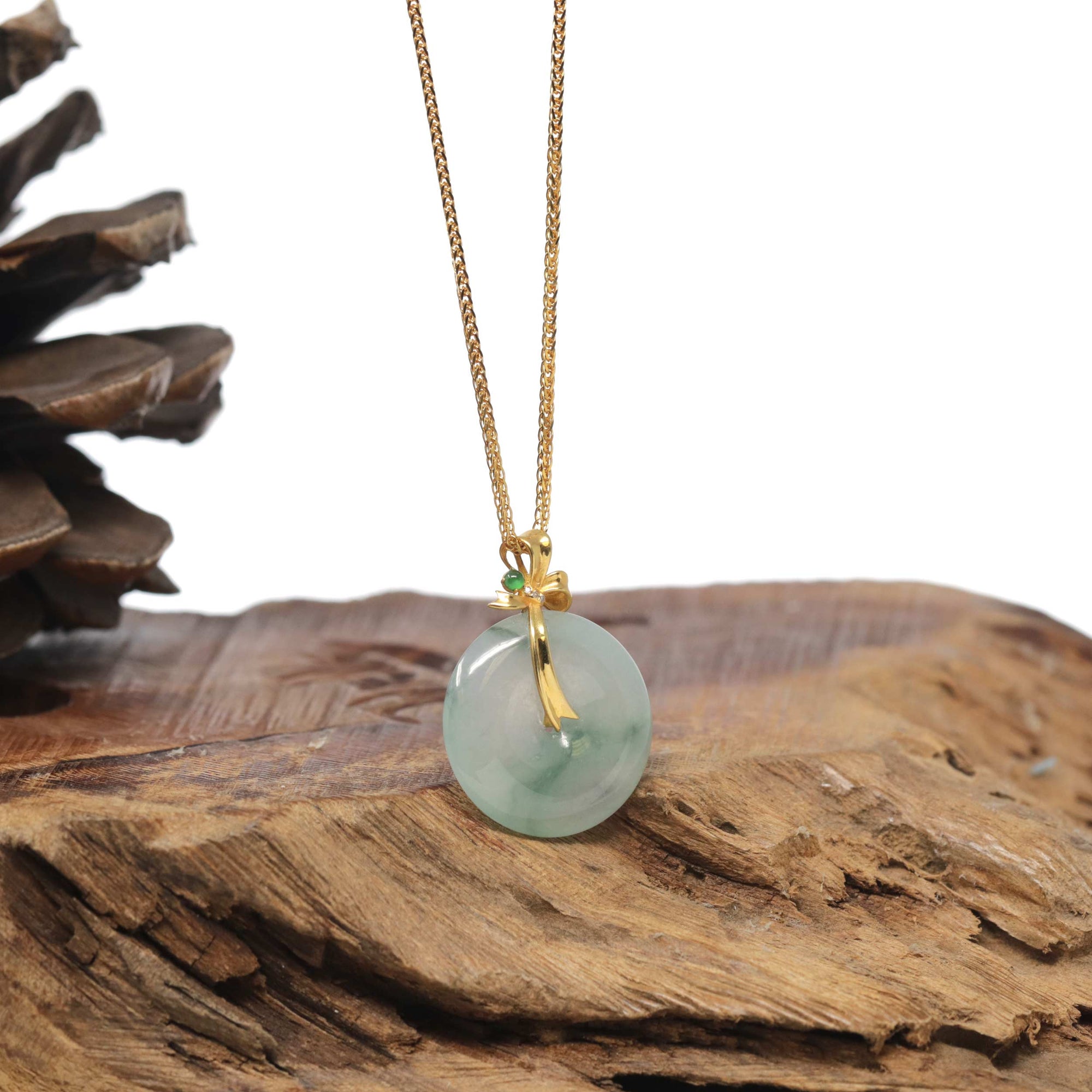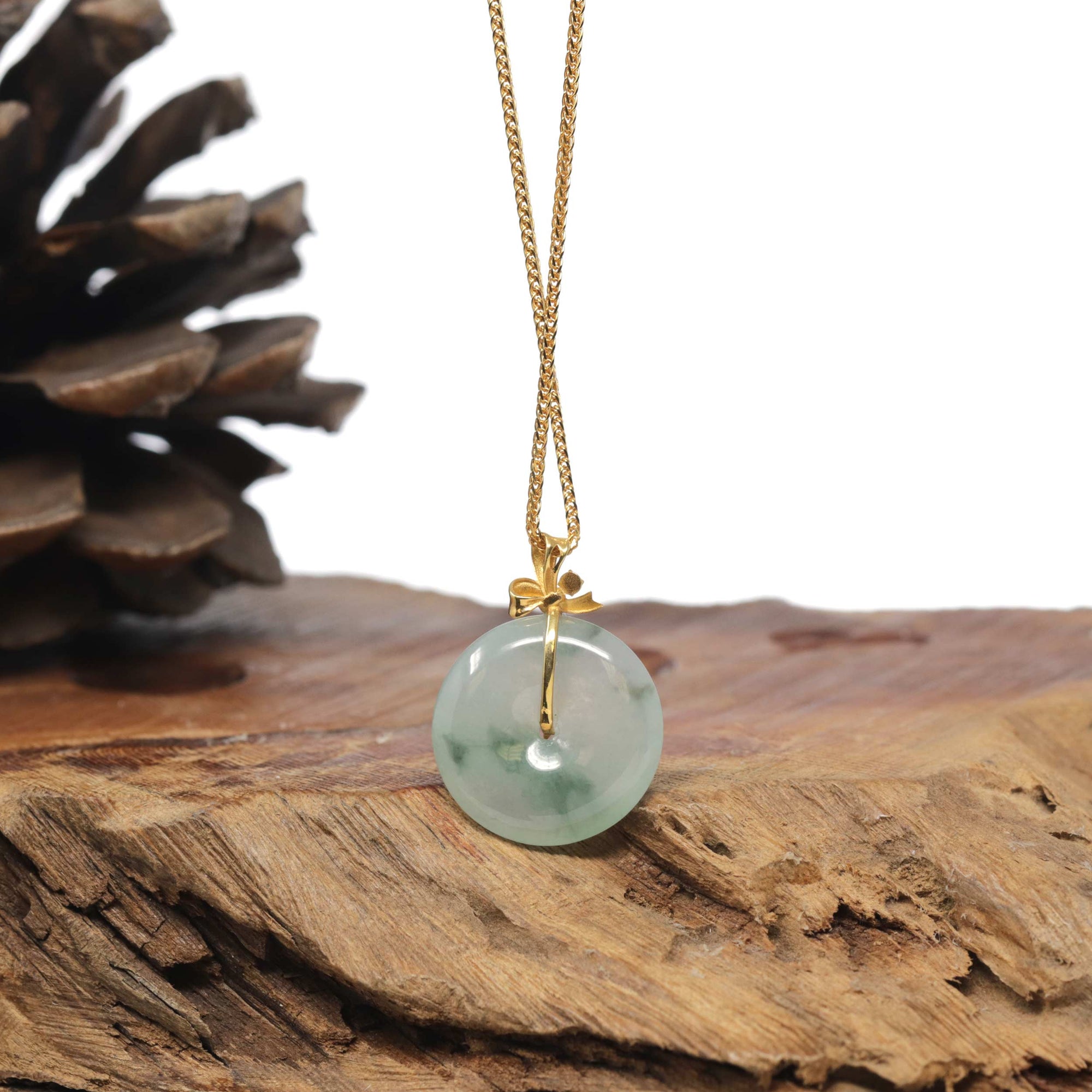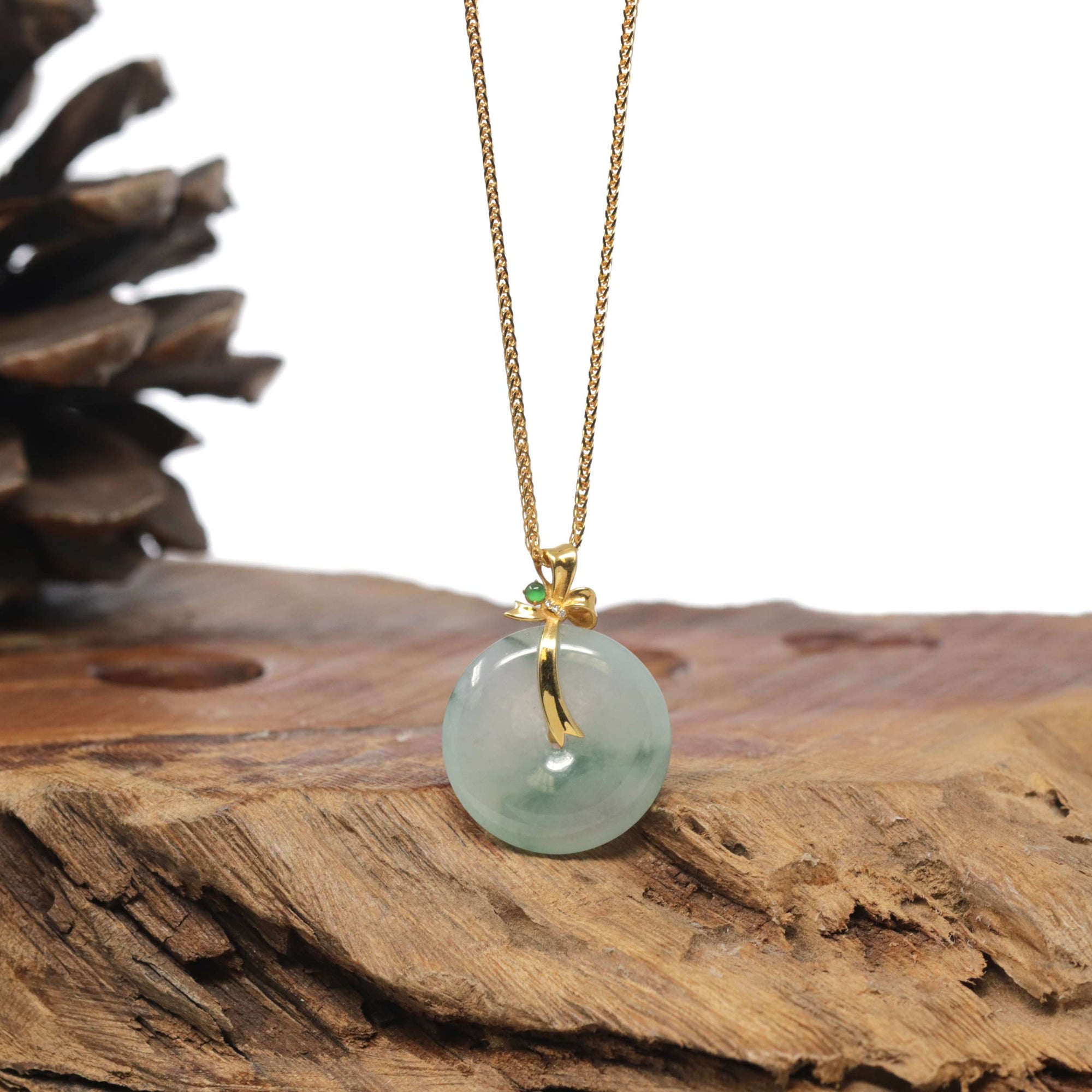 Baikalla 18K Yellow Gold "Ping An Kou" (Good Luck Button) Natural Icy Light Blue-Green Flower Jadeite Jade Pendant W/ Natural Diamonds