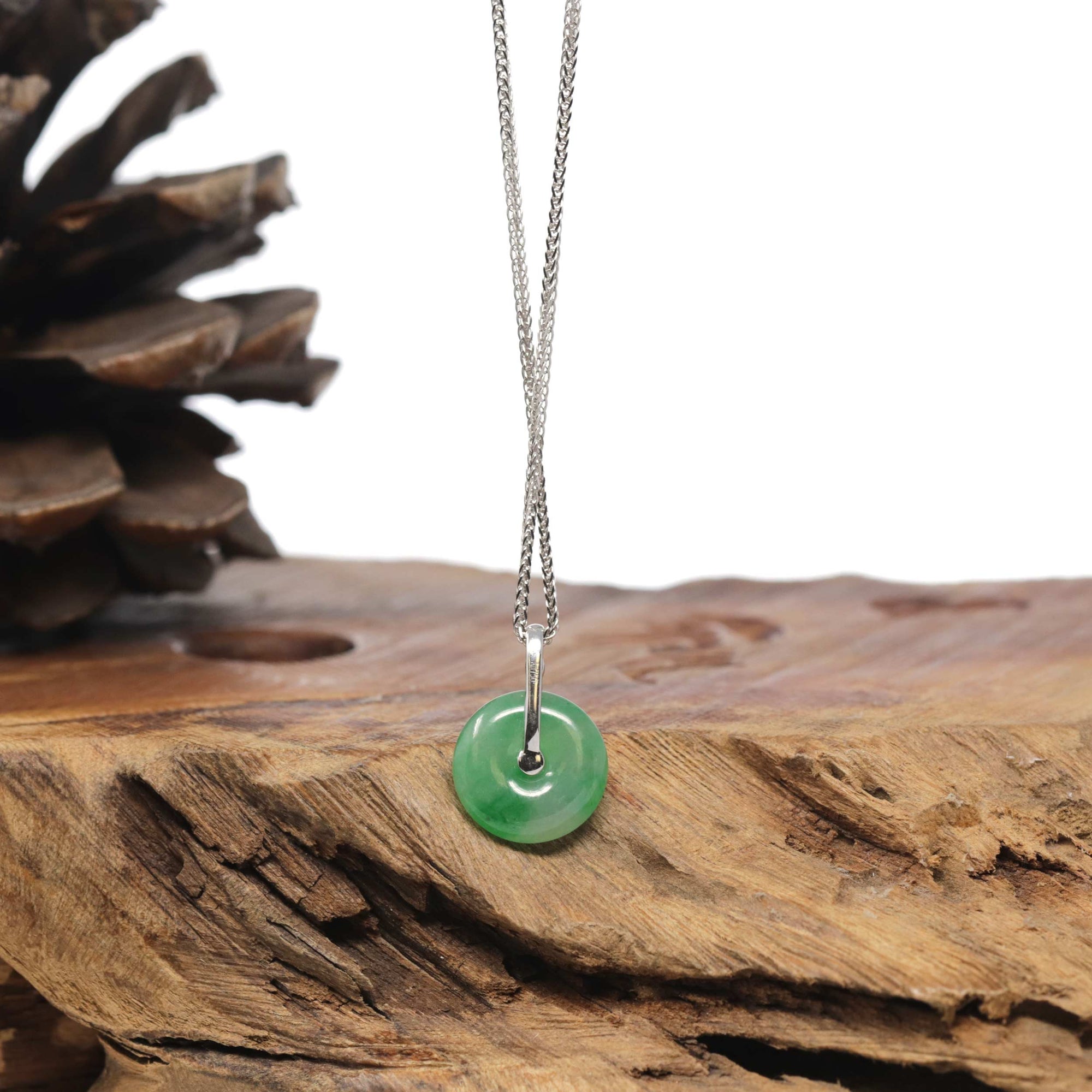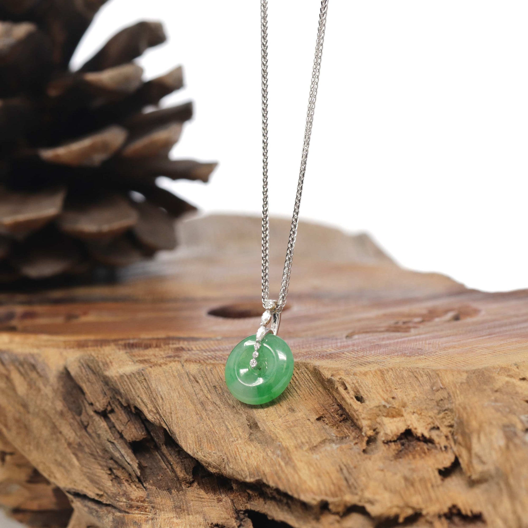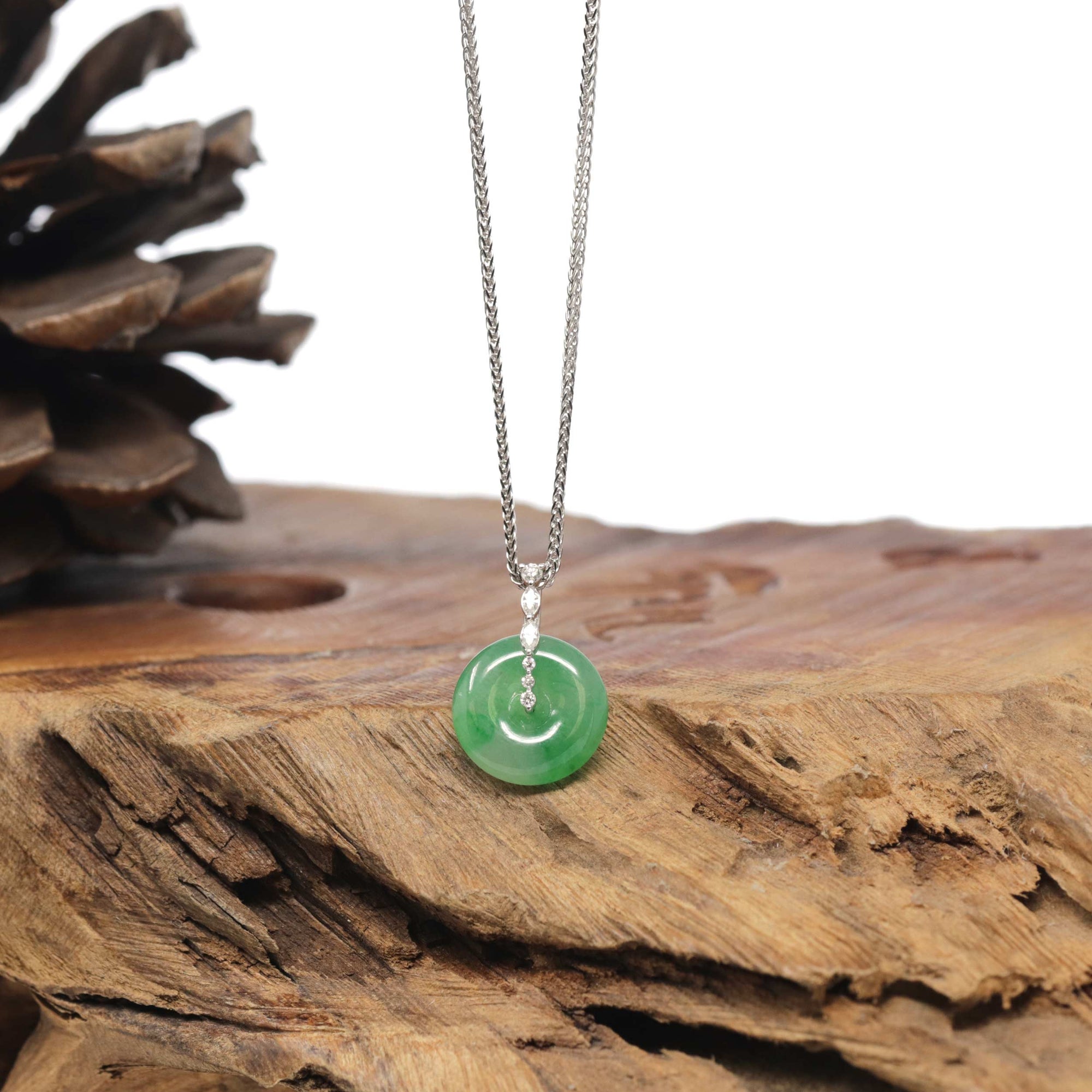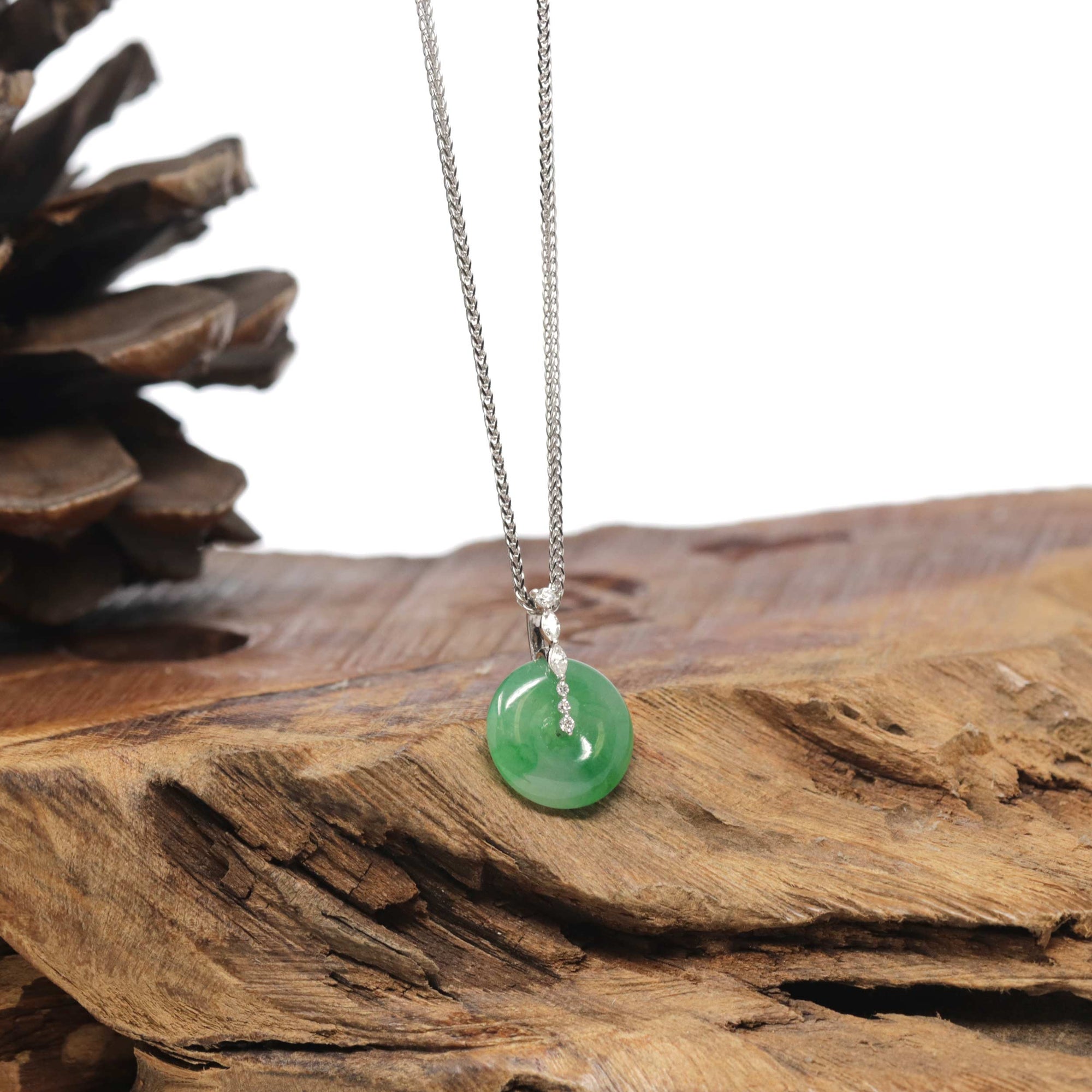Baikalla "Ping An Kou" (Good Luck Button) 18K White Gold Natural Vibrant Green Jadeite Jade Pendant W/ Natural Diamonds