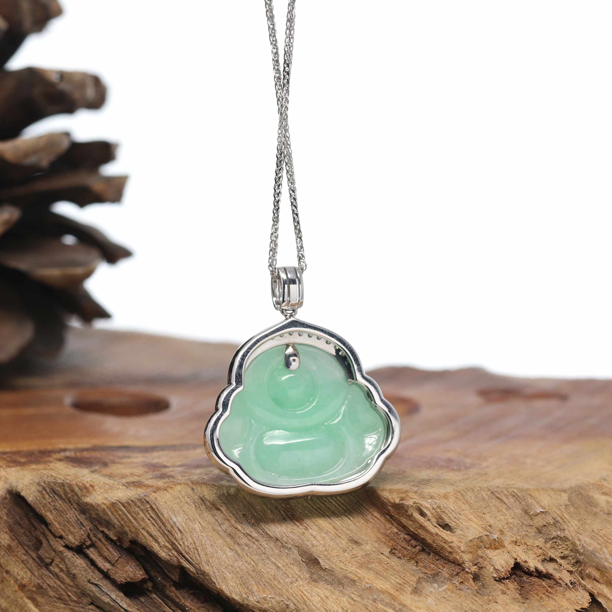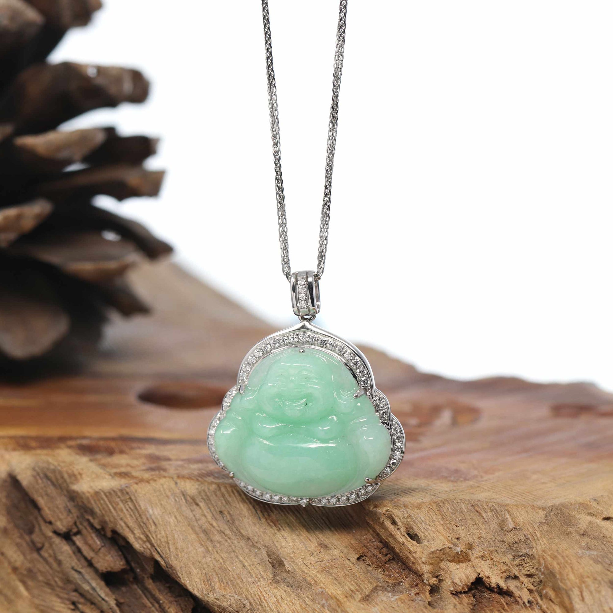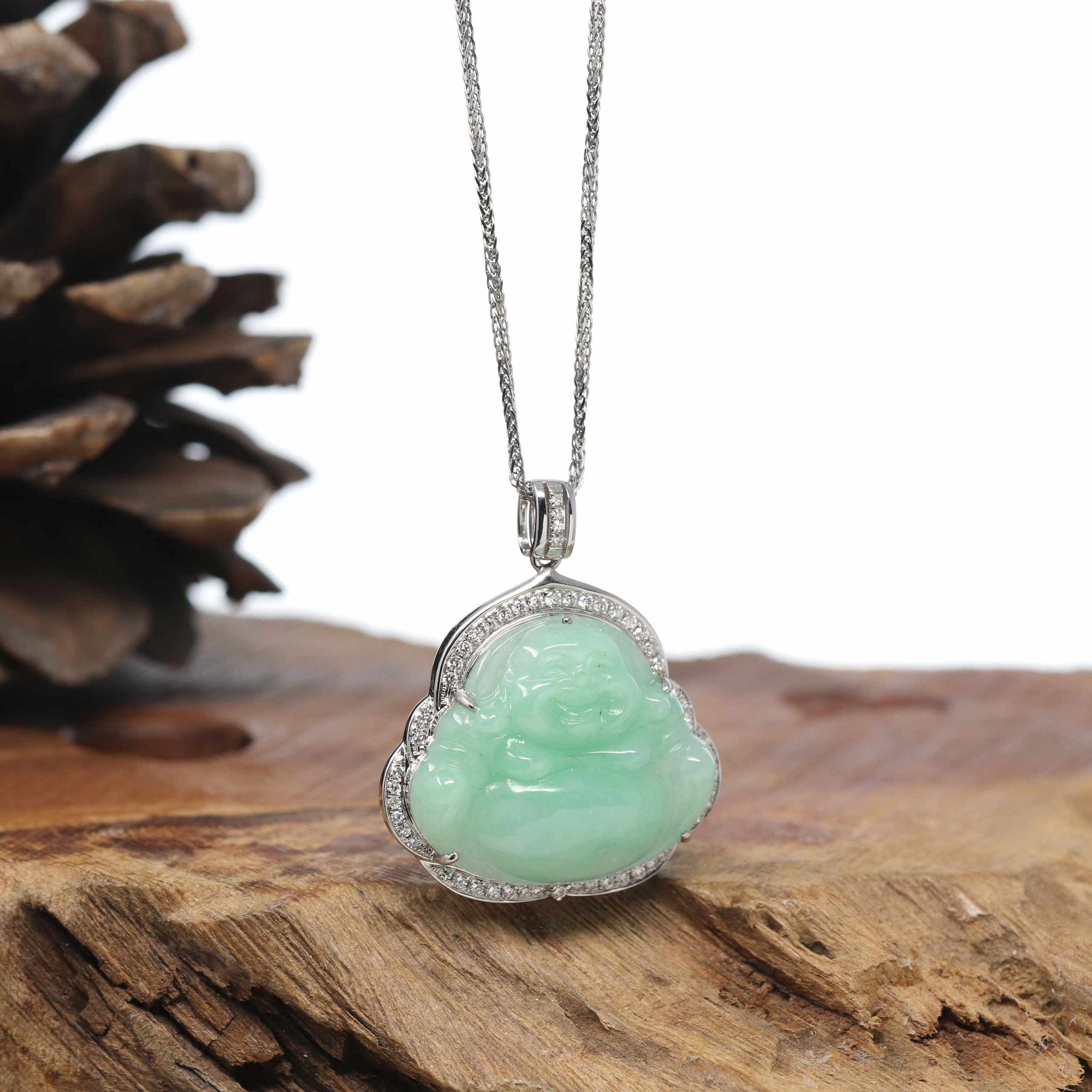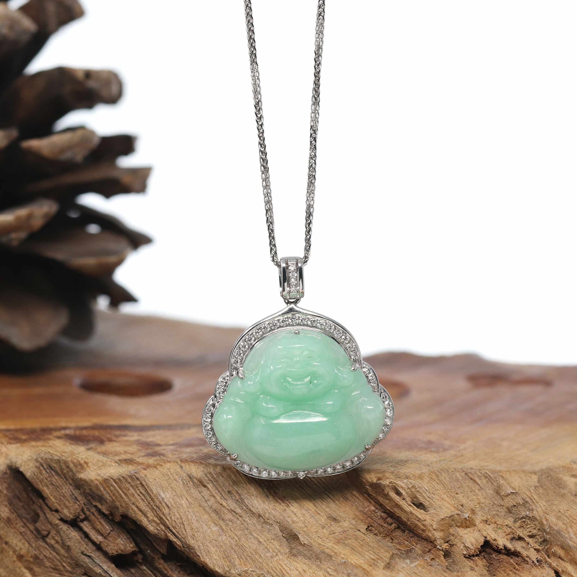 Baikalla™ "Laughing Buddha" Genuine Vibrant Green Jadeite Buddha Pendant Necklace With 14k White Gold Diamond Bail