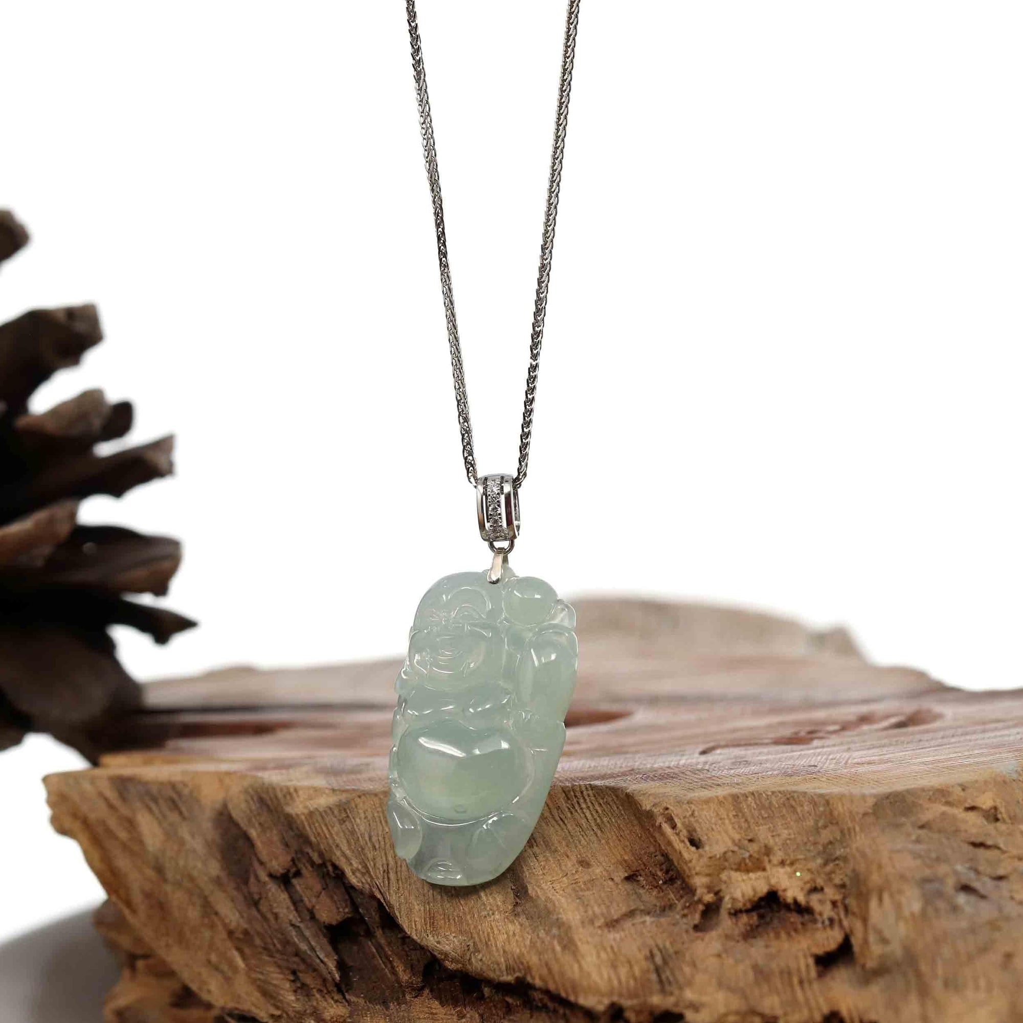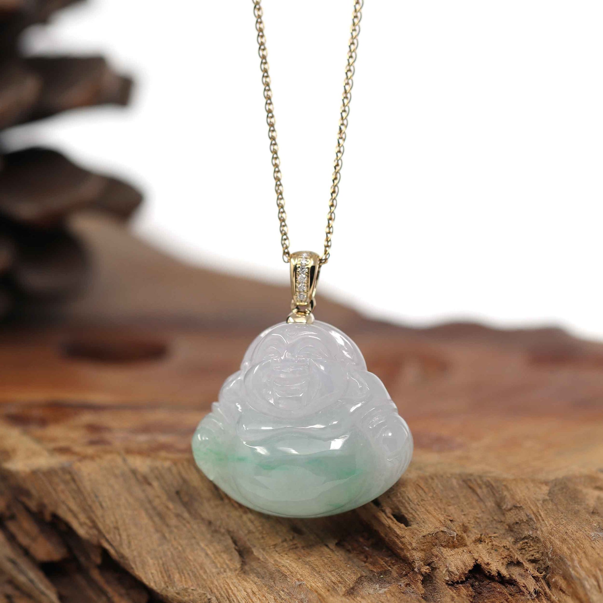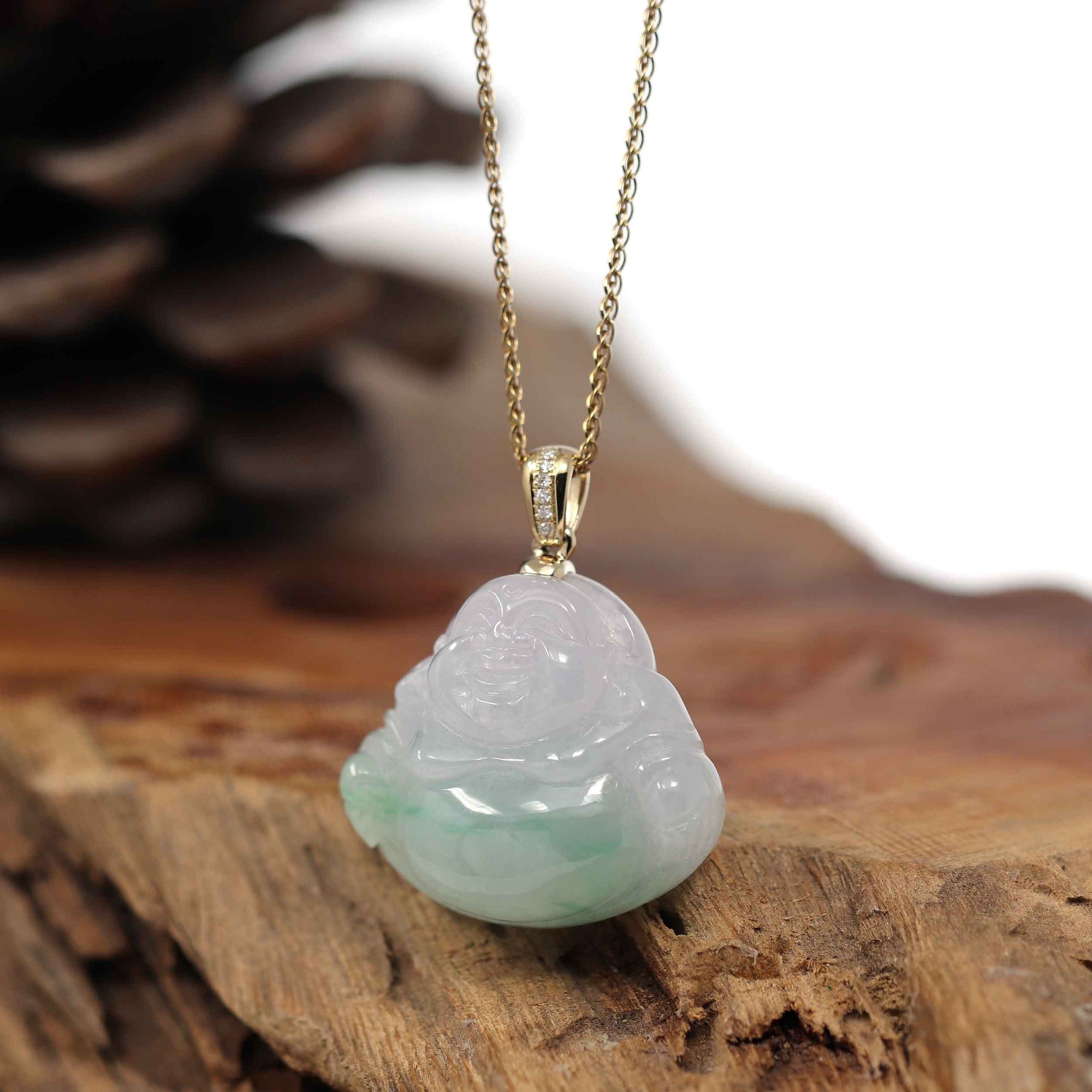Baikalla™ "Laughing Buddha" Genuine Vibrant Green Jadeite Buddha Pendant Necklace With 14k White Gold Diamond Bail