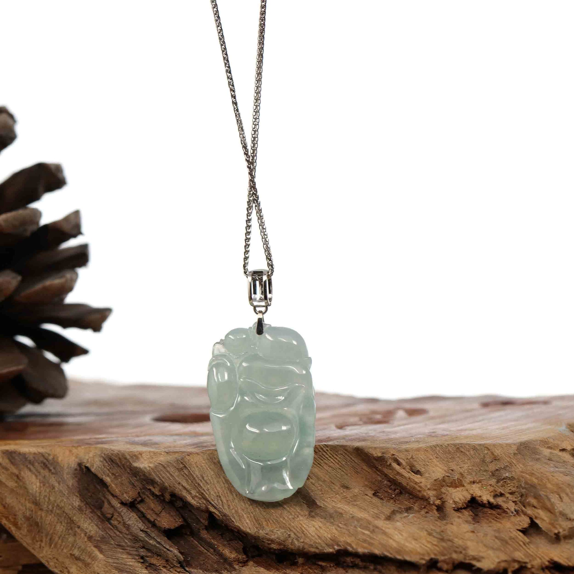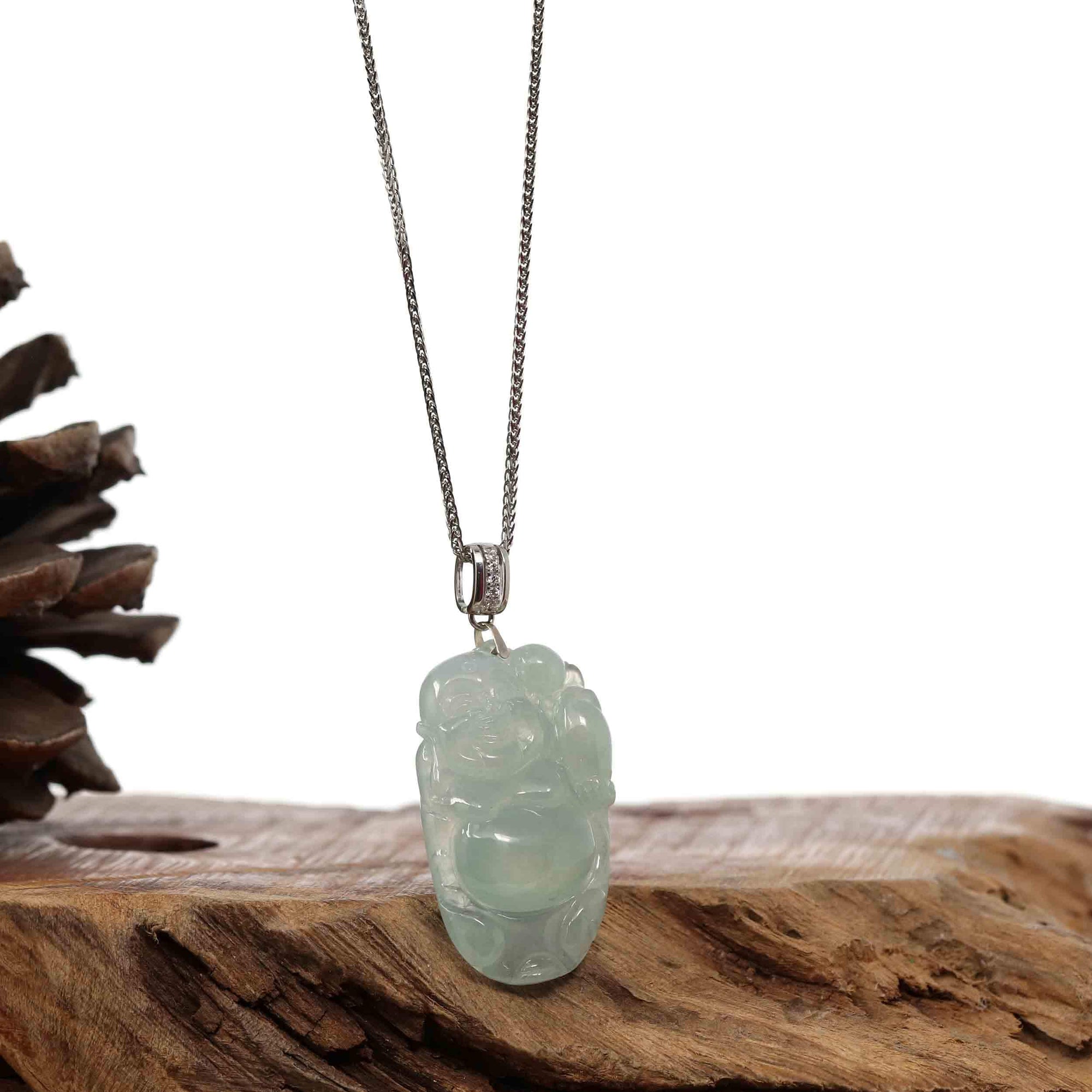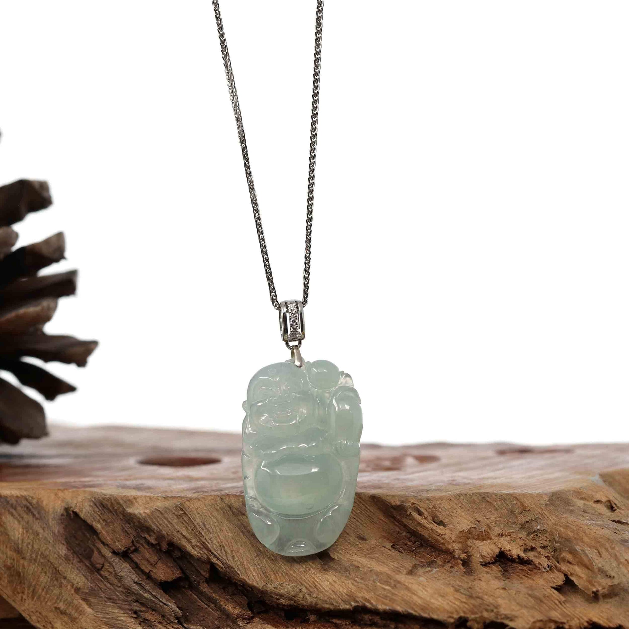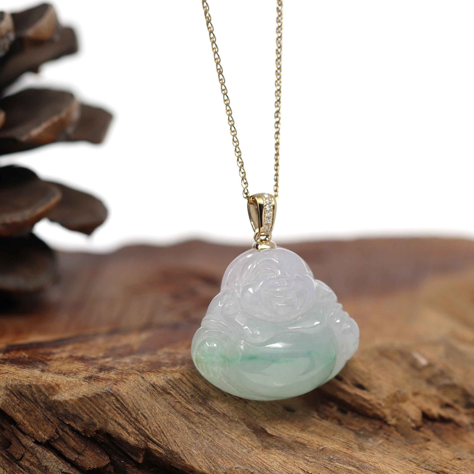 Baikalla™ "Laughing Buddha" Genuine Vibrant Green Jadeite Buddha Pendant Necklace With 14k White Gold Diamond Bail