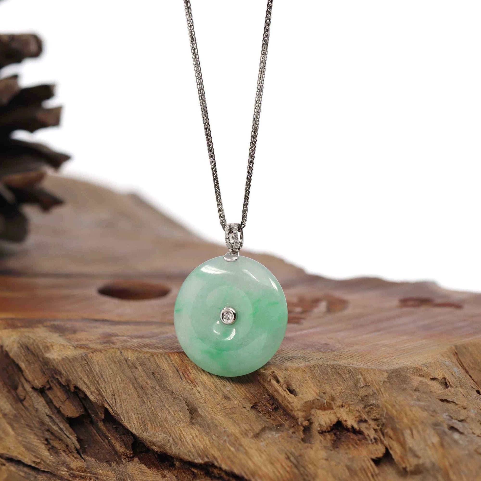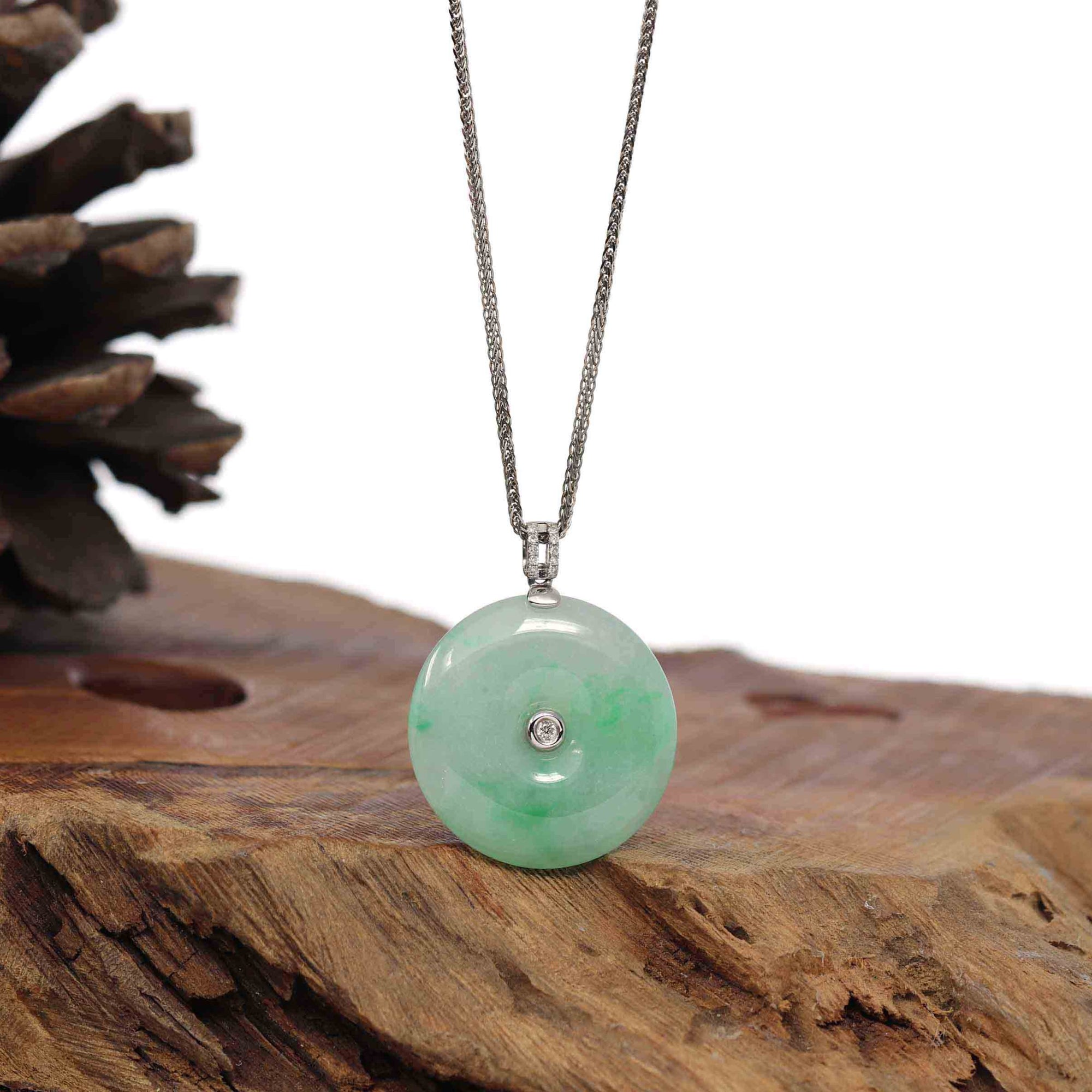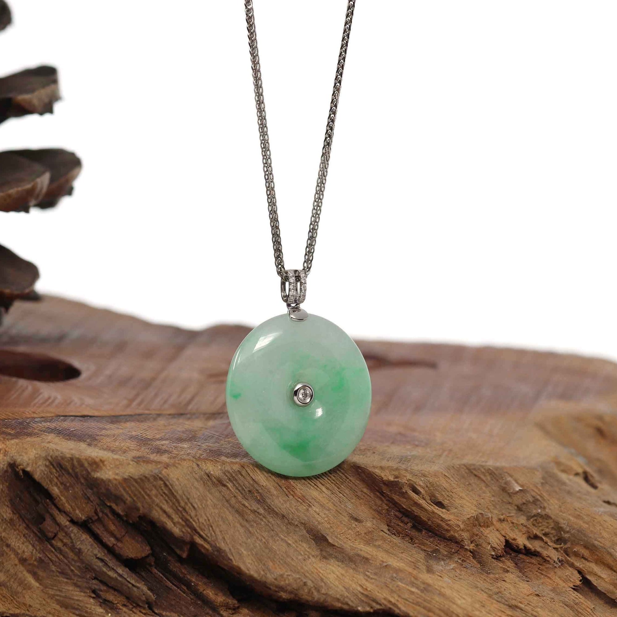 18K White Gold "Good Luck Button" Necklace Icy Green Jadeite Jade Pendant Necklace