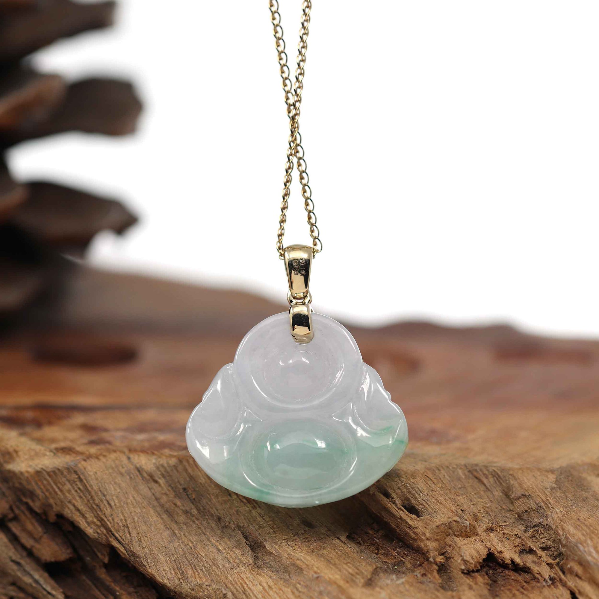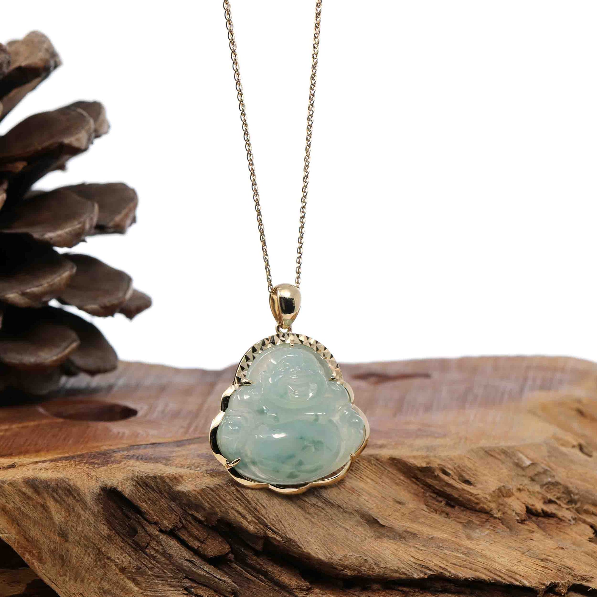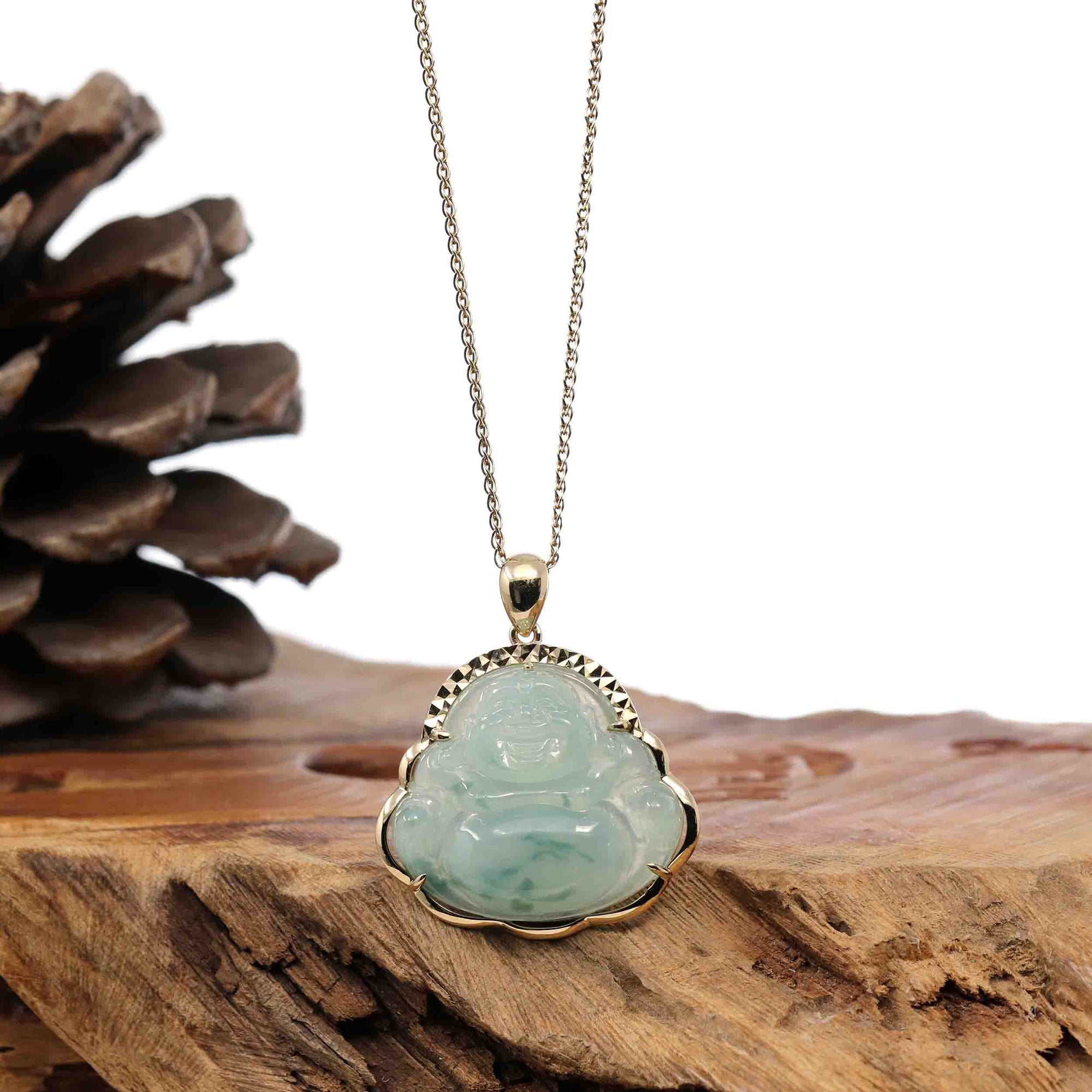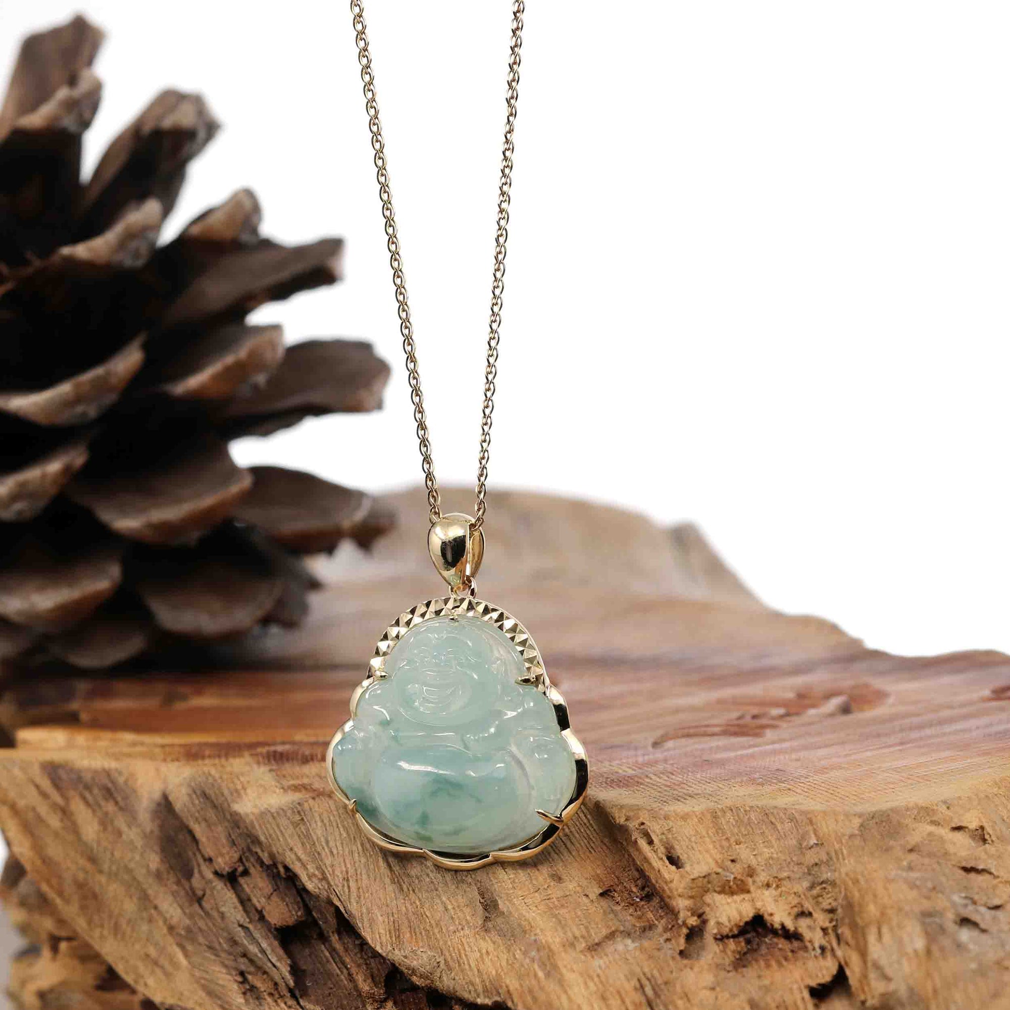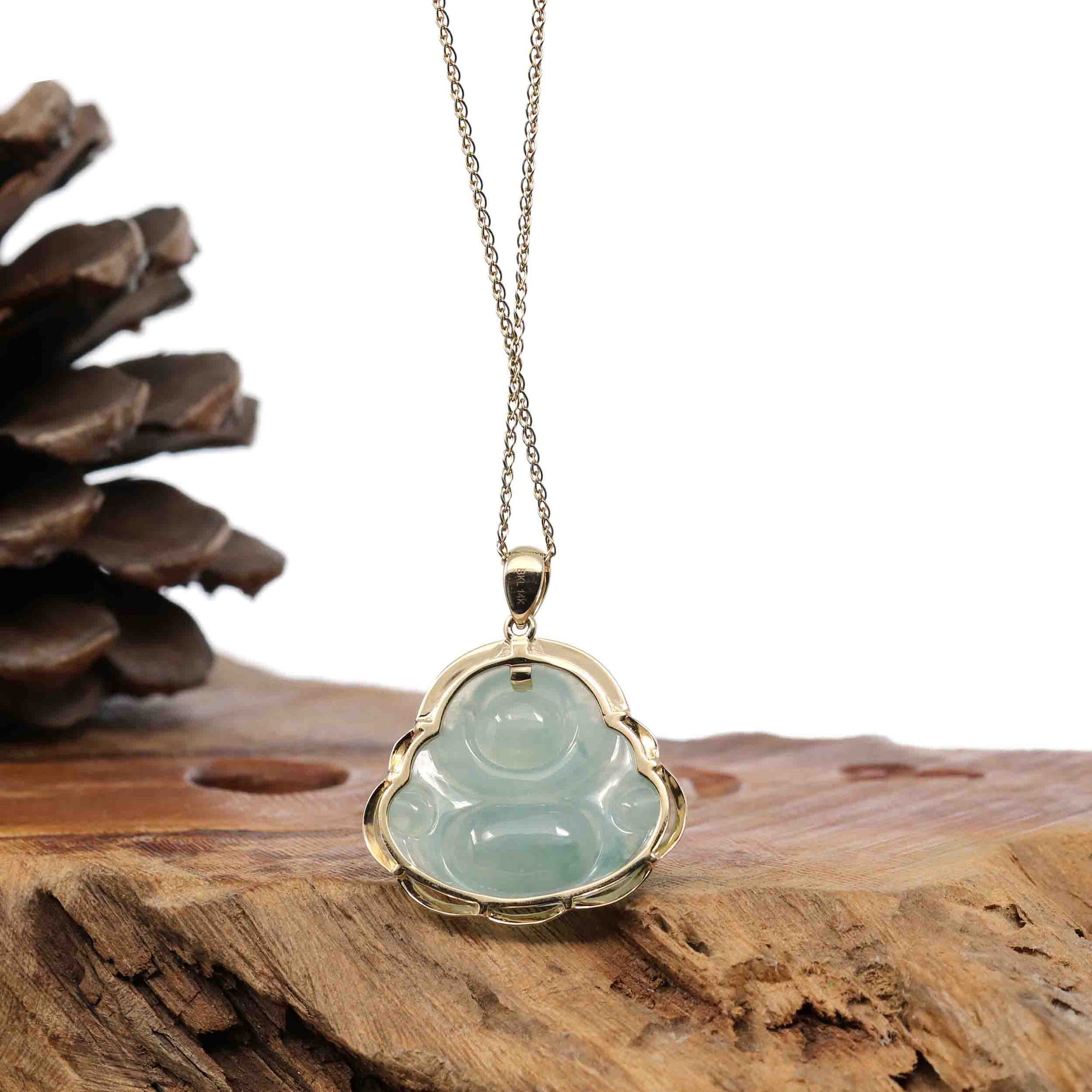Burmese Ice Blue Green Jadeite Jade Happy Buddha Necklace With 18K Gold Bail