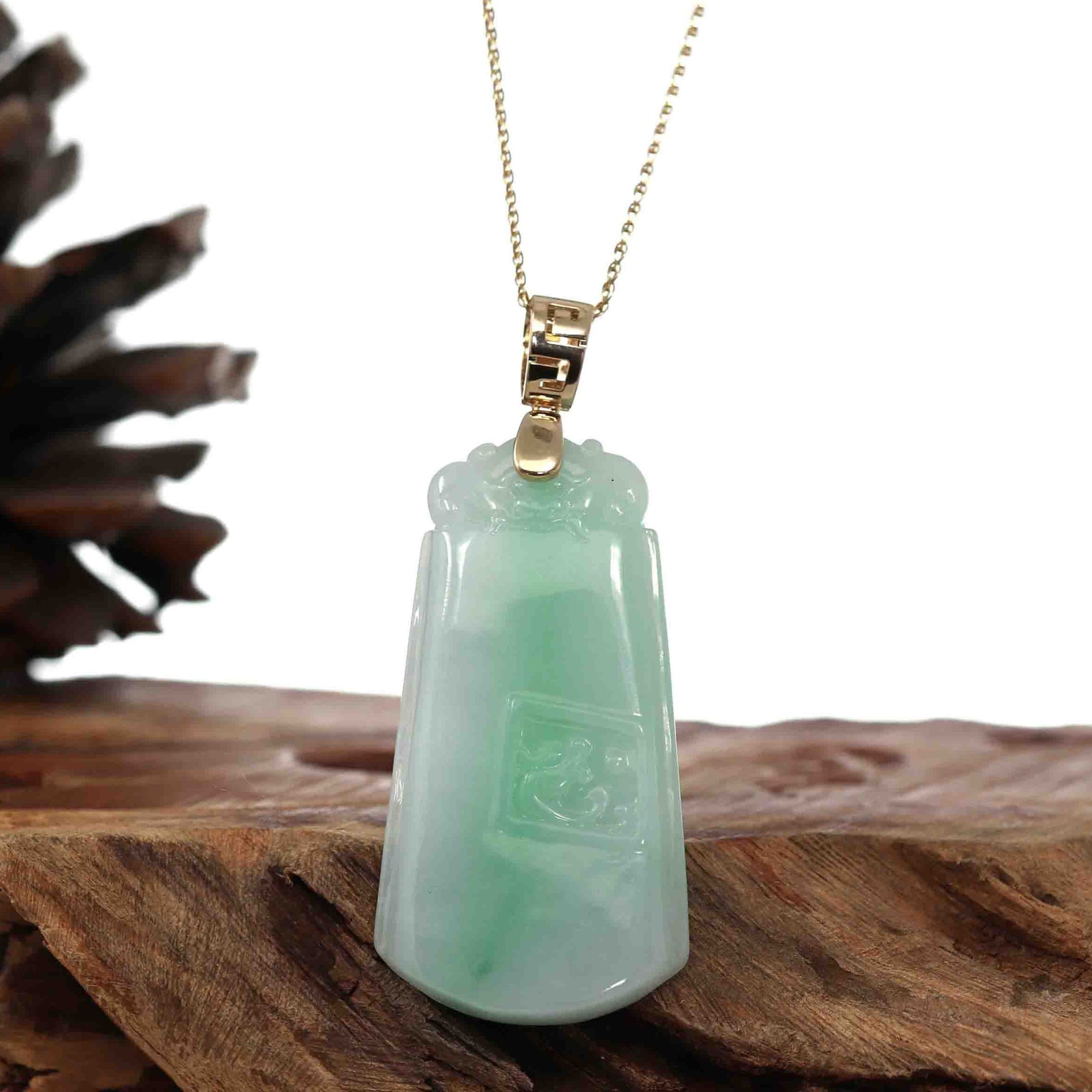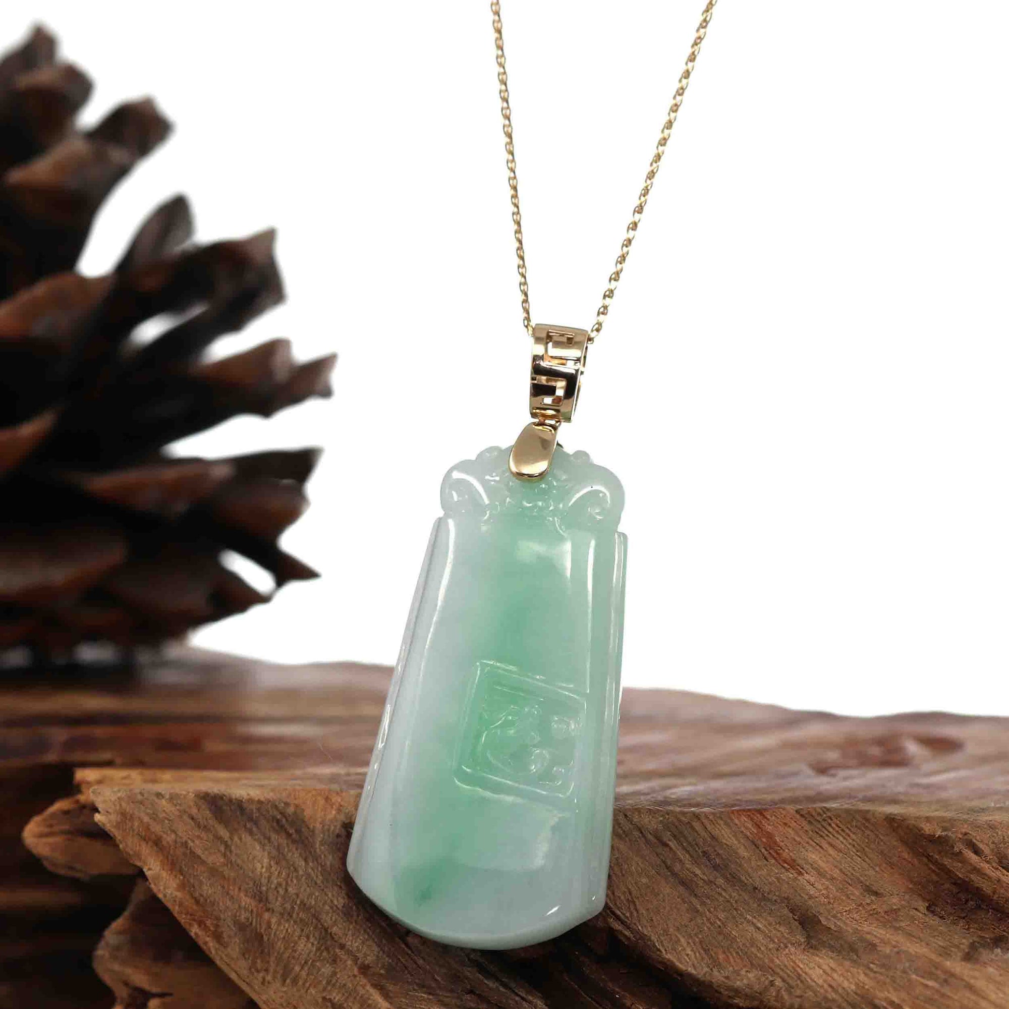 Baikalla Genuine Green Jadeite Jade " Ping An Wu Shi Pai " Pendant With Gold Bail