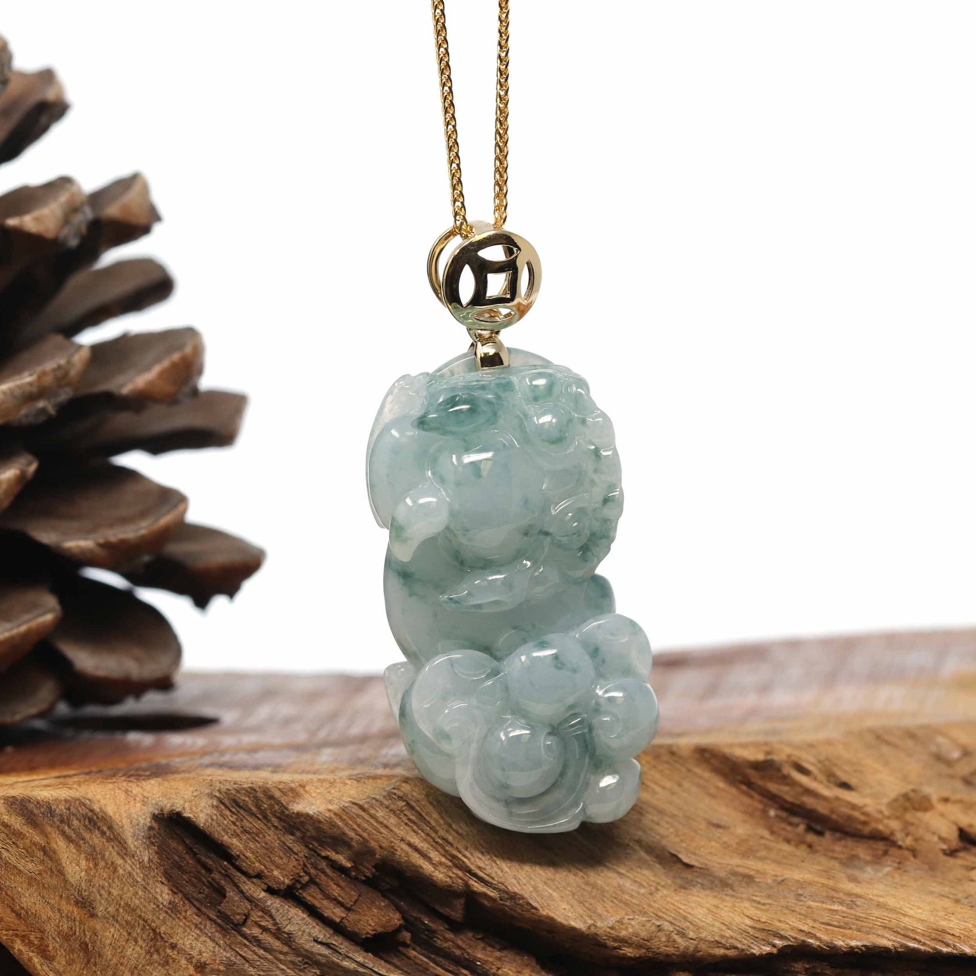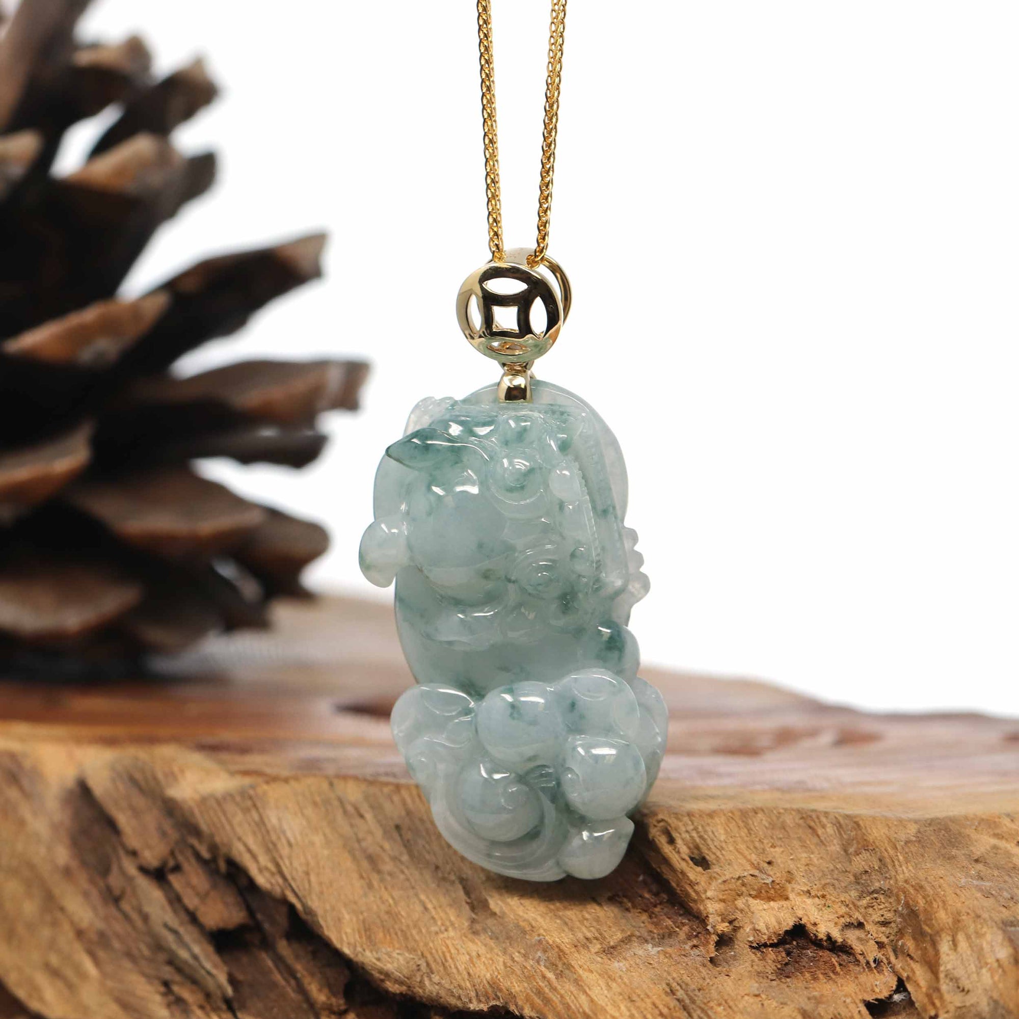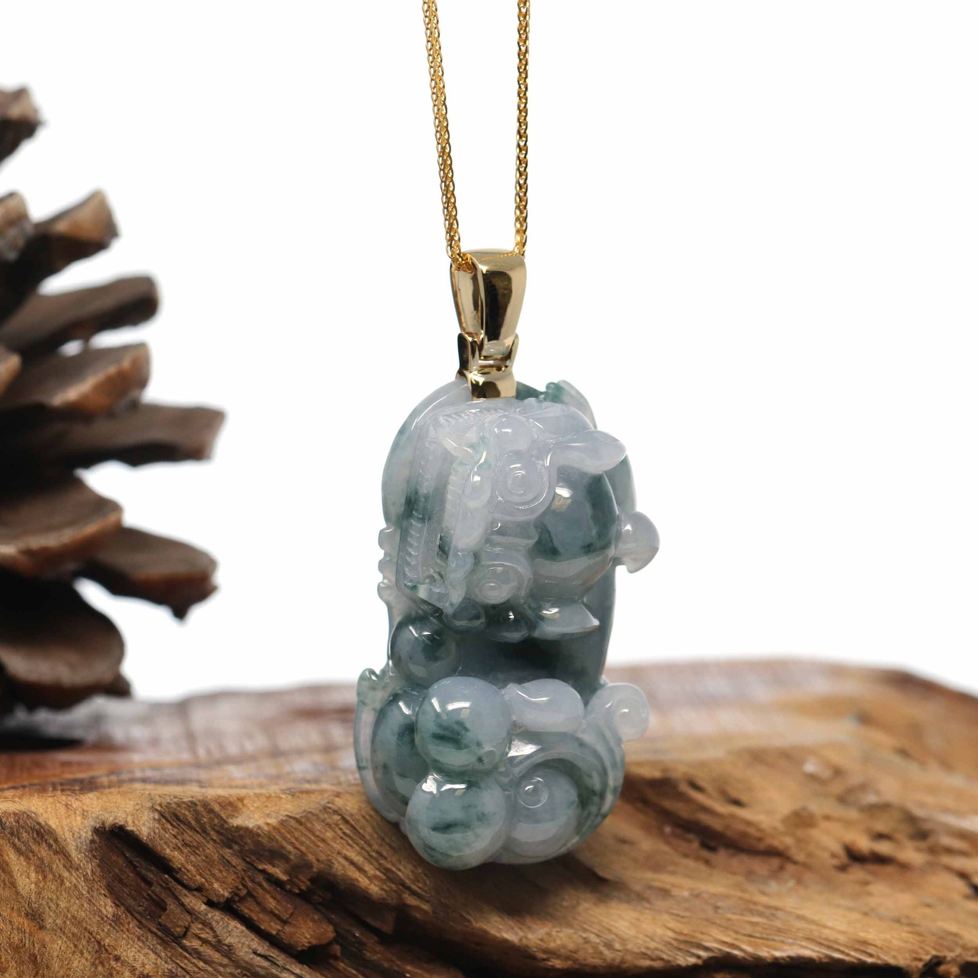 Genuine Burmese Blue-Green Jadeite Jade PiXiu Pendant Necklace With 14K Gold Bail