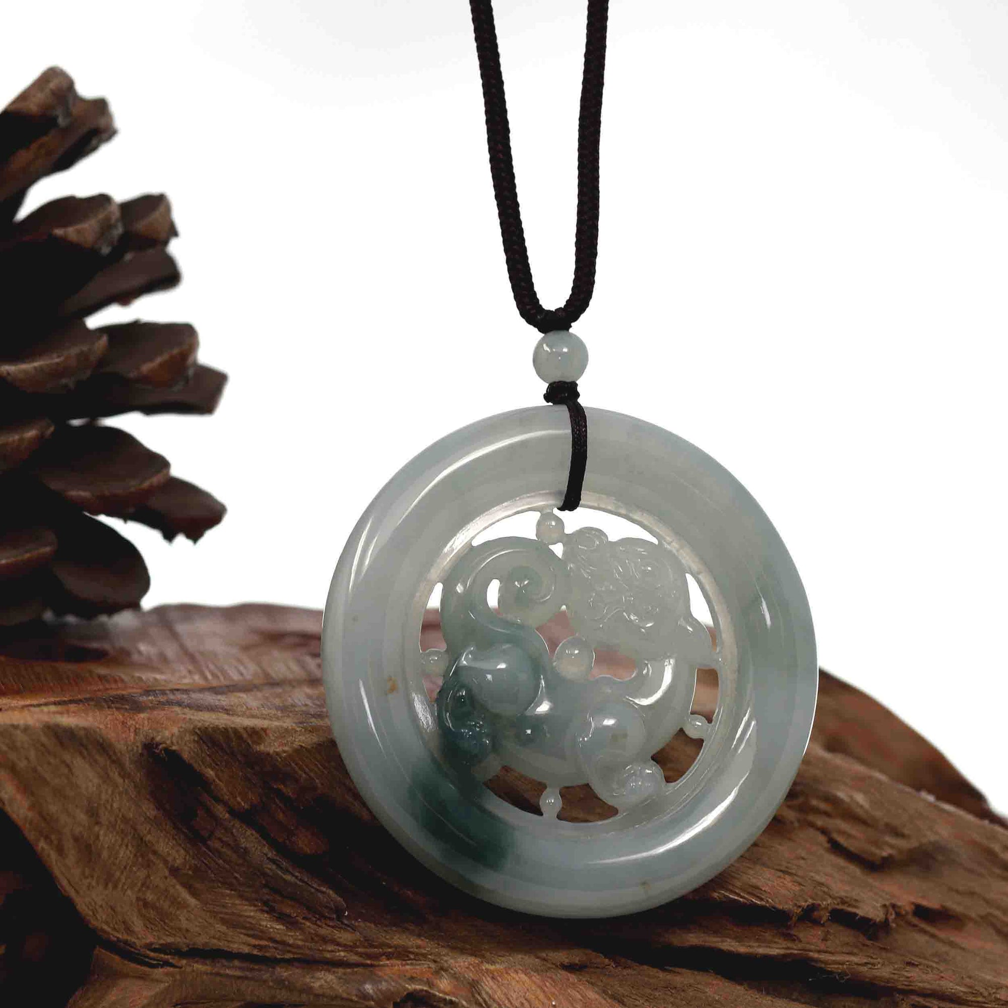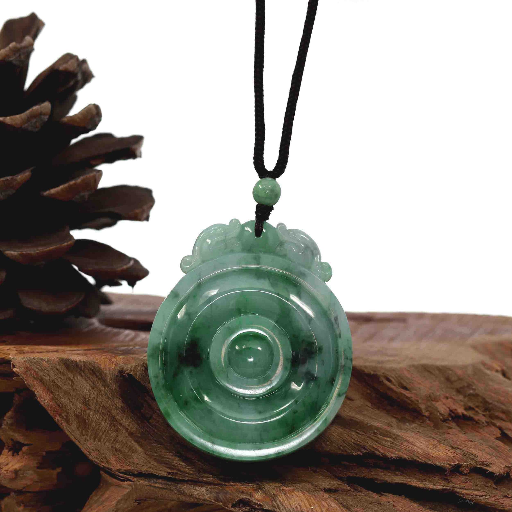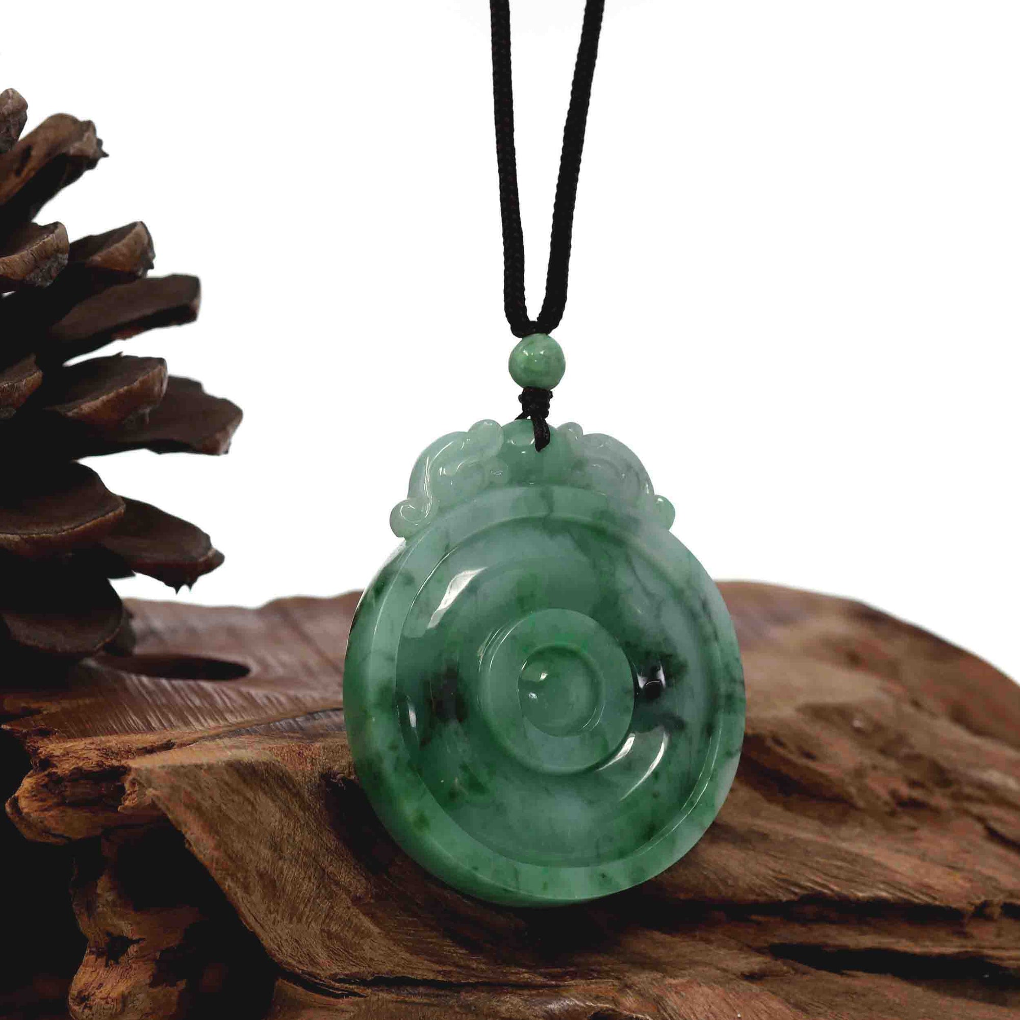 Genuine Green Jadeite Jade "Good Luck Money Circle with Dragon Accent" Pendant Necklace With Real Jadeite Bead Necklace