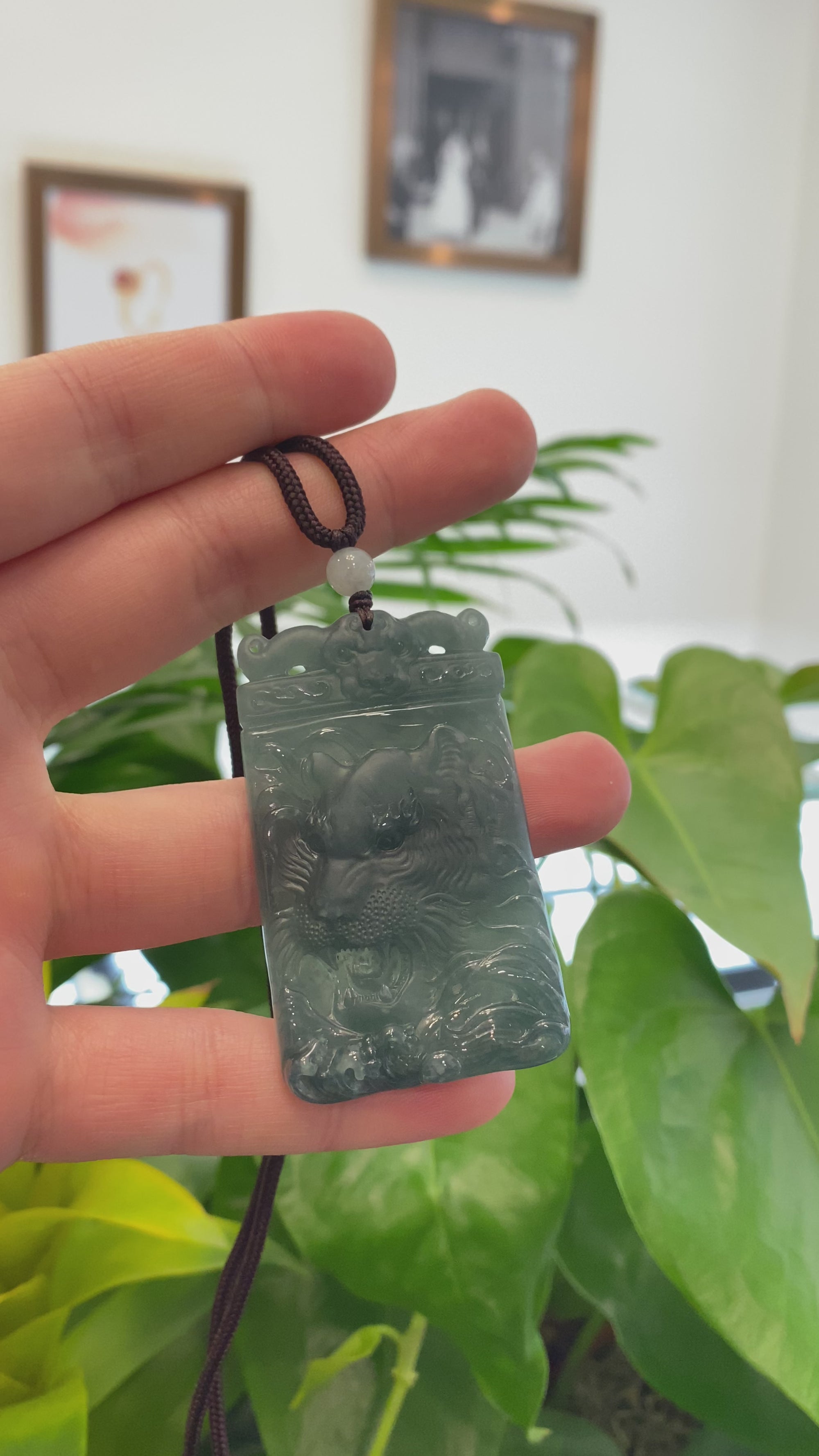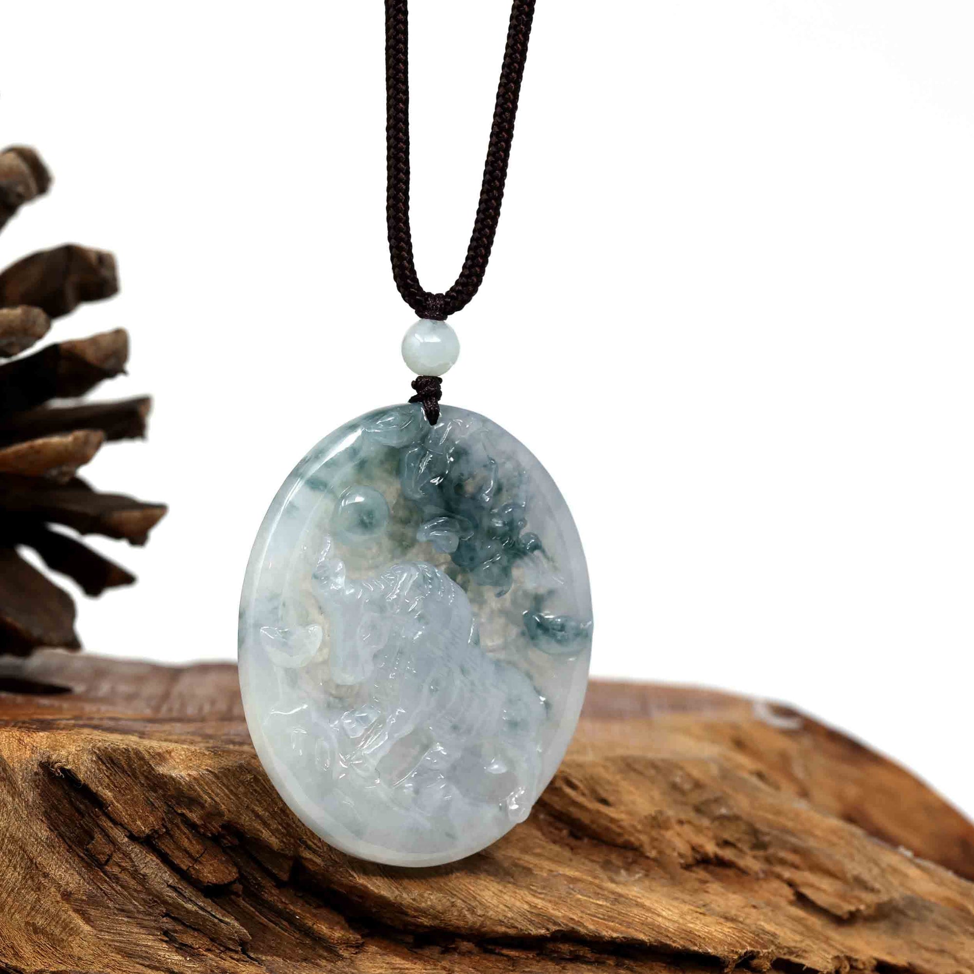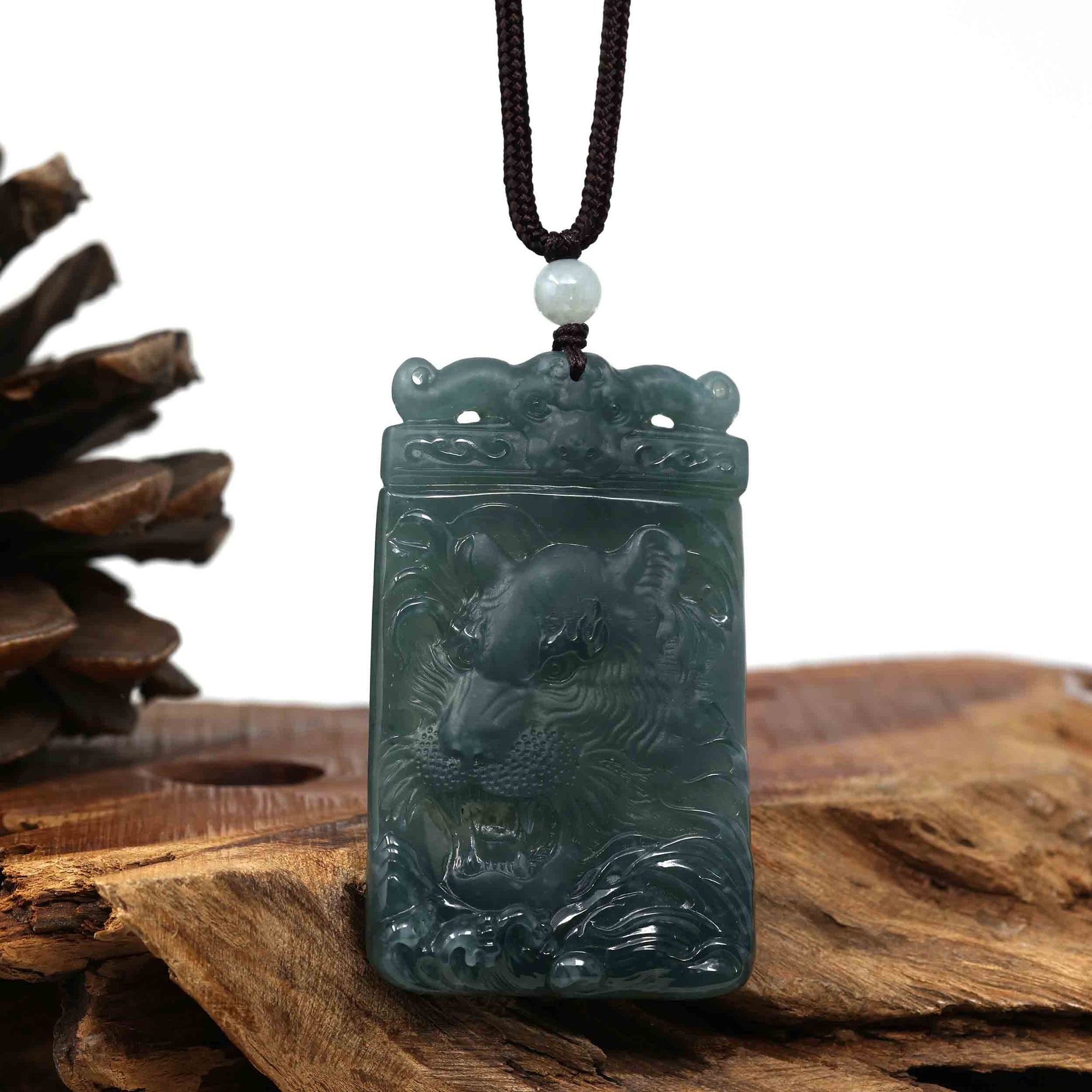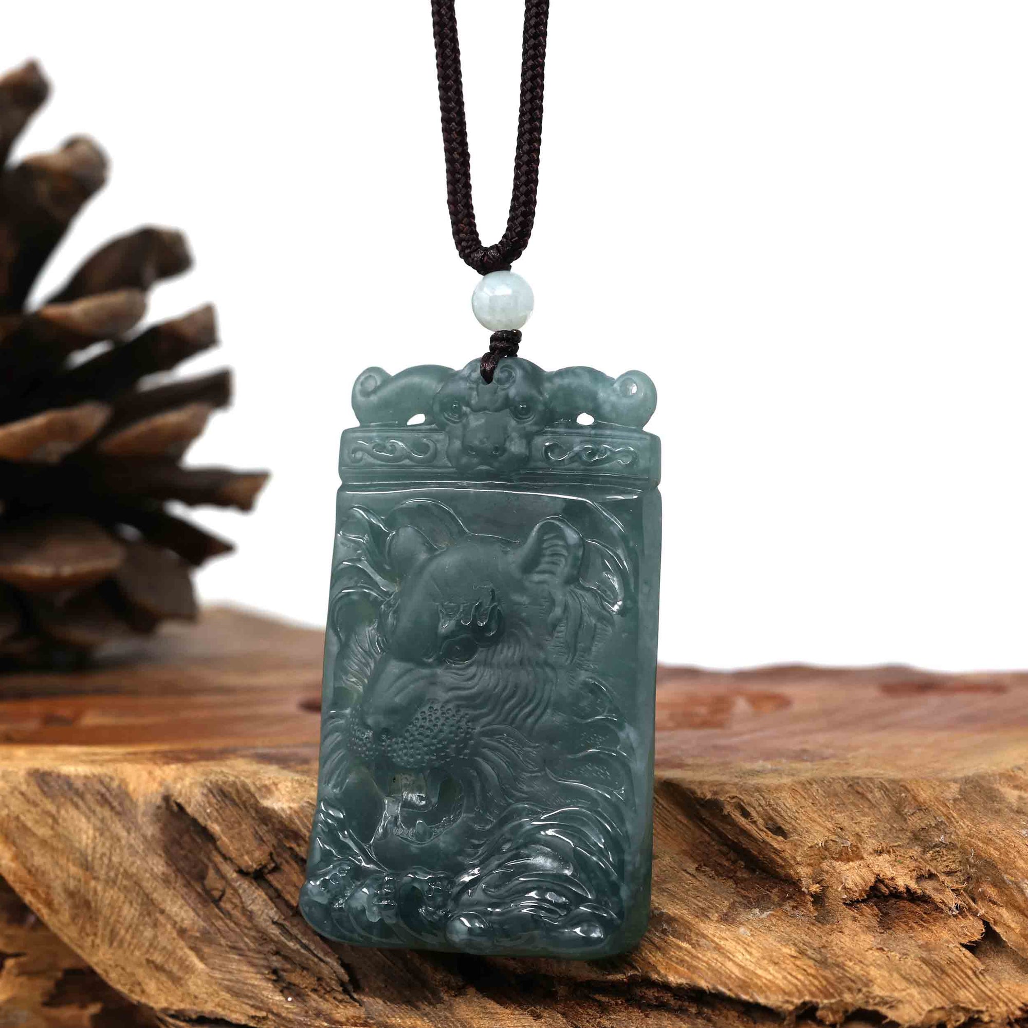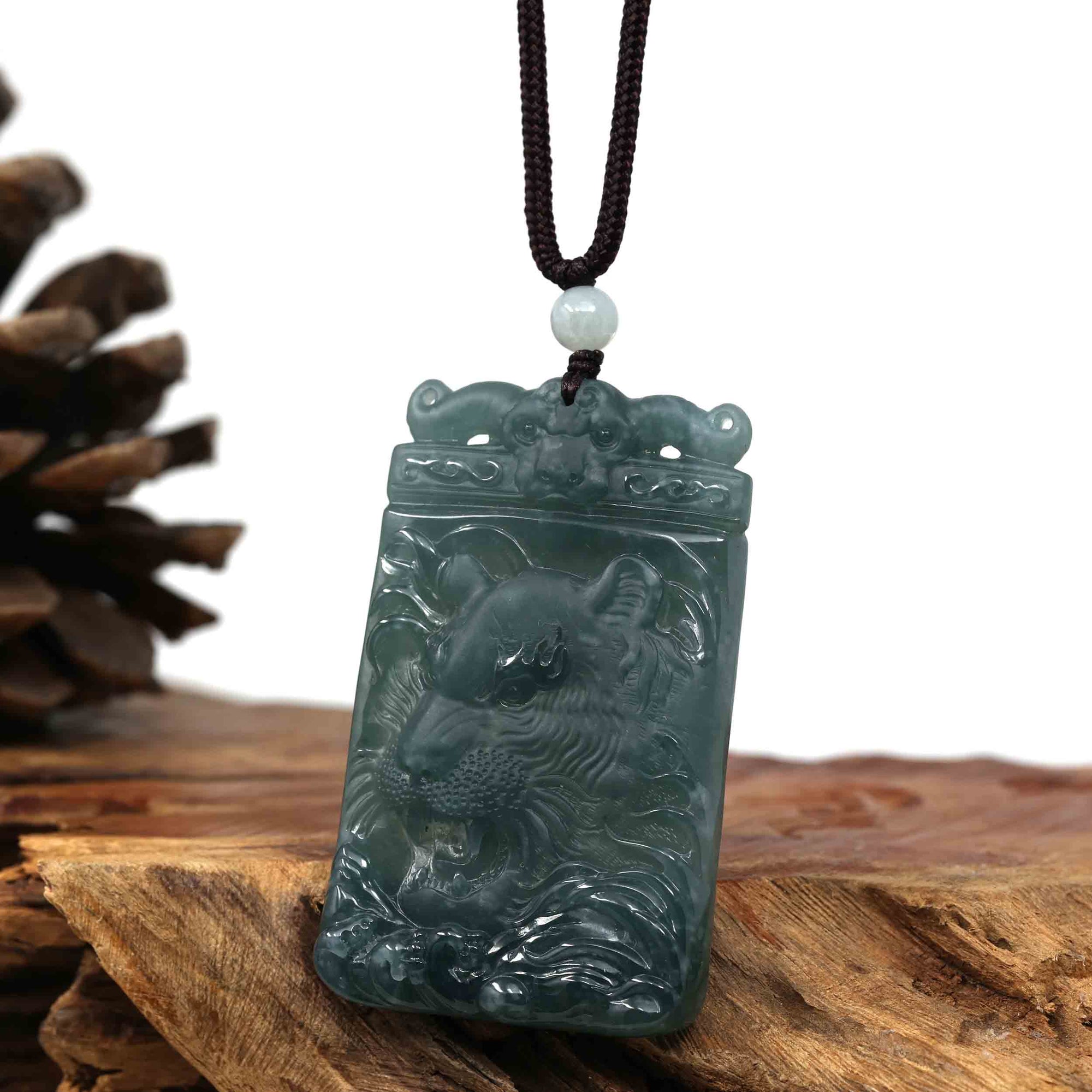 Natural Deep Blue Green Jadeite Jade "Roaring Tiger" Pendant Necklace For Men, Collectibles.