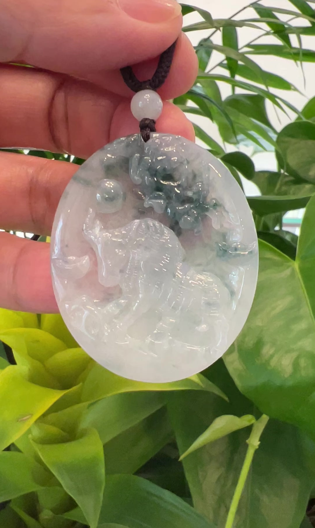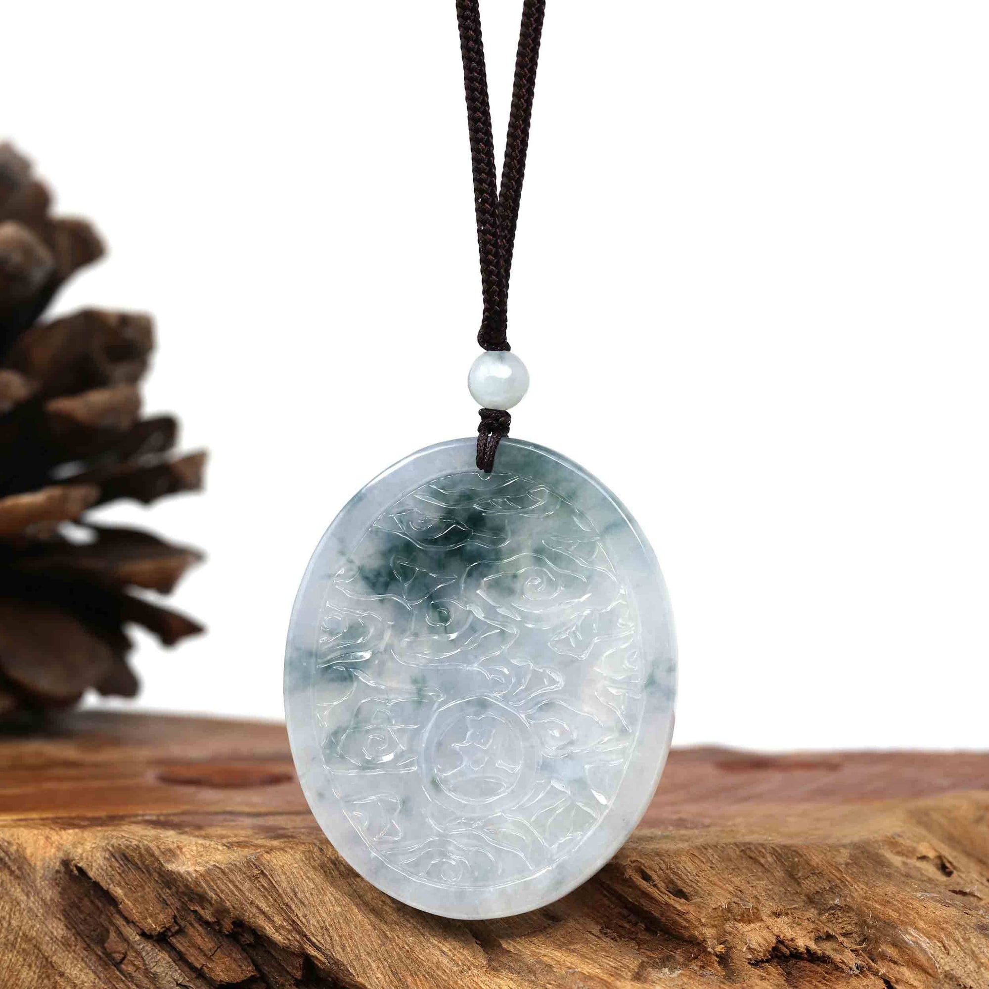Genuine Ice Blue-Green Jadeite Jade "Good Luck Oval with Dragon Accent" Pendant Necklace With Real Jadeite Bead Necklace