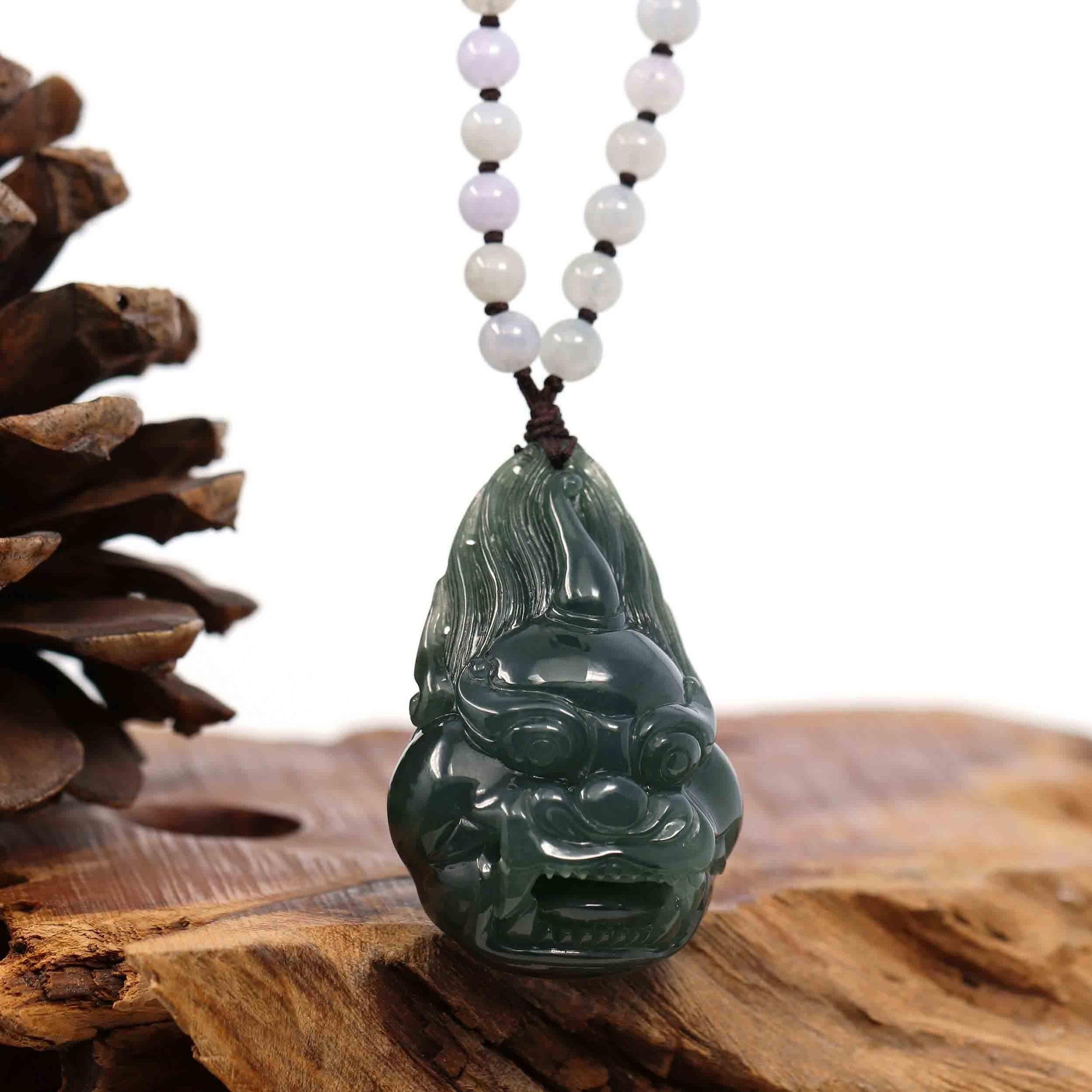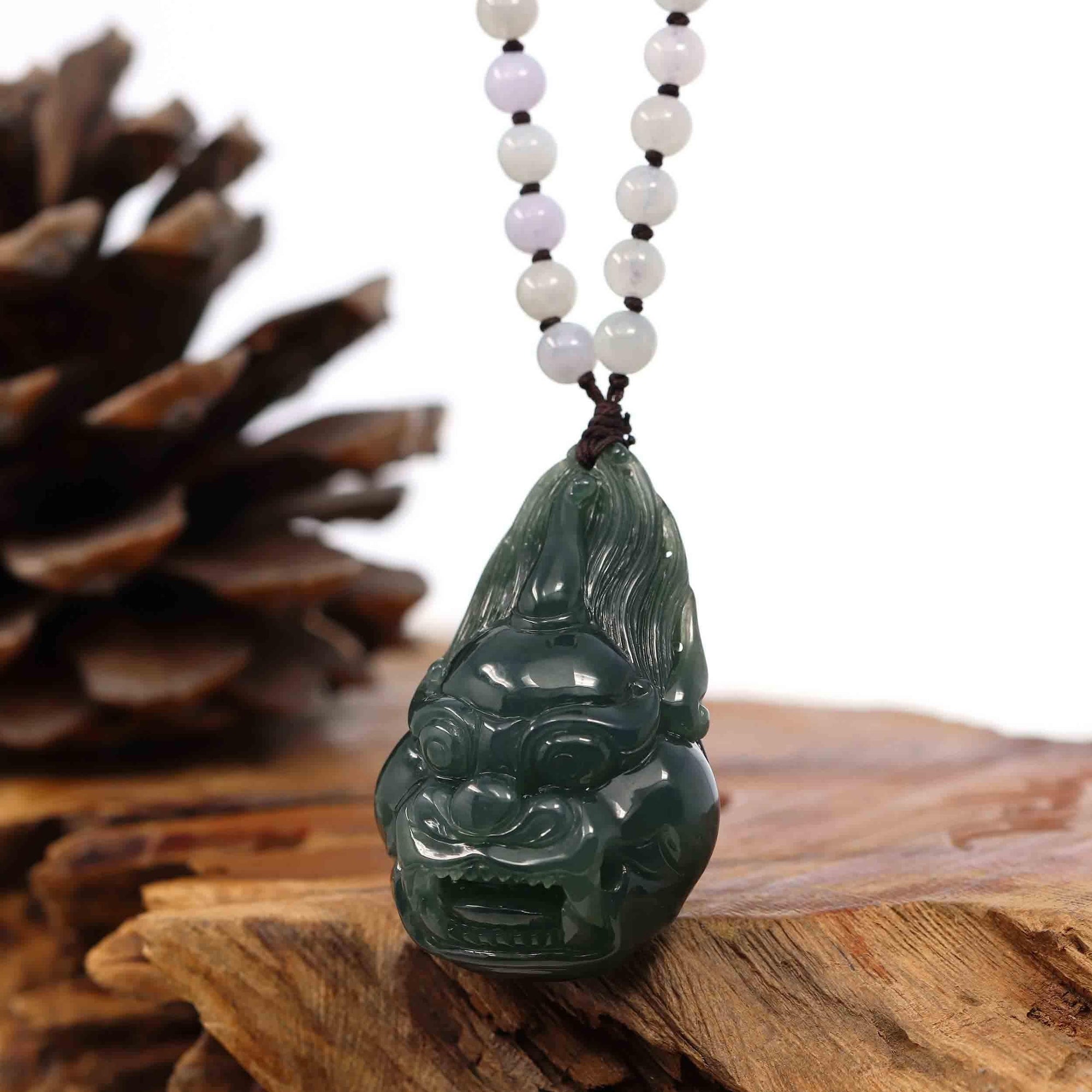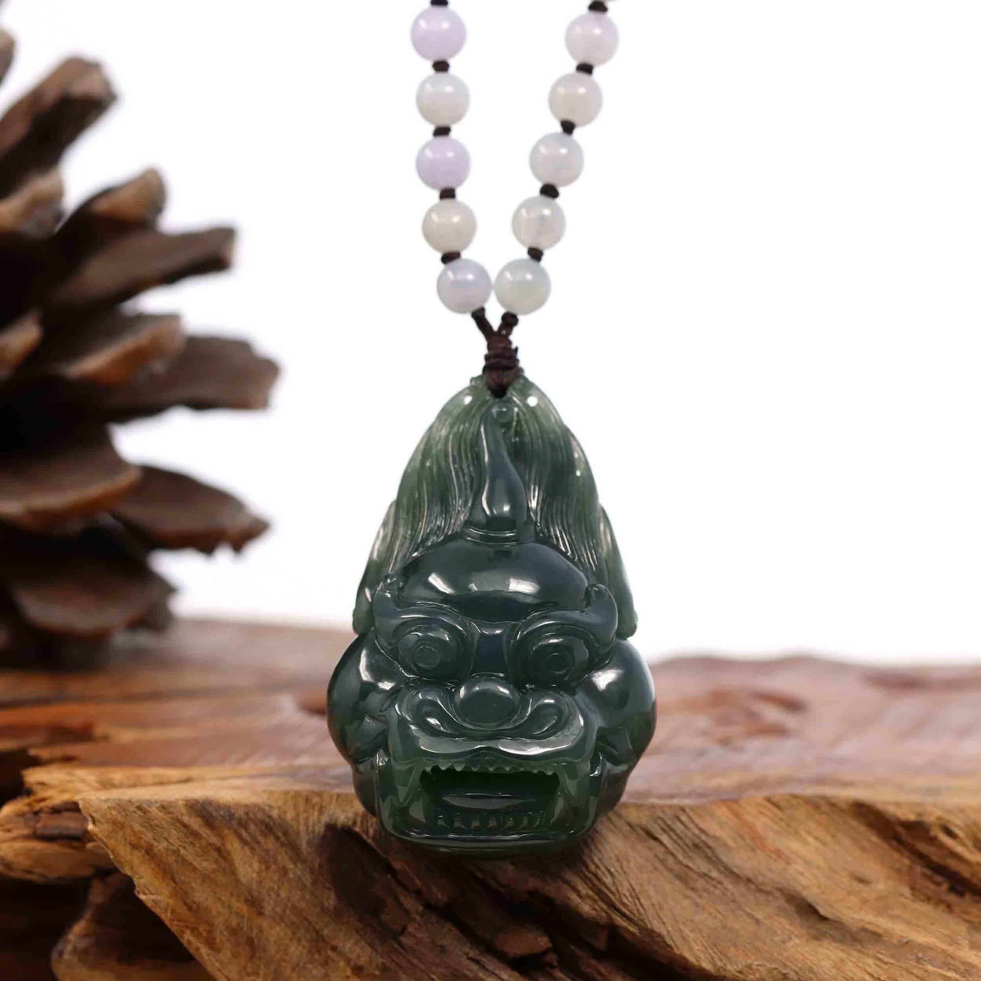 Baikalla™ "Fu Dog" (Guardian Lion) Natural Blue Green Jadeite Jade Necklace Collectibles