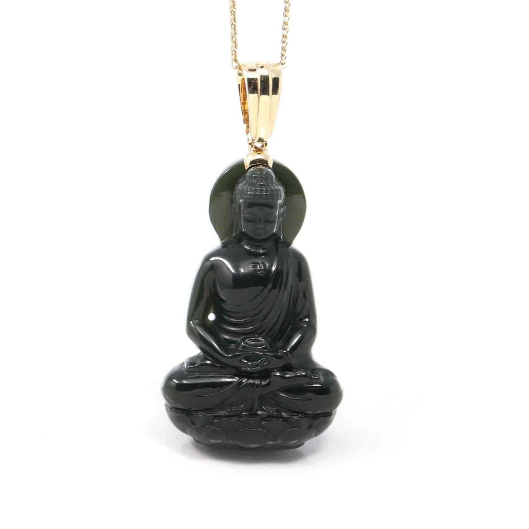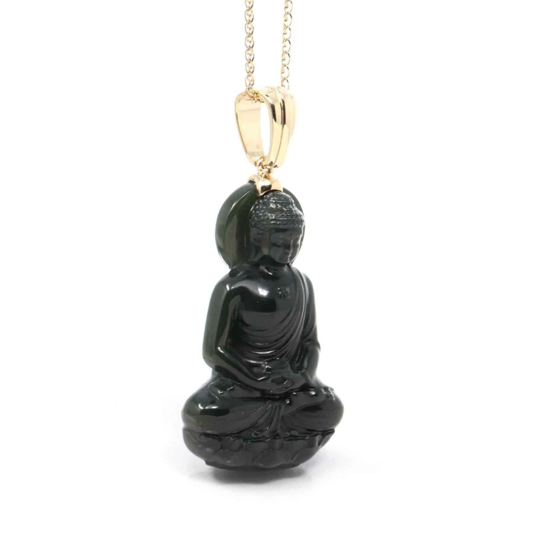 Baikalla™ 14K Yellow Gold Genuine Nephrite Black Jade " Ru Lai Buddha " Pendant Necklace