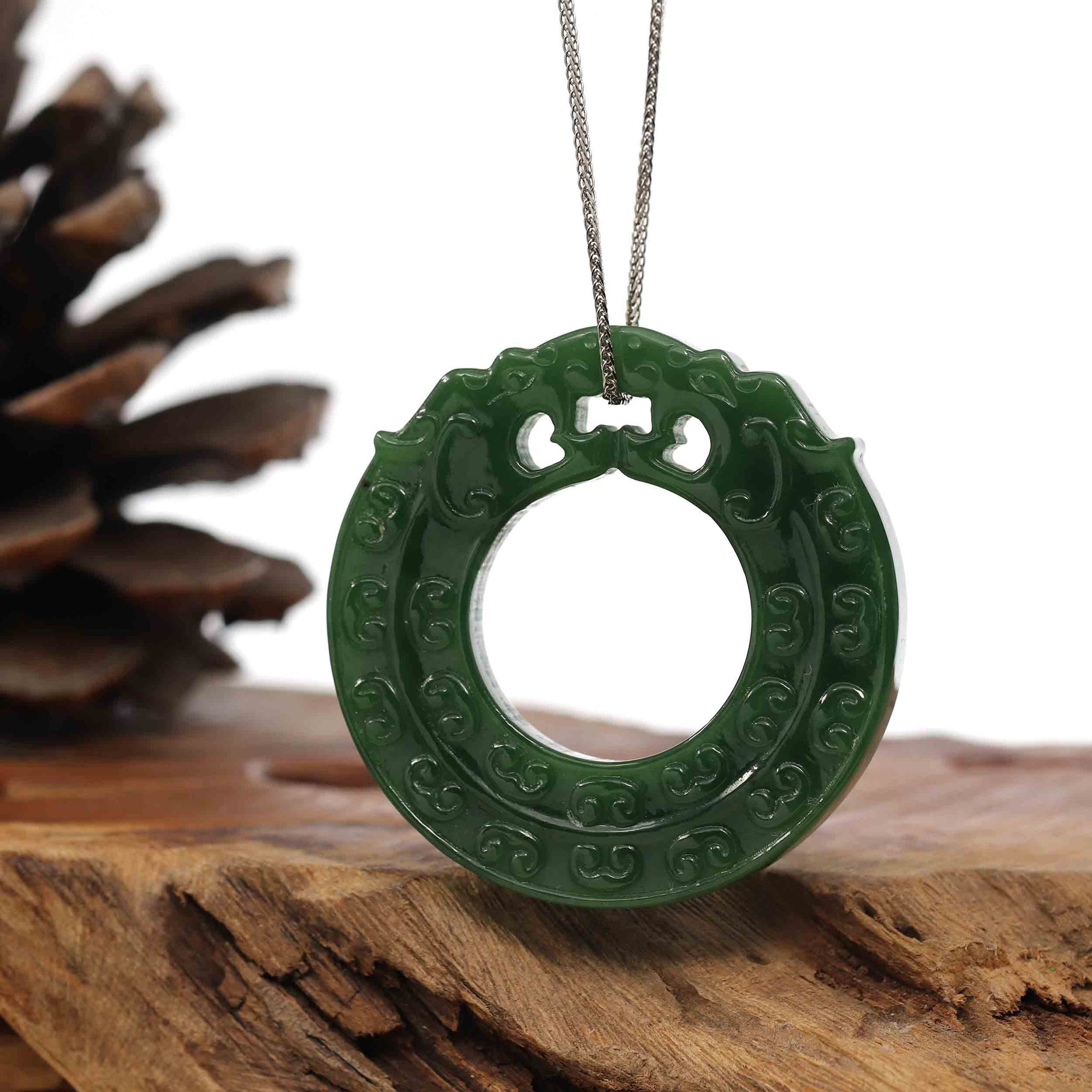 Baikalla™ " Double Dragon Good Fortune" Carving Pendant Necklace Natural Nephrite Jade