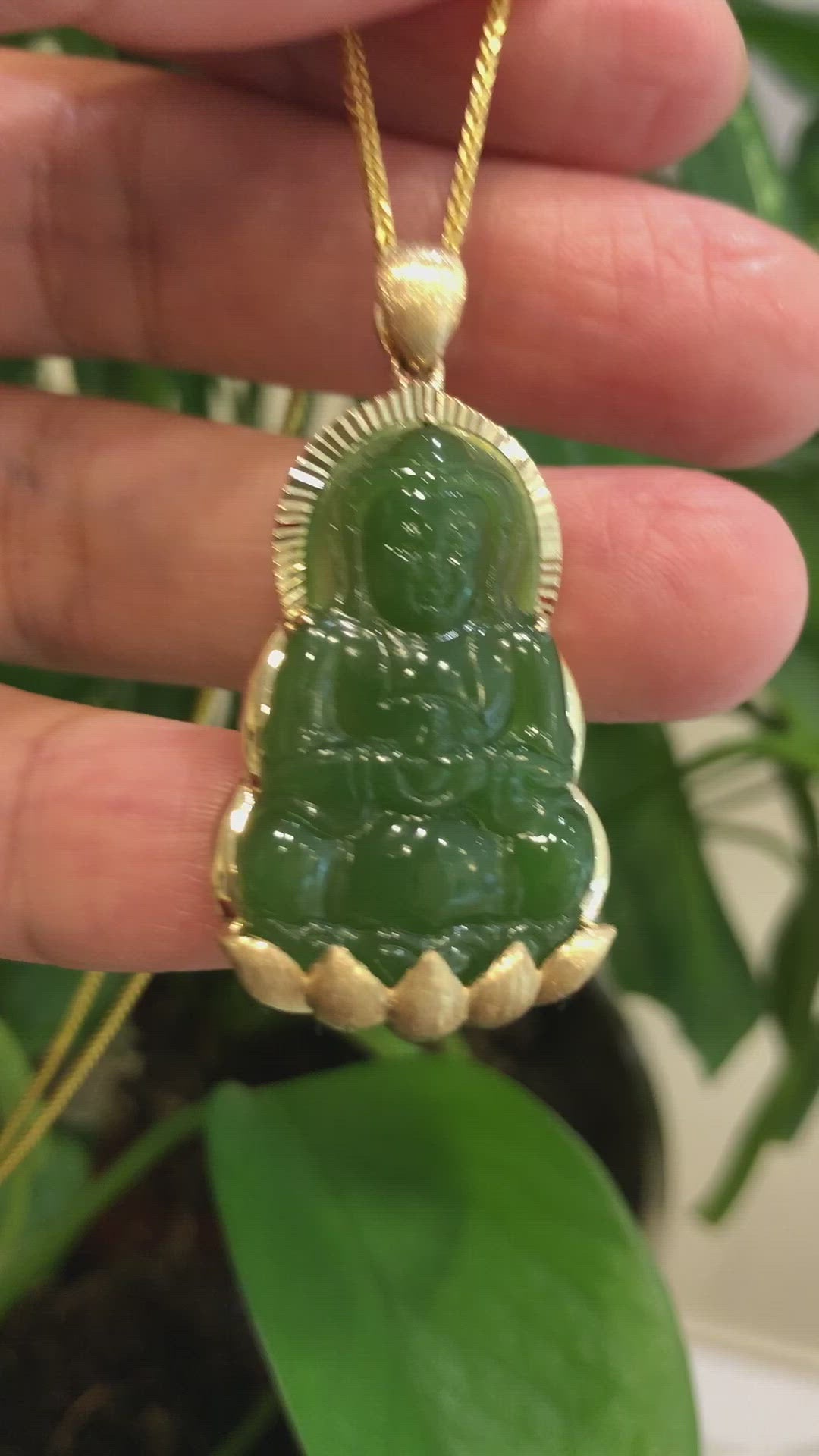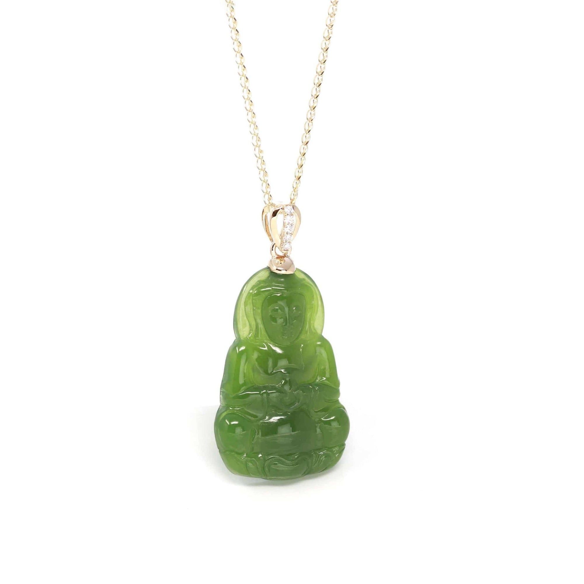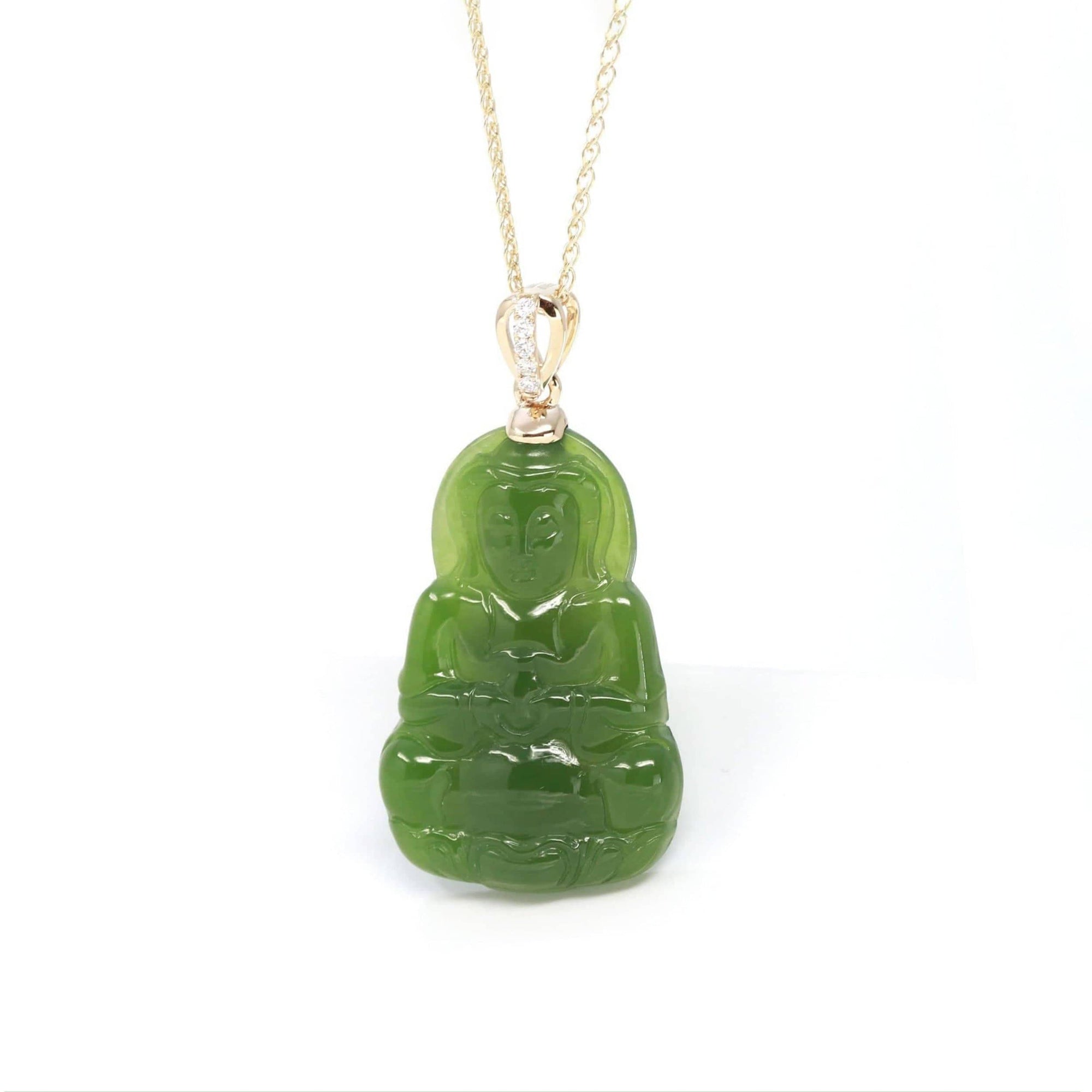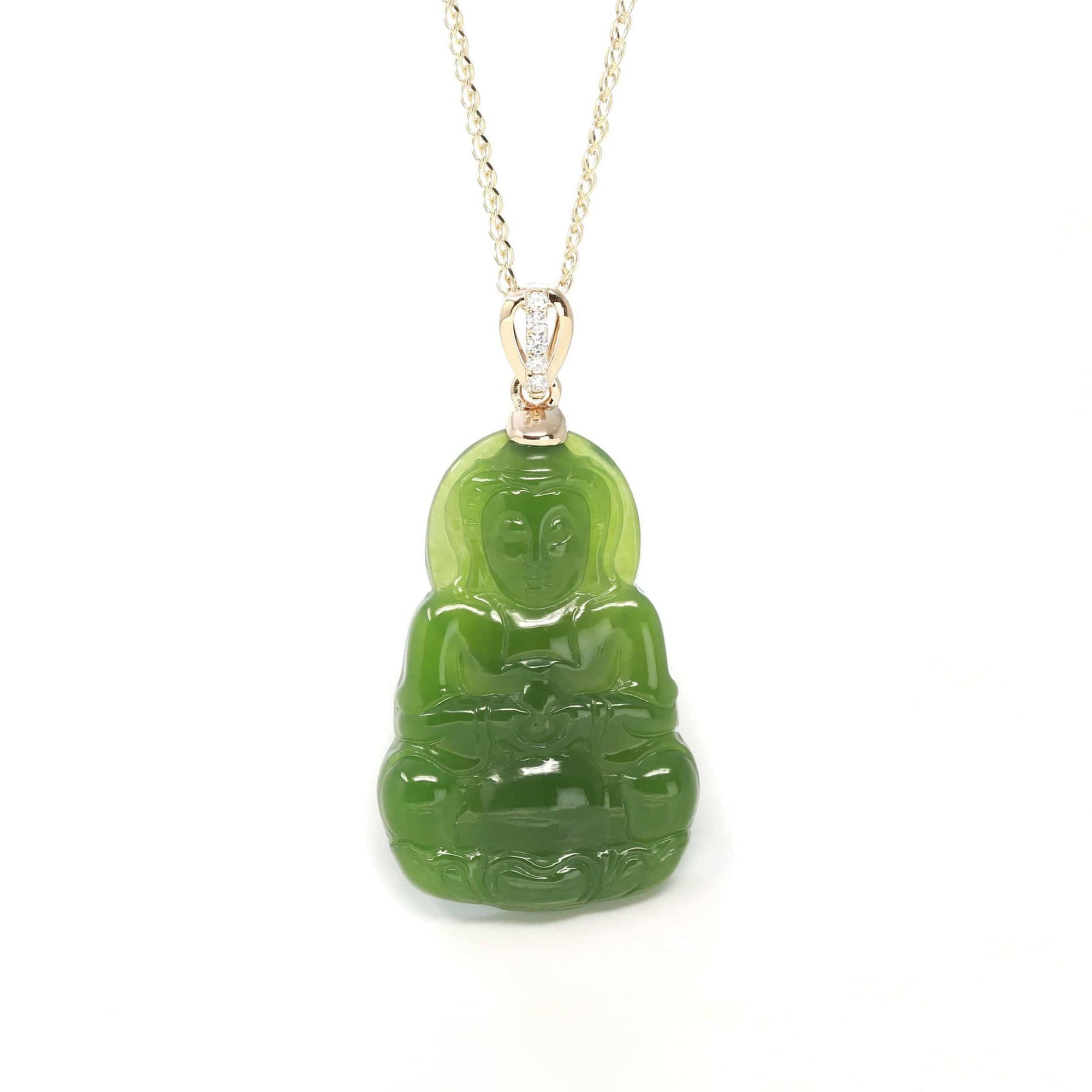 Baikalla™14K Yellow Gold Genuine Nephrite Green Jade GuanYin Baby Buddha Pendant Necklace