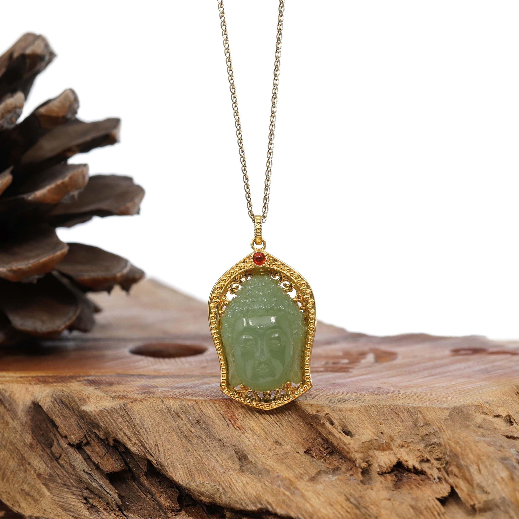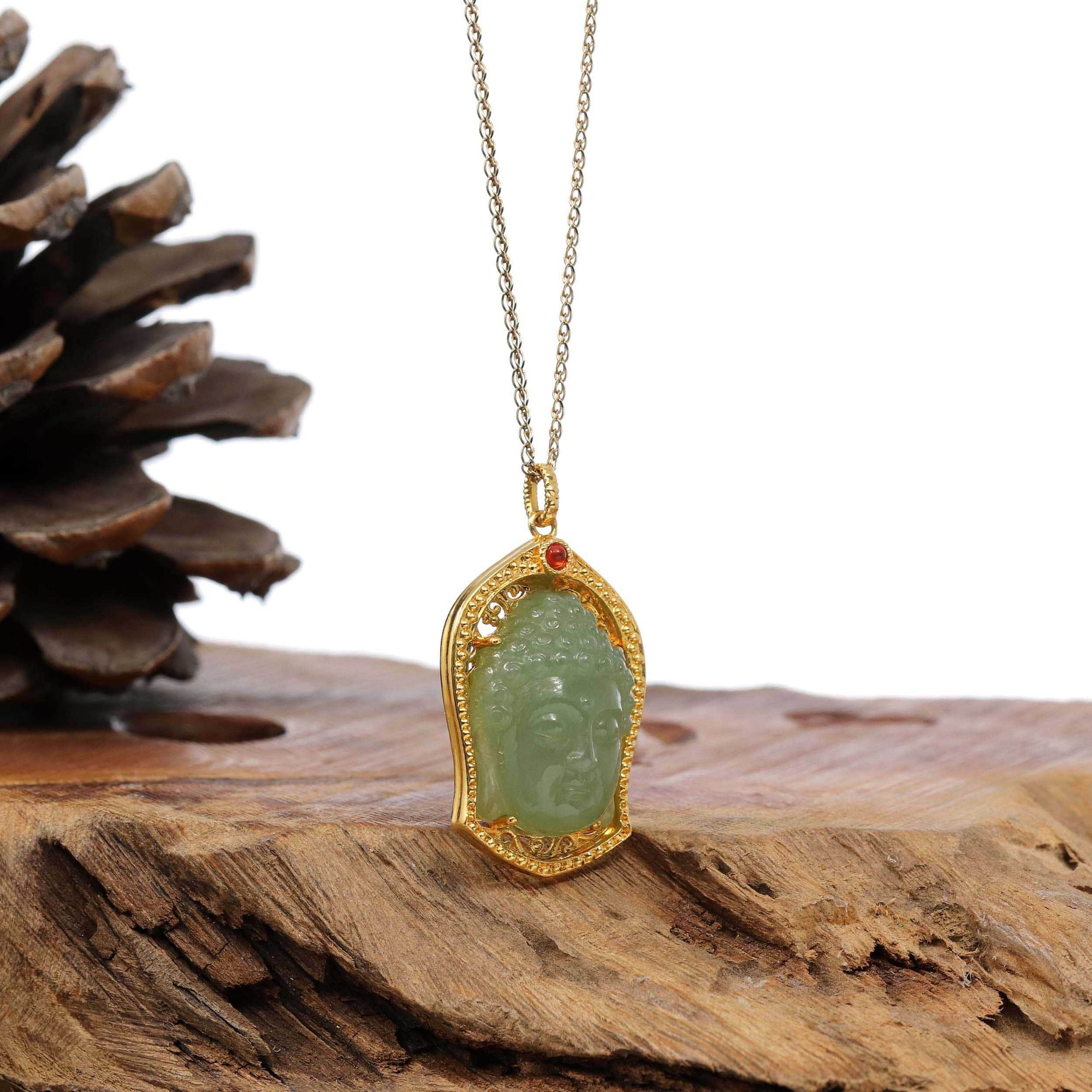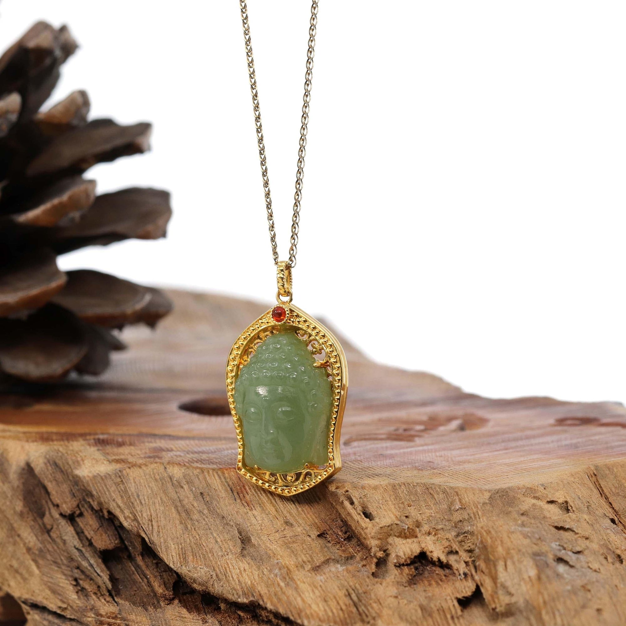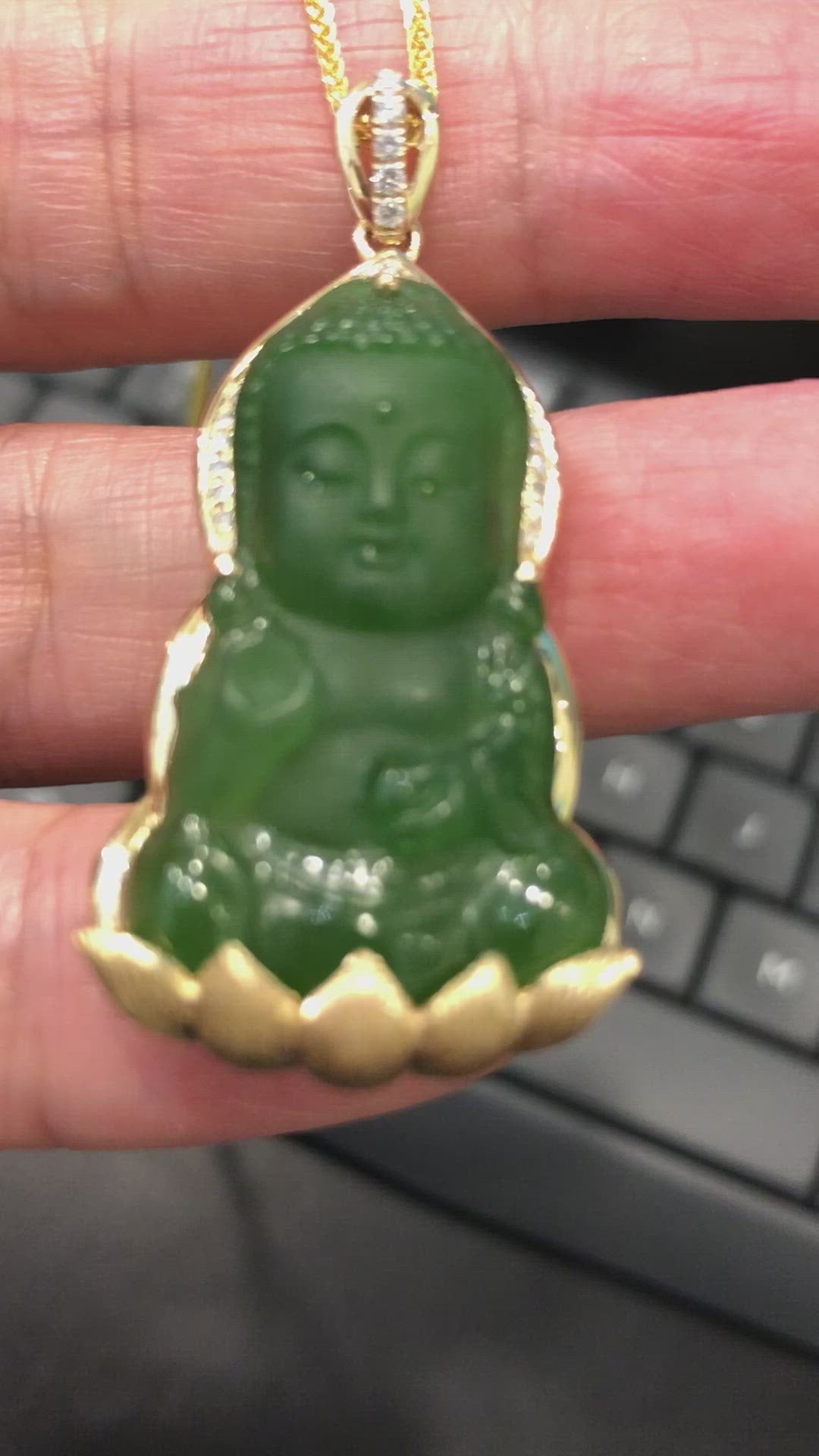 Baikalla™14K Yellow Gold Genuine Nephrite Green Jade GuanYin Baby Buddha Pendant Necklace