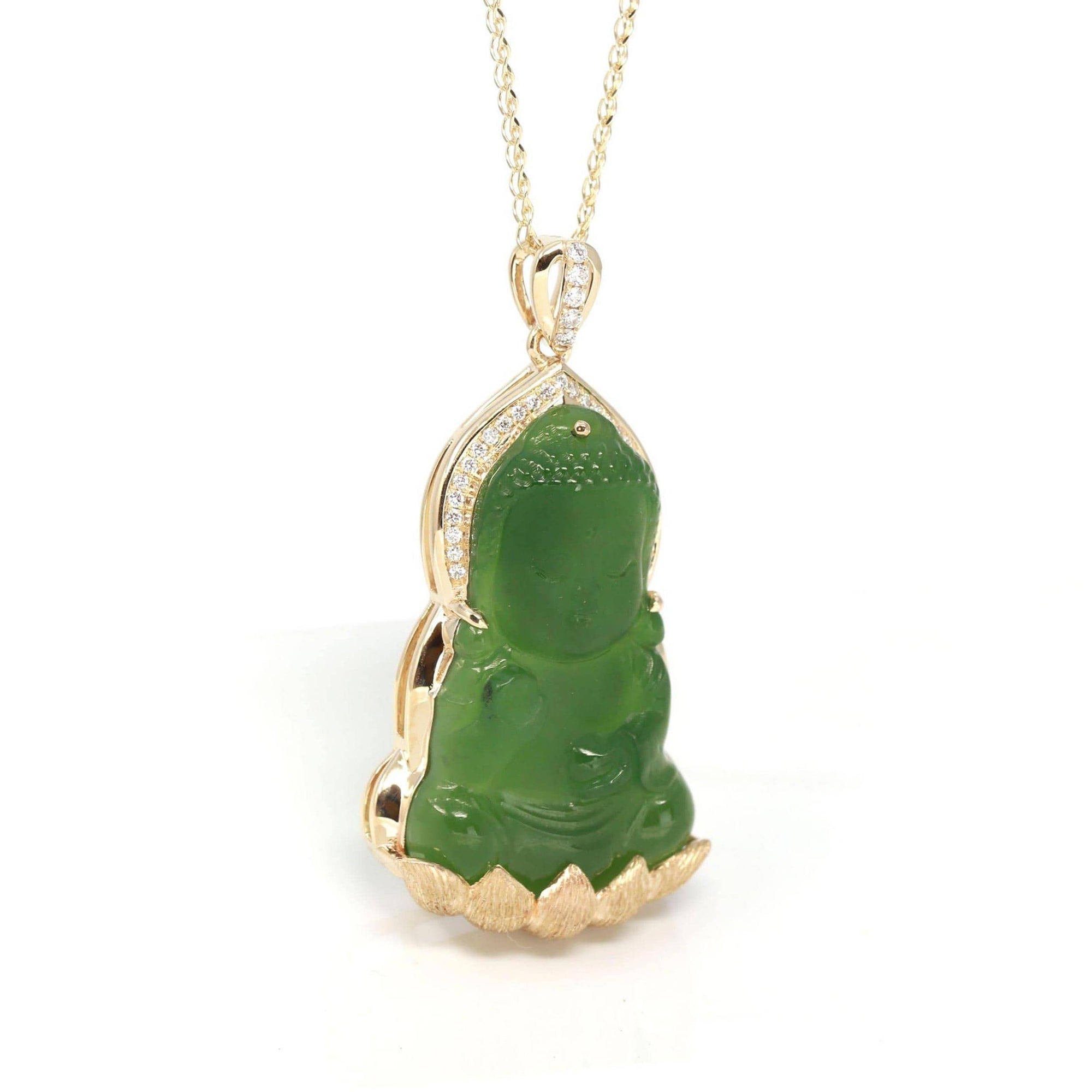 Baikalla™ "Laughing Buddha" 14k Gold Genuine Nephrite Apple Green Jade with VS1 Diamonds High-end Collectable