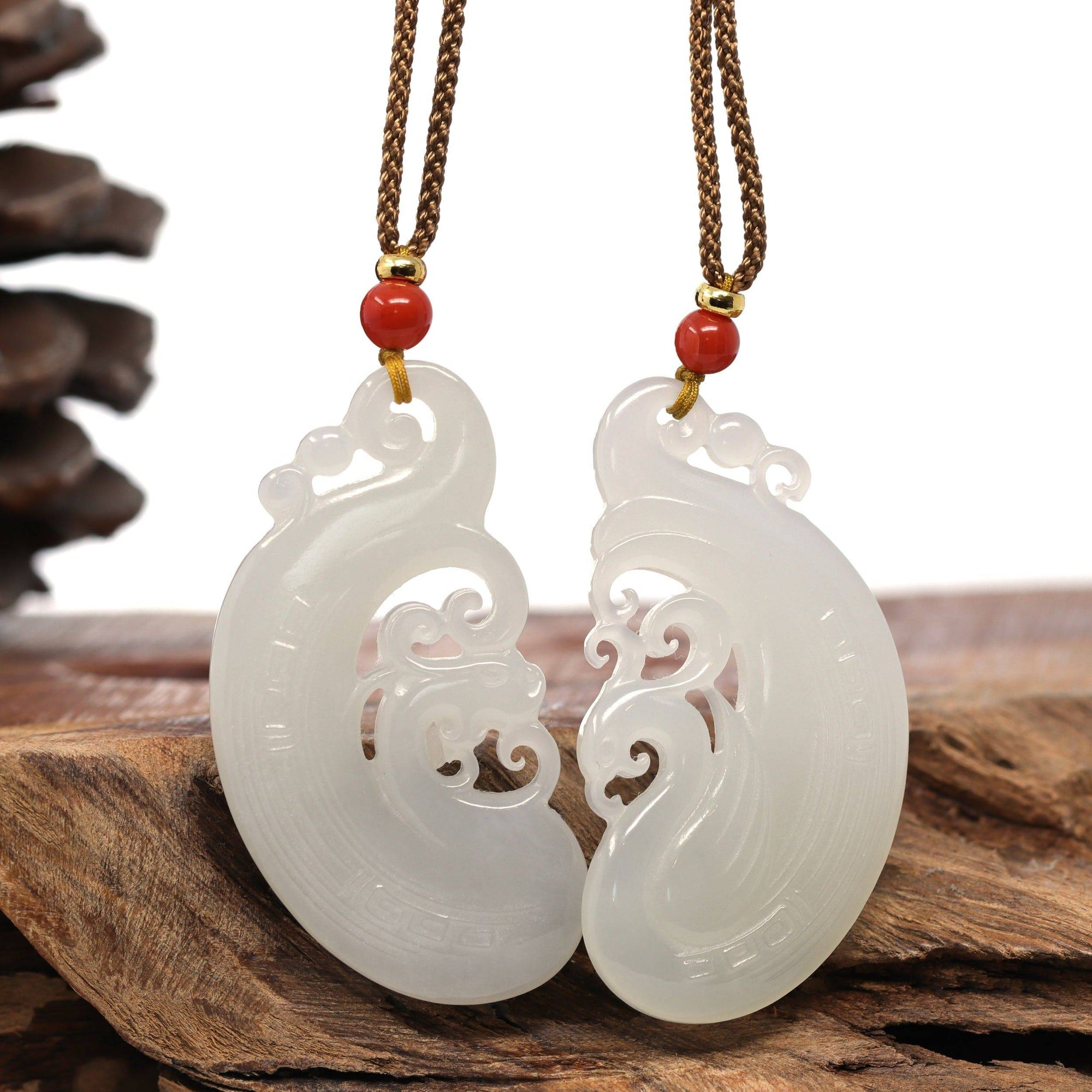 Baikalla™ "Classic Dragon & Phoenix" Genuine HeTian White Nephrite Jade LongFeng Pendant Necklace