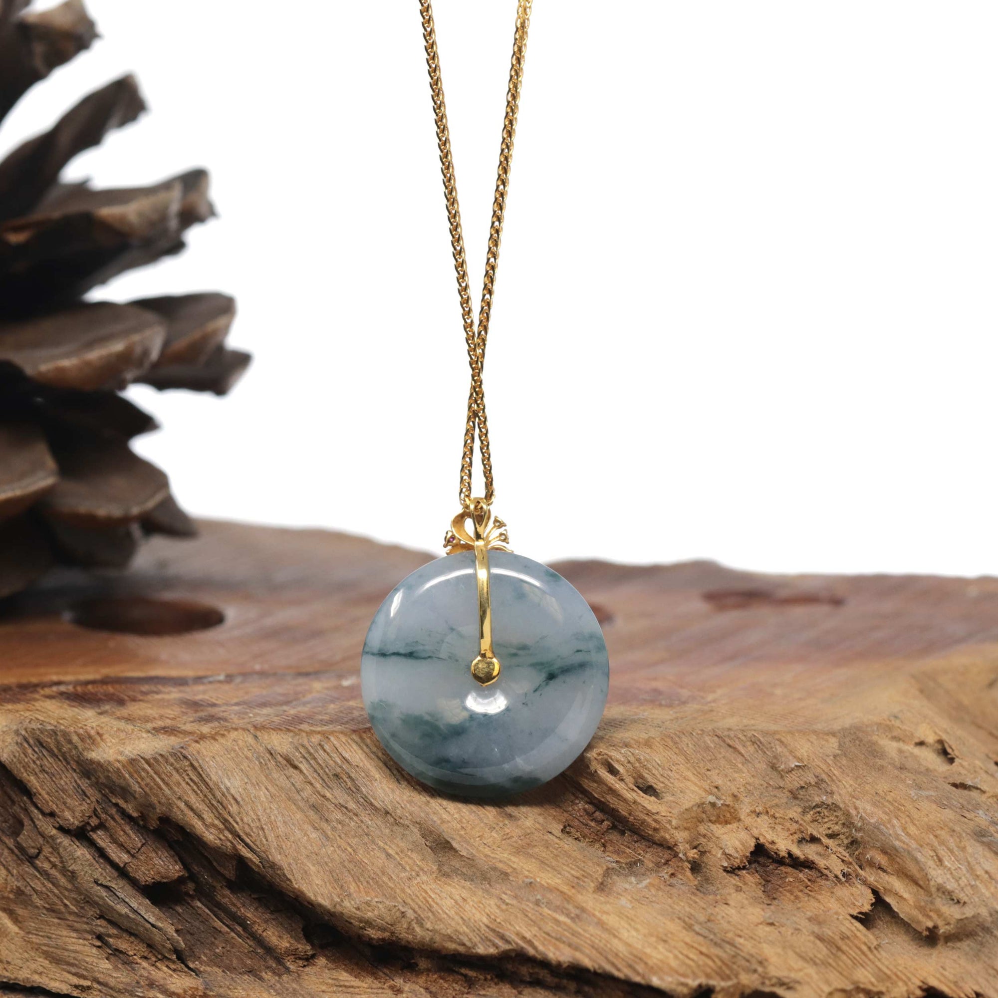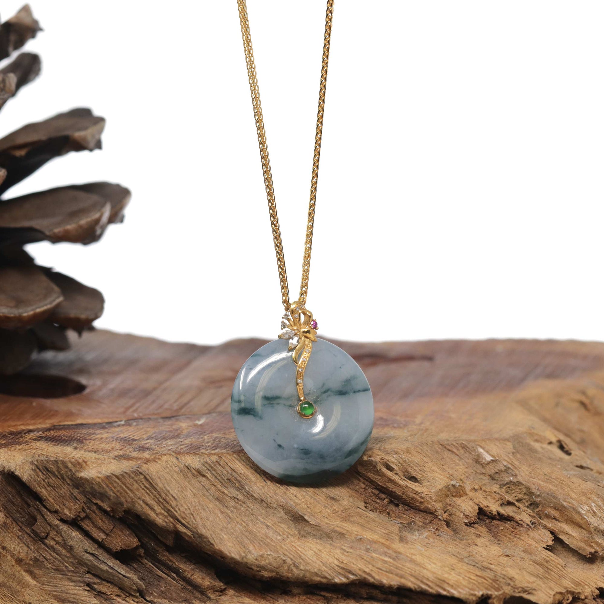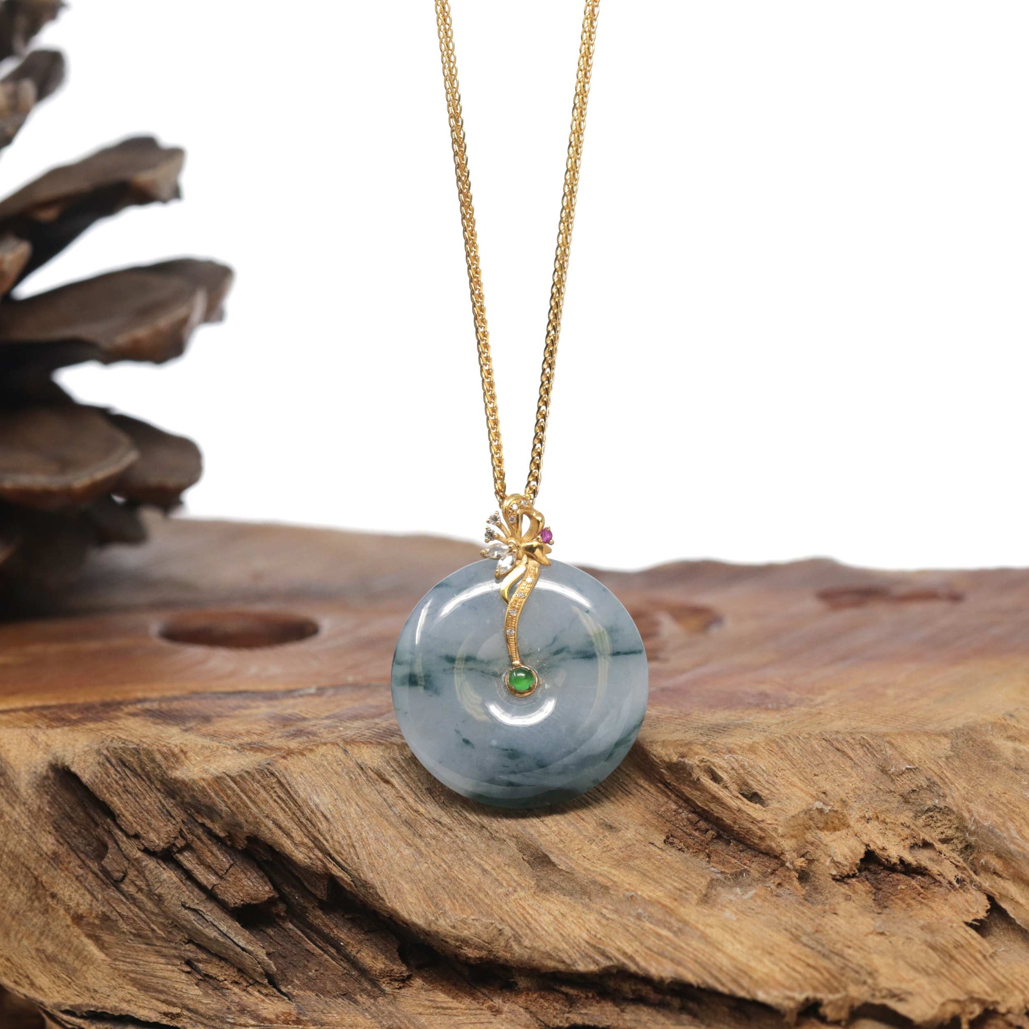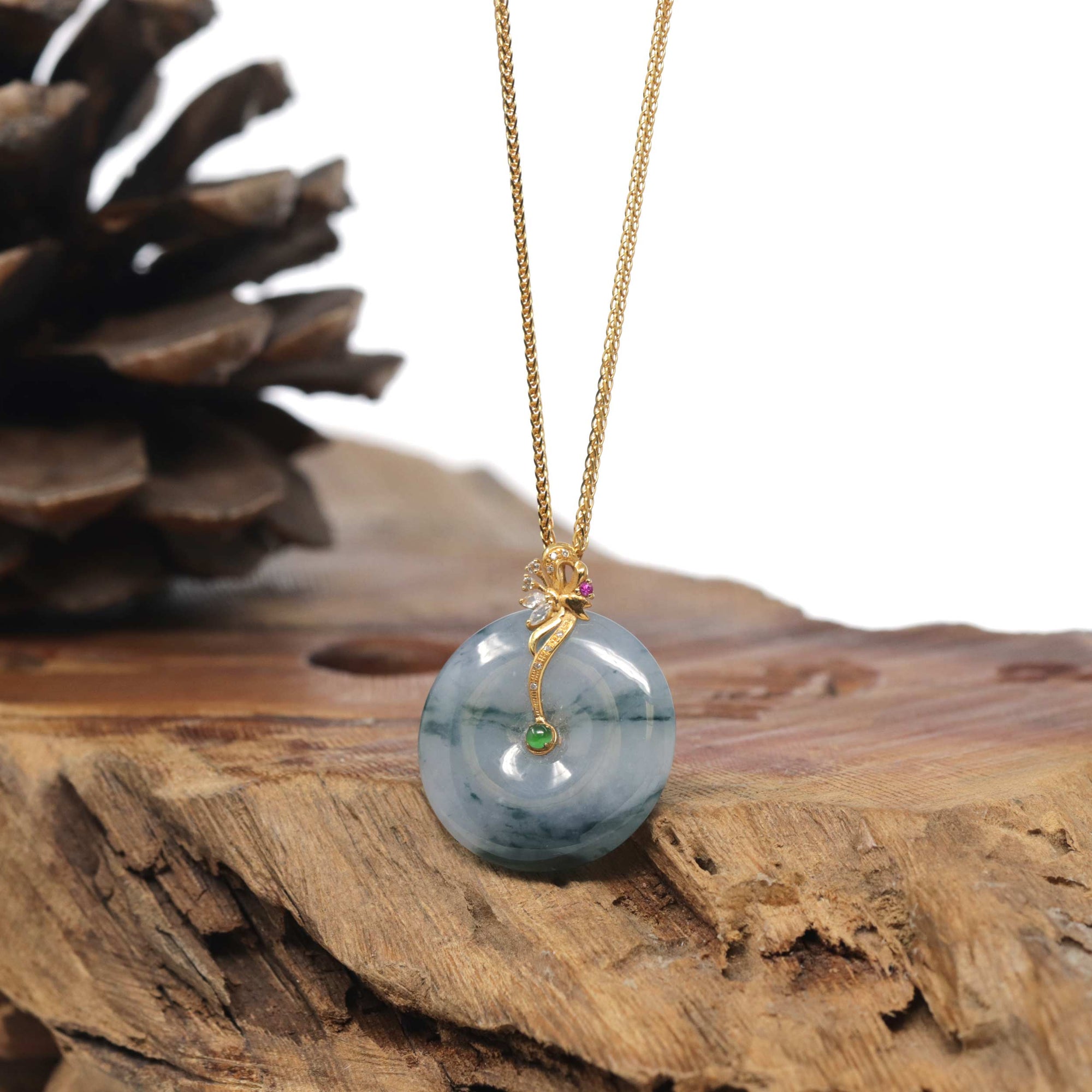 Baikalla 18K Yellow Gold "Ping An Kou" (Good Luck Button) Natural Deep Blue-Green Flower Jadeite Jade Pendant W/ Natural Diamonds & Ruby