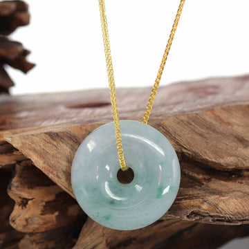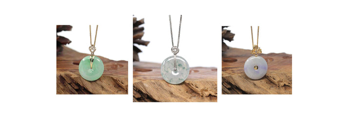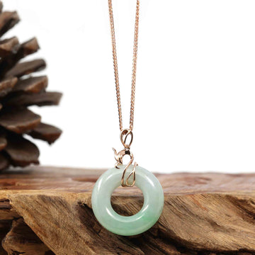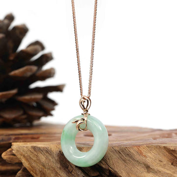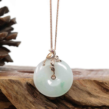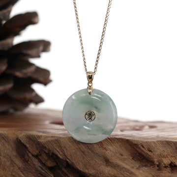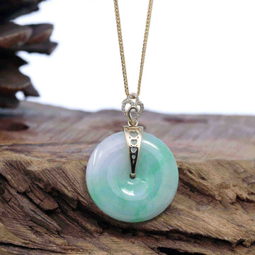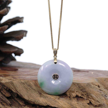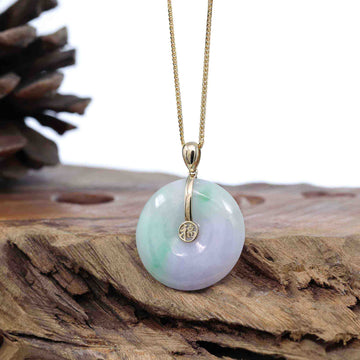 18K Yellow Gold "Good Luck Button" Necklace Lavender Green Jadeite Jade Pendant Necklace