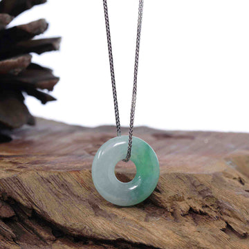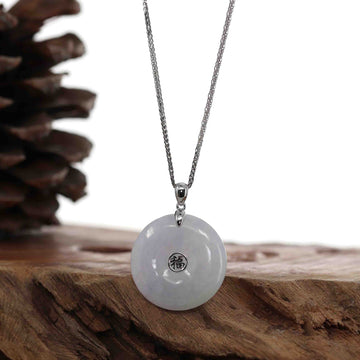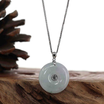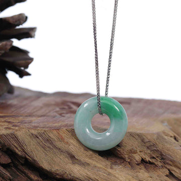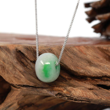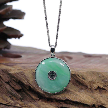 18K White Gold "Good Luck Button" Necklace Icy Green Jadeite Jade Pendant Necklace