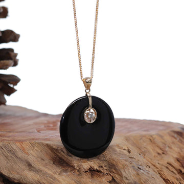 18K Yellow Gold "Good Luck Button" Necklace Forest Green Jadeite Jade Pendant Necklace