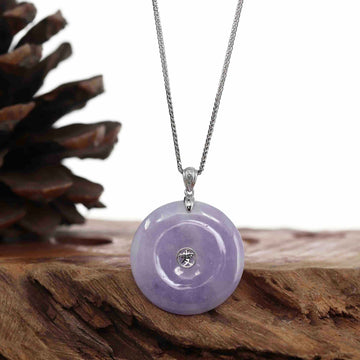 "Good Luck Button" Lavender Jadeite Jade Lucky KouKou Pendant W/ 14K White Gold Diamond Bail