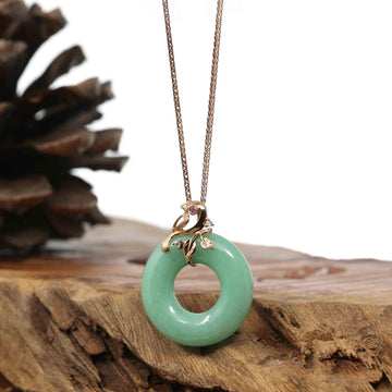 Baikalla™ "Good Luck Birdie" 18k Rose Gold Genuine Burmese Jadeite Lucky Kou Kou Pendant Necklace With Ruby and Diamond