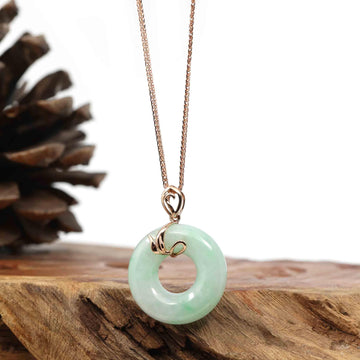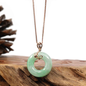 Baikalla Apple Green "Ping An Kou" (Good Luck Button) Genuine Burmese Jadeite Pendant W/ 18k Rose Gold Bail W/ Diamonds and Ruby