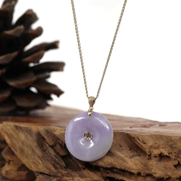 Baikalla Icy & Vibrant Lavender "Ping An Kou" (Good Luck Button) Genuine Burmese Jadeite Jade Pendant W/ 18K Yellow Gold Bail & Diamonds