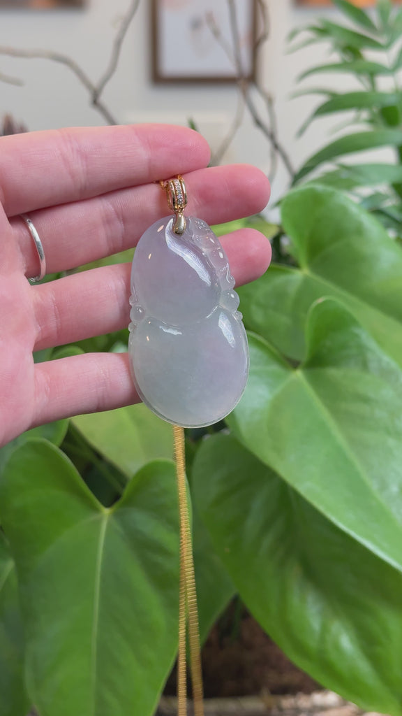 *Design concept-- The "Lucky Bottle Gourd," called "Hulu" in Chinese, is a timeless symbol of good luck. This necklace features a one-of-a-kind pendant made from icy lavender jadeite jade with a smooth, ice-like texture. The classic carving has a simple and elegant style. With its larger size, this unique piece makes a perfect and deep meaning gift for yourself or a loved one.