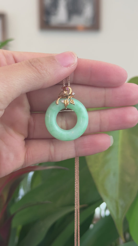 * DESIGN CONCEPT--- 18k Rose Gold & Genuine Burmese Jadeite Pendant Necklace, featuring AA Ruby and Diamond accents. Crafted from high-quality genuine jadeite, this pendant boasts a flawless surface and mesmerizing translucent with green & yellowish colors. The design showcases a symbol of good fortune—a bird standing on the auspicious "Circle of Heaven," symbolizing prosperity, luck, and safety. It's the perfect gift for yourself or someone special.