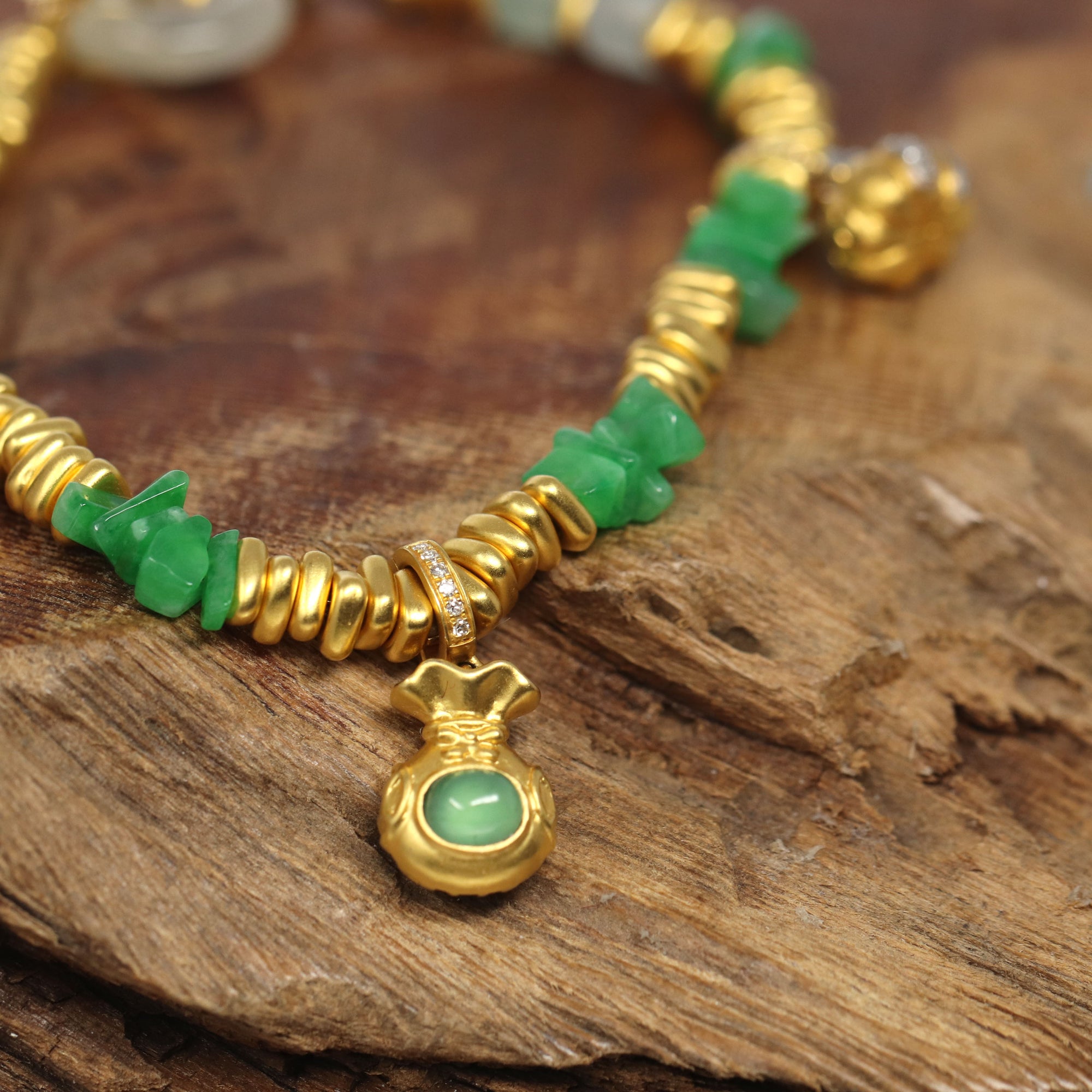 * DESIGN CONCEPT---  This beautiful bracelet features pure gold nugget beads, known as "The Money for Journey," along with imperial jade and unique charms like a money bag, pumpkin, ice lotus pad and ice koukou with clasp. It's so cute.  It symbolizes life, prosperity, and good fortune. The jadeite has a high quality perfect texture, and every detail is exquisite. A truly special gift for yourself or a loved one.