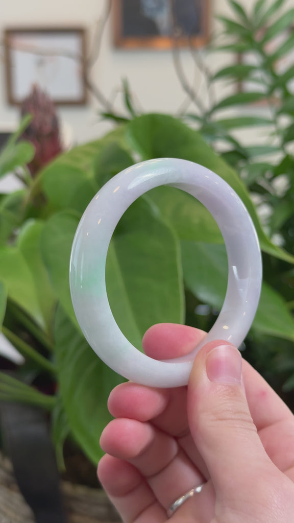* DETAILS--- This jade bangle is made from high-quality genuine Burmese green Jadeite jade. It has a translucent texture with beautiful green and lavender colors, creating a stunning look. The classic half-round design is elegant, with hints of cloud-like patterns inside. The bangle features vibrant green patches and multiple colors, making it a unique and special gift for you and someone you love. It’s also a great collectible item.