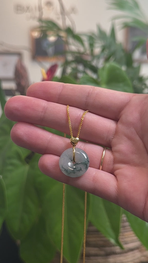 Design Concept--- The Ping An Kou (Good Luck Button) is a Chinese symbol of peace, protection and well-being, believed to ward off negative energy and bring good fortune. This necklace is made with very high-quality genuine Burmese green jadeite jade that has a translucent icy texture with blue-green color and flowers throughout. The bail is crafted in an 18K yellow solid gold heart design. Gifting one of these is like wishing the best of luck to your family or loved ones. It's a significant gift.