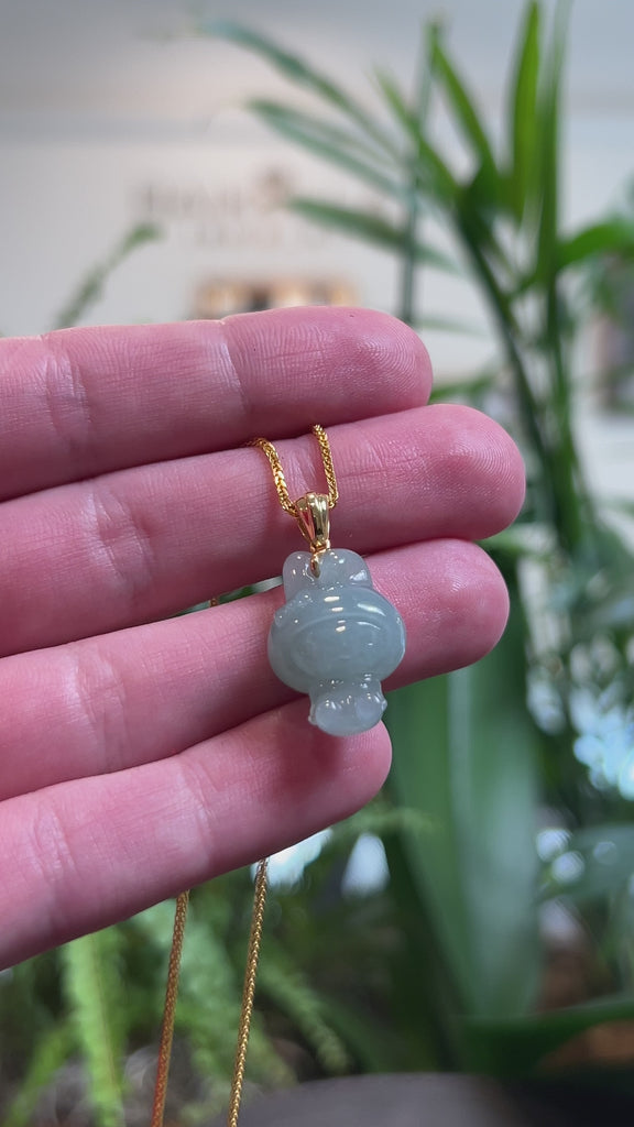 * Design Concept--- Introducing our unique and charming natural Burmese jadeite jade pendant carved into a "Joy Bunny". The jade features an icy green color throughout with a smooth and translucent texture. The pendant is finished with a simple 18k yellow gold bail. The intricate details of Joy Bunny's adorable face and signature bow add a touch of whimsy and fun to this already remarkable piece. Jadeite jade is known for its durability, also believed to bring good luck. This pendant is perfect for any Joy Bunny enthusiast or collector of unique jewelry.