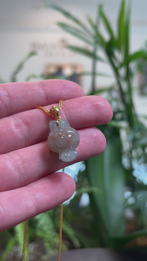 * Design Concept--- Introducing our unique and charming natural Burmese jadeite jade pendant carved into a "Joy Bunny". The jade features an icy green color with red flowers throughout. The pendant is finished with a simple 18k yellow gold bail. The intricate details of Joy Bunny's adorable face and signature bow add a touch of whimsy and fun to this already remarkable piece. Jadeite jade is known for its durability, also believed to bring good luck. This pendant is perfect for any Joy Bunny enthusiast or collector of unique jewelry.