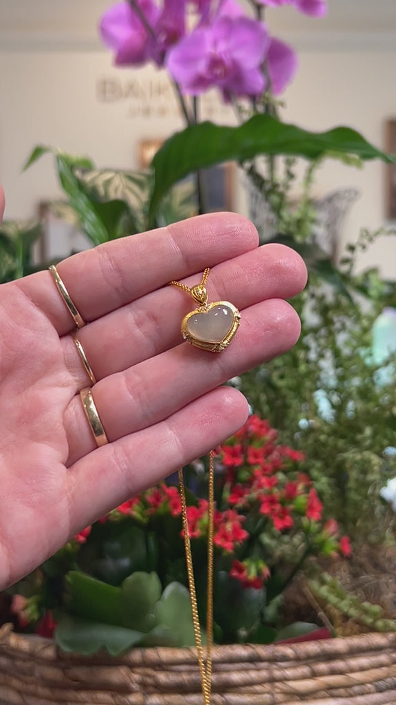 The pendant is set in solid 18K yellow gold and finished with a Florentine texture, creating a subtle, hand-engraved shimmer that adds depth and warmth to the gold. The setting is beautifully accented with natural diamonds. A polished finish 18K yellow gold bail, dazzled with natural diamonds, adds refined brilliance and contrasts beautifully against the textured setting. The heart silhouette symbolizes love, harmony, and good fortune, making this piece both meaningful and timeless.
