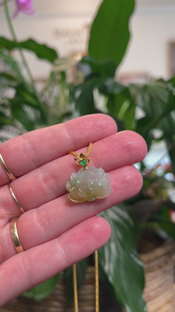 * Design Concept--- This lotus flower carving pendant is crafted from genuine, natural Burmese jadeite jade featuring an icy light green and light yellow color blend throughout with vibrant green patches and a yellow Sajin (Golden Dust) flower patch. The jade’s texture is smooth and translucent with minimal natural lines and cloudy spots. The pendant is beautifully finished with a solid 18k yellow gold bail, accented with two red ruby's and a luminous imperial green jade cabochon at the center. The lotus flower is a timeless symbol, representing purity, resilience, and flourishing through challenges. Elegant and meaningful, this pendant makes a thoughtful gift for yourself or someone special.