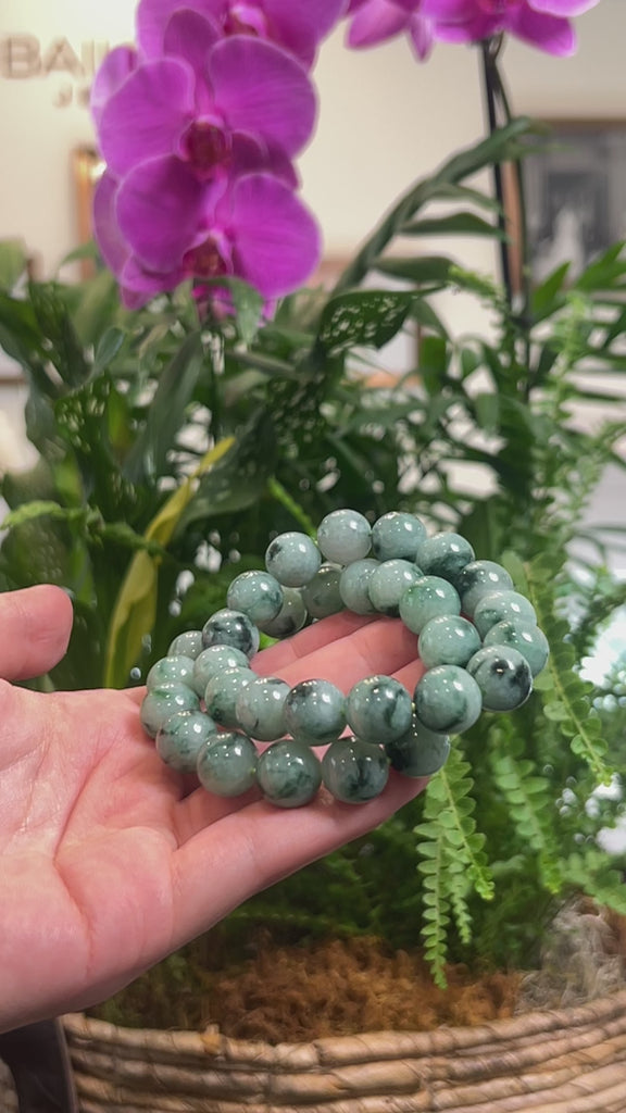 * DETAILS---This bracelet is made with fine quality, genuine Burmese jadeite jade beads in a white-green base color with a blend of dark and vibrant blue-green flowers throughout. The jade texture is so smooth and translucent. Known for its durability, jadeite is also believed to bring good luck. Whether as a gift for yourself or a loved one, this jade beaded bracelet is a meaningful piece.
